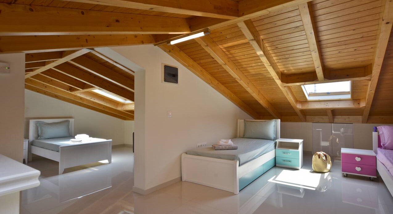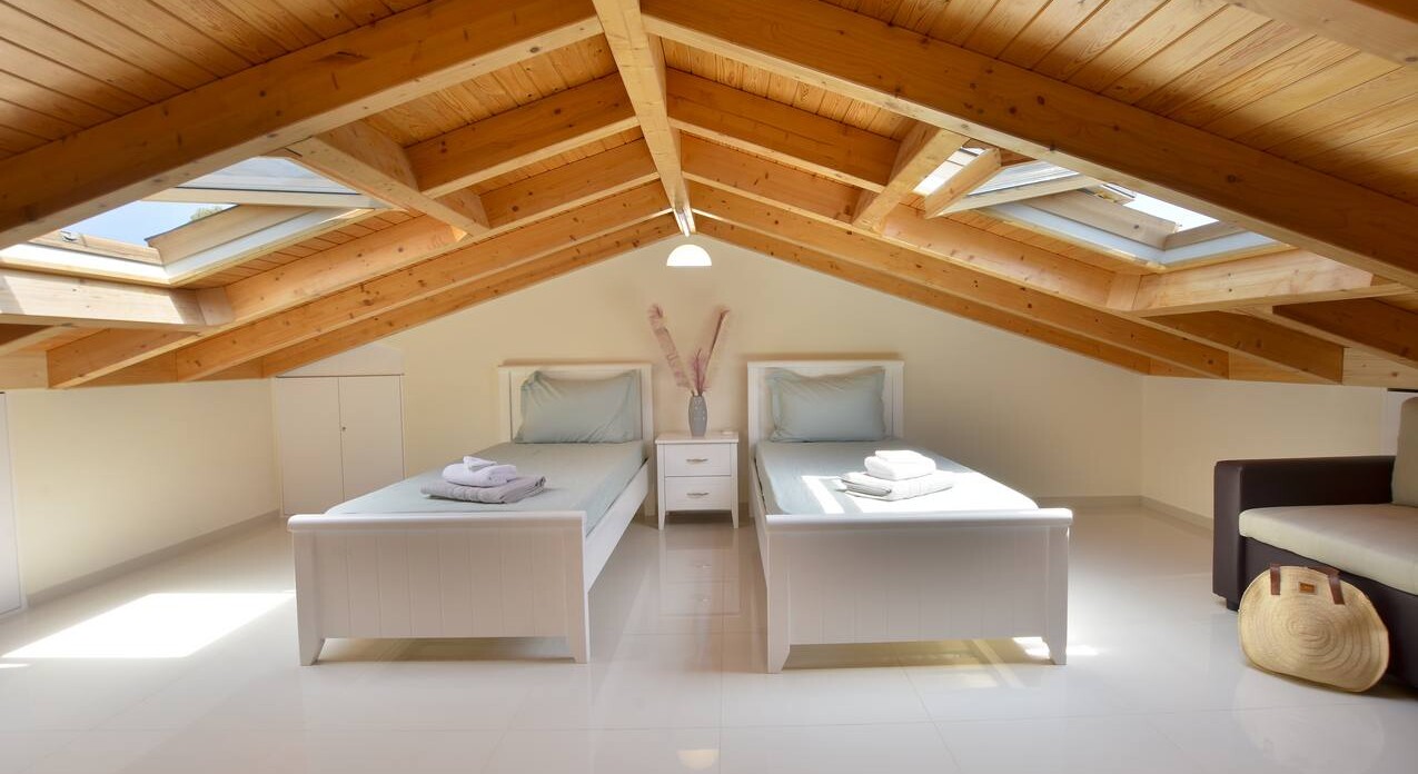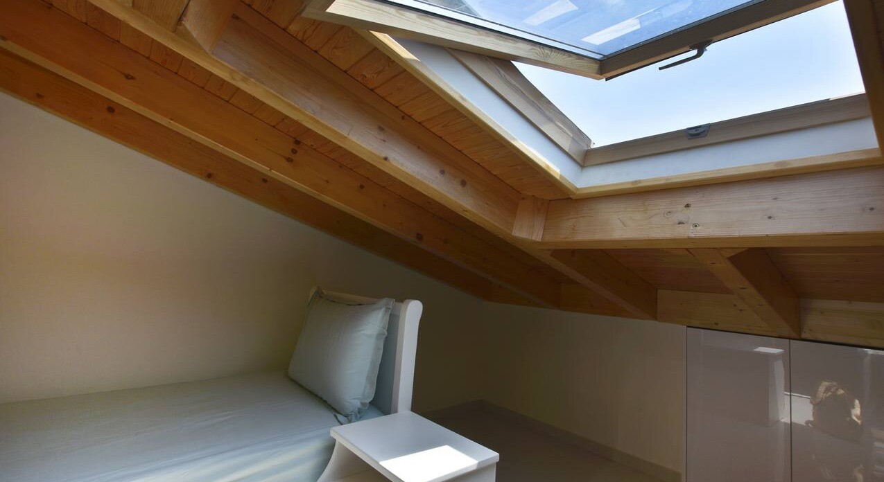A wooden staircase in the hallway provides access to the attic space, which offers the potential for two additional bedrooms. This level also includes a shower room, and skylight windows ensure ample natural light.