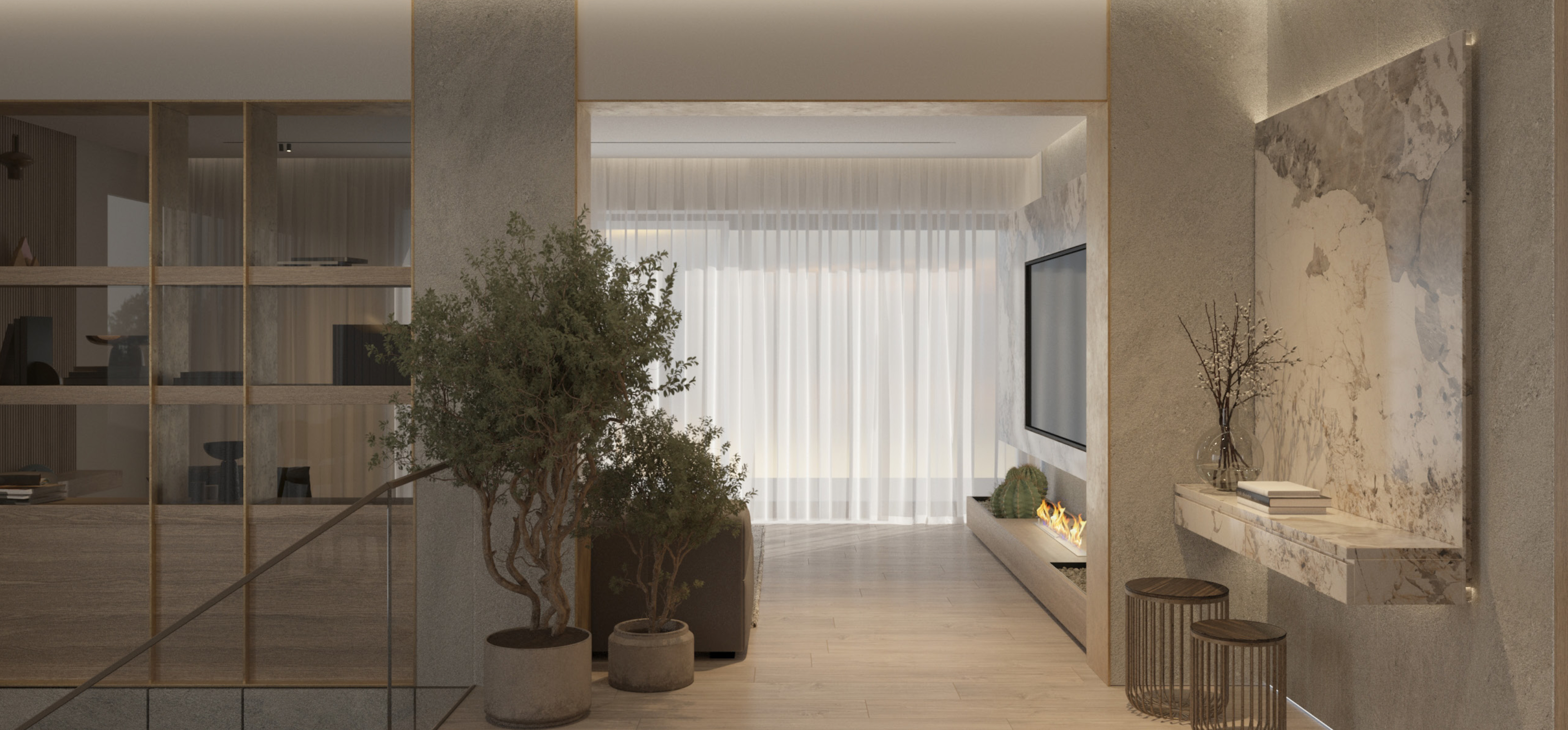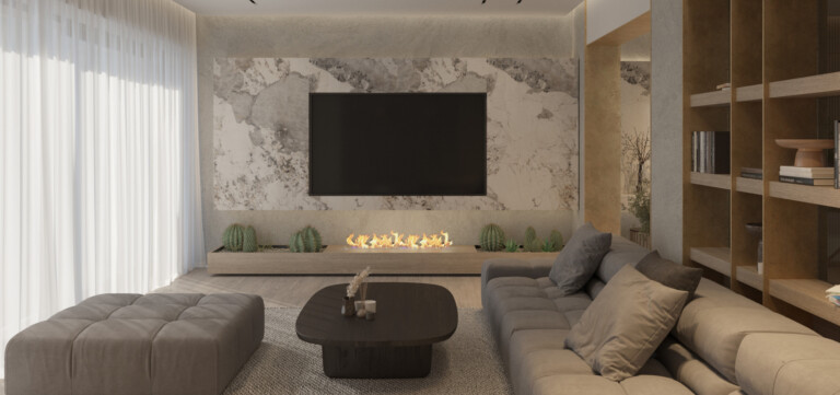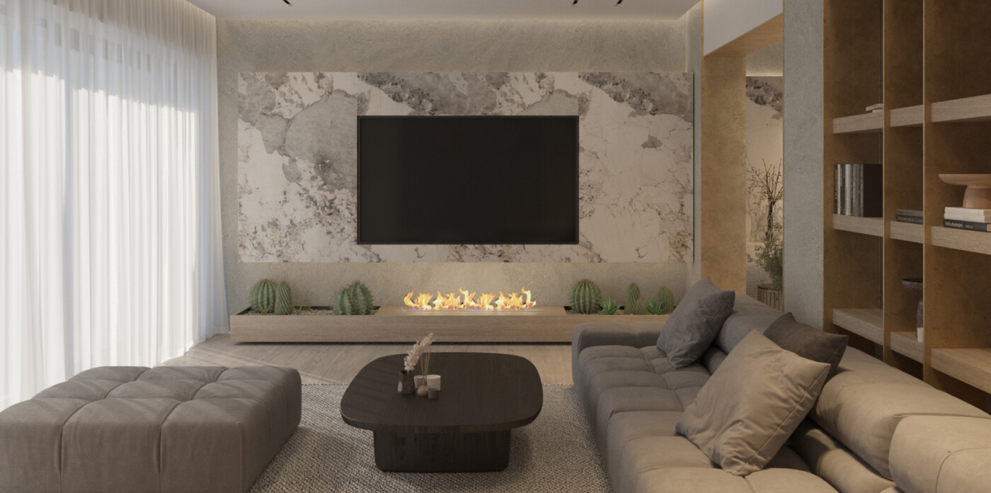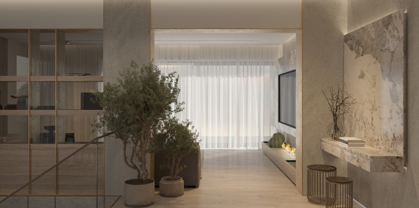 The open-plan living areas are situated on the third floor and comprise a generous living room, along with a modern kitchen and dining area. The layout creates a natural sense of flow throughout the space, while a large open fireplace serves as a central feature, particularly during the winter months.