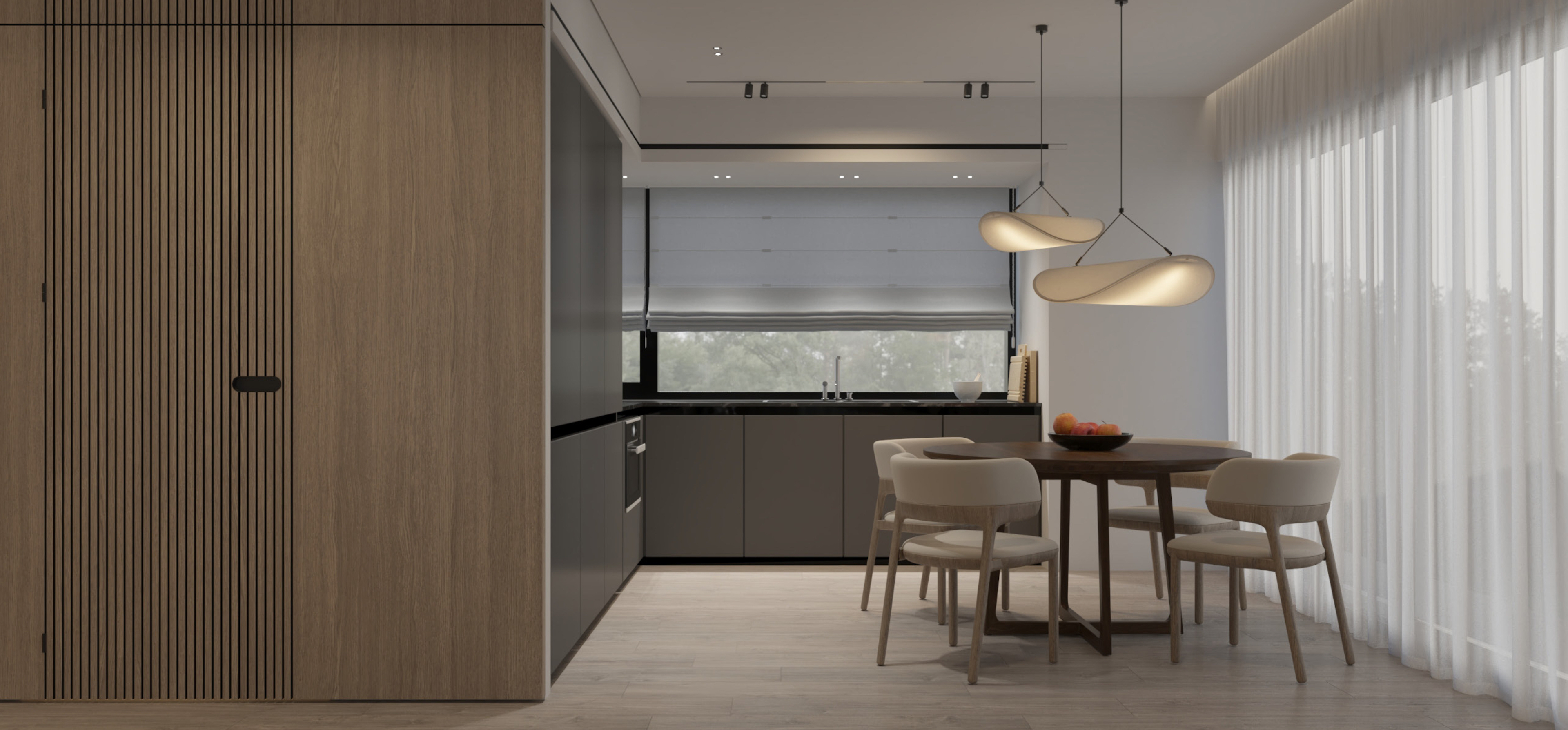 Large sliding windows introduce natural light into the interiors, maintaining a strong connection to the surrounding setting.