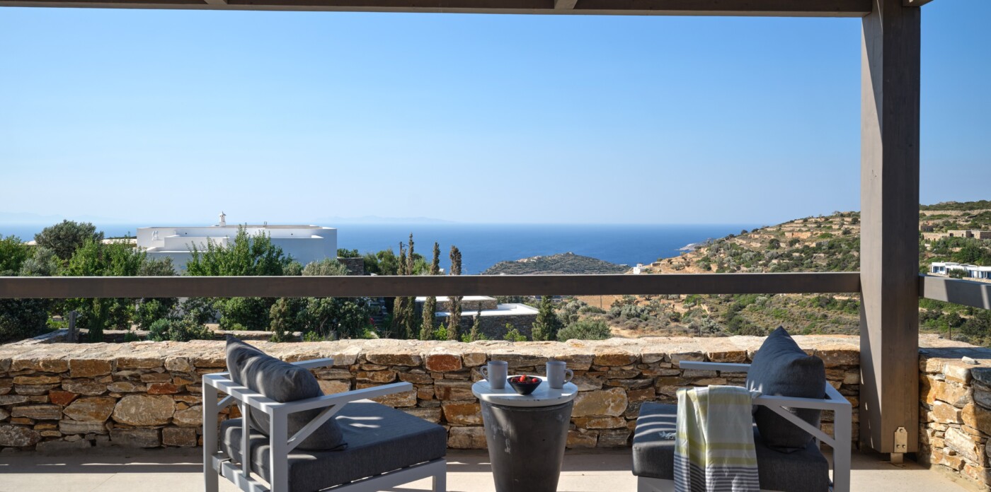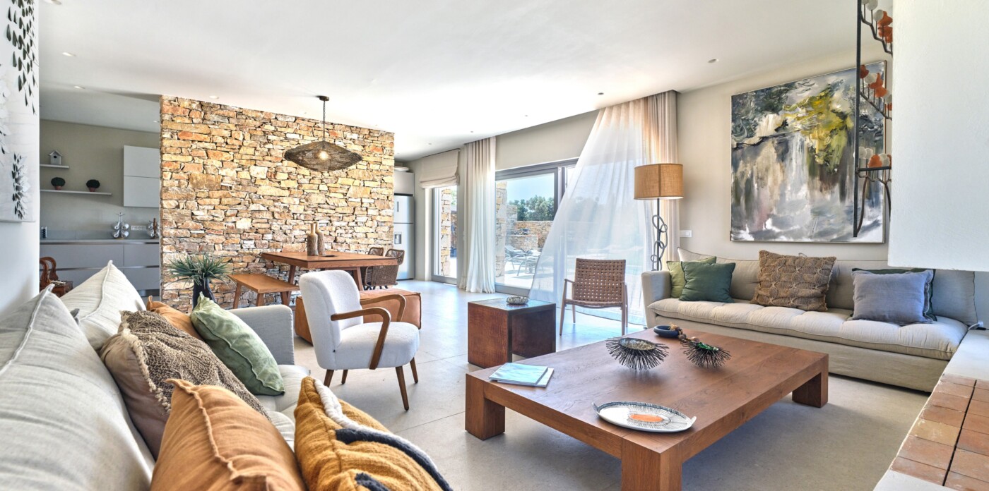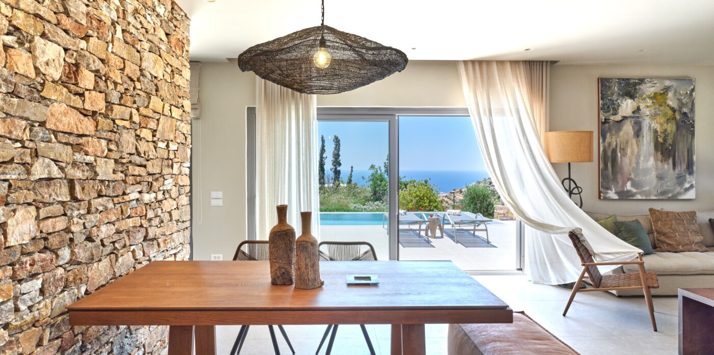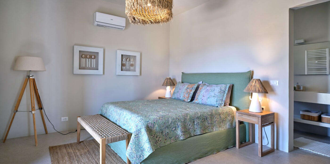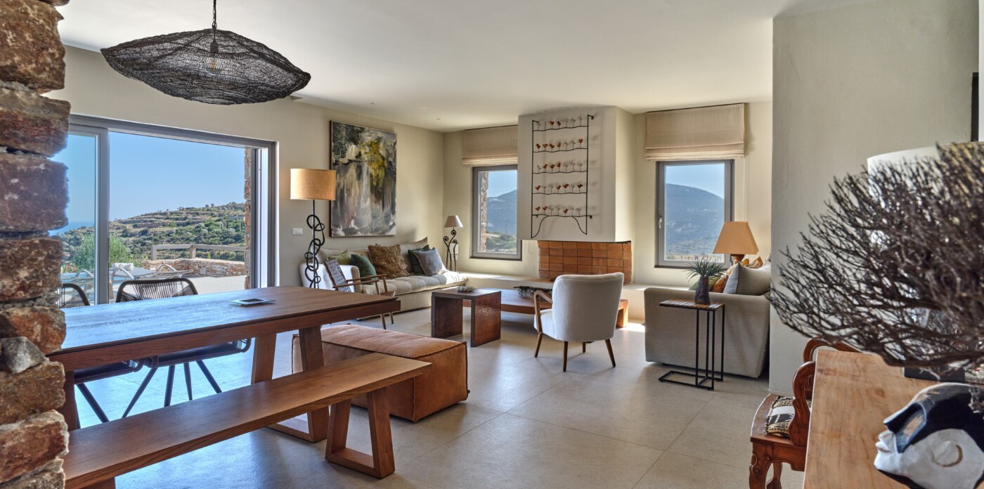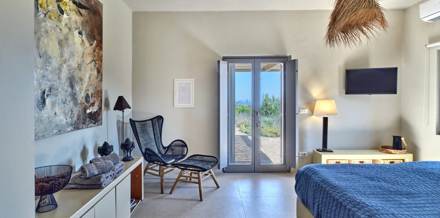 Diinera masterfully blends traditional island architecture with contemporary enhancements. It features five spacious bedrooms within the main residence and two independent guesthouses, providing ideal accommodation for friends and family with utmost privacy and comfort. Every interior space is bright and inviting, showcasing high-end finishes and designed to perfectly frame the sea and countryside views.
