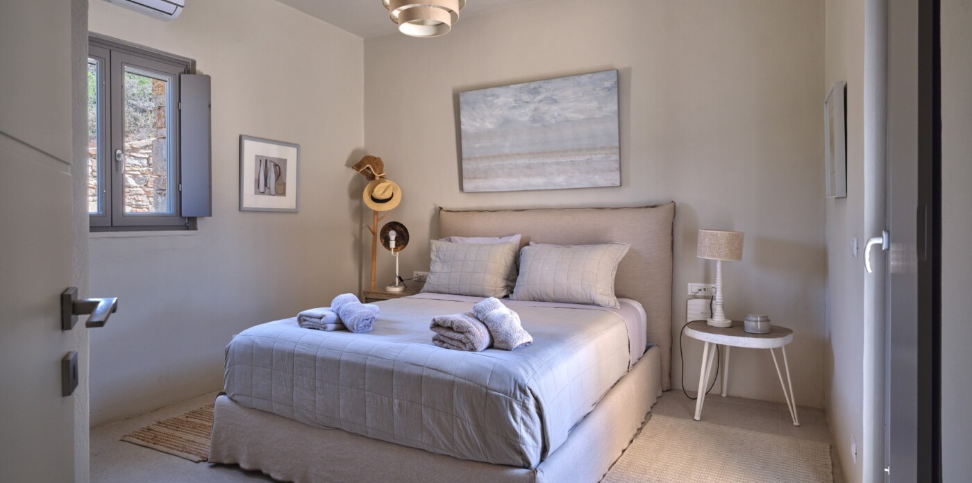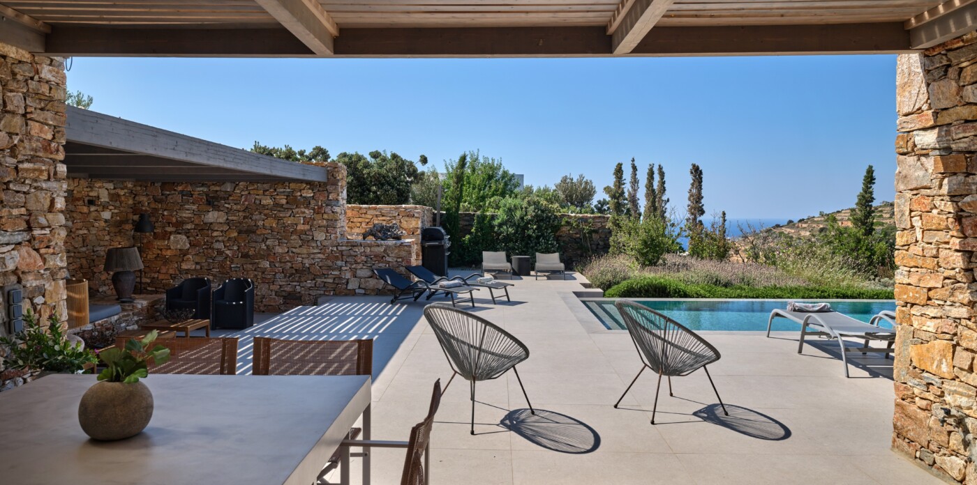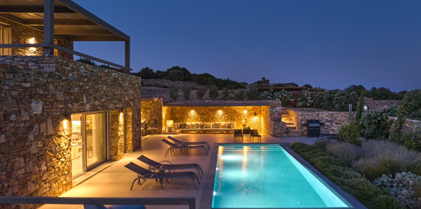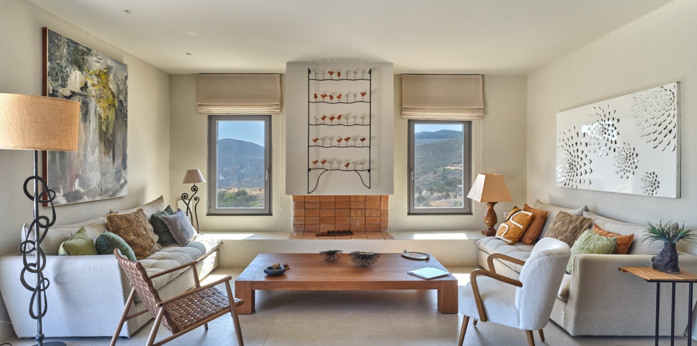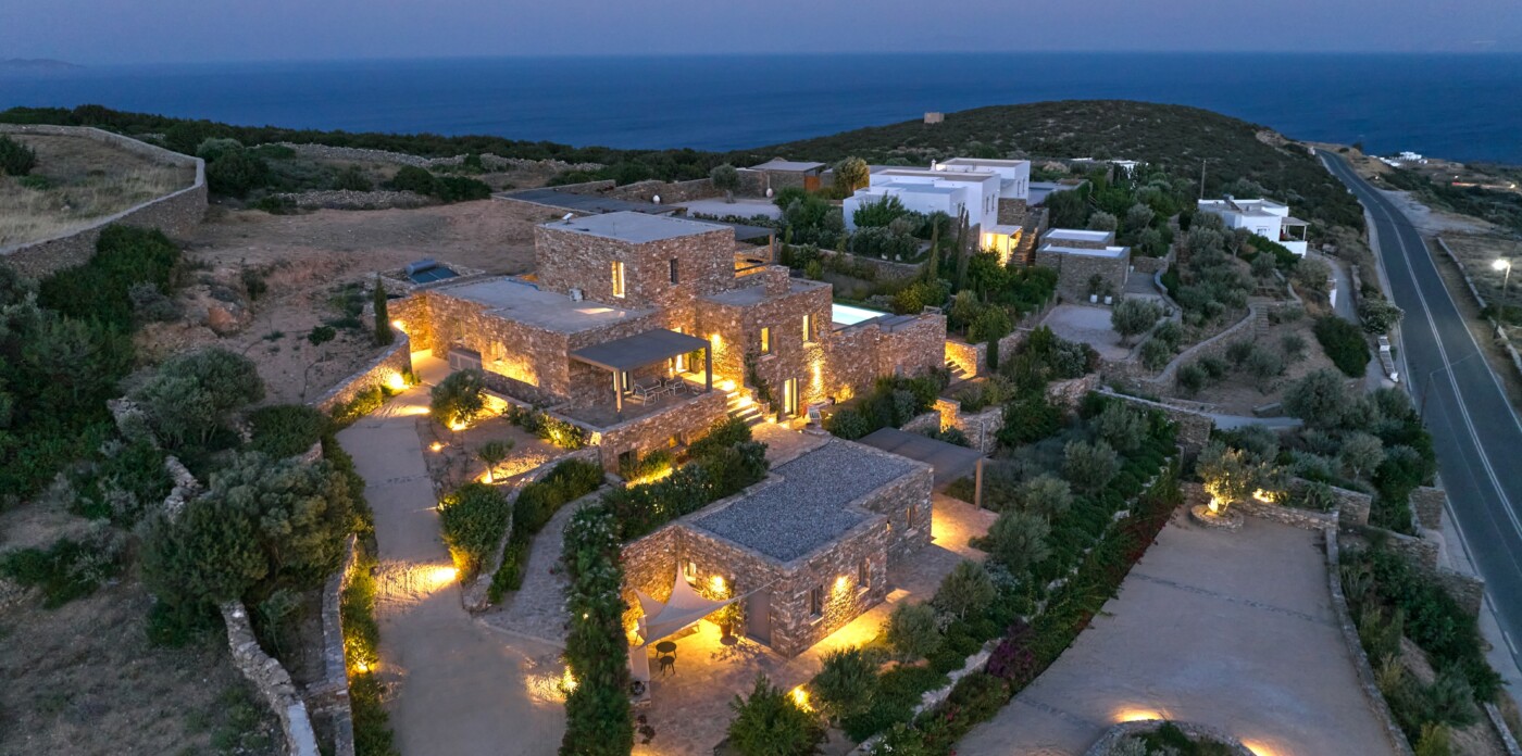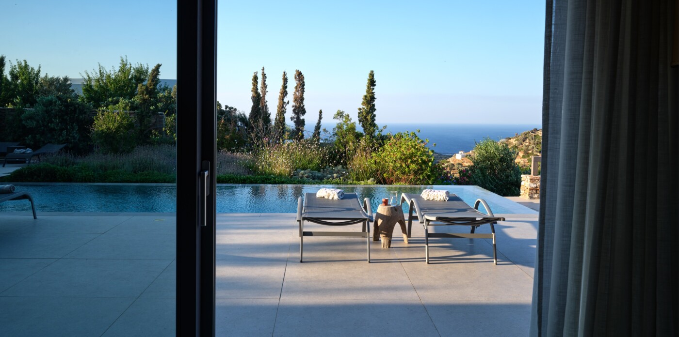 Diinera masterfully blends traditional island architecture with contemporary enhancements. It features five spacious bedrooms within the main residence and two independent guesthouses, providing ideal accommodation for friends and family with utmost privacy and comfort. Every interior space is bright and inviting, showcasing high-end finishes and designed to perfectly frame the sea and countryside views.