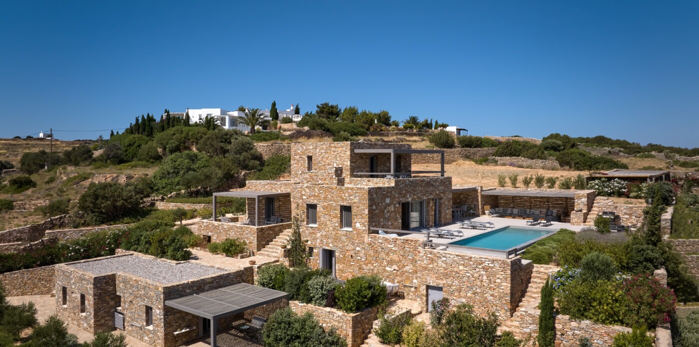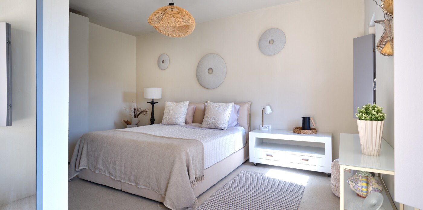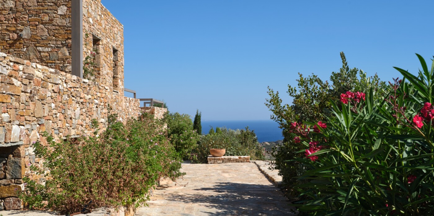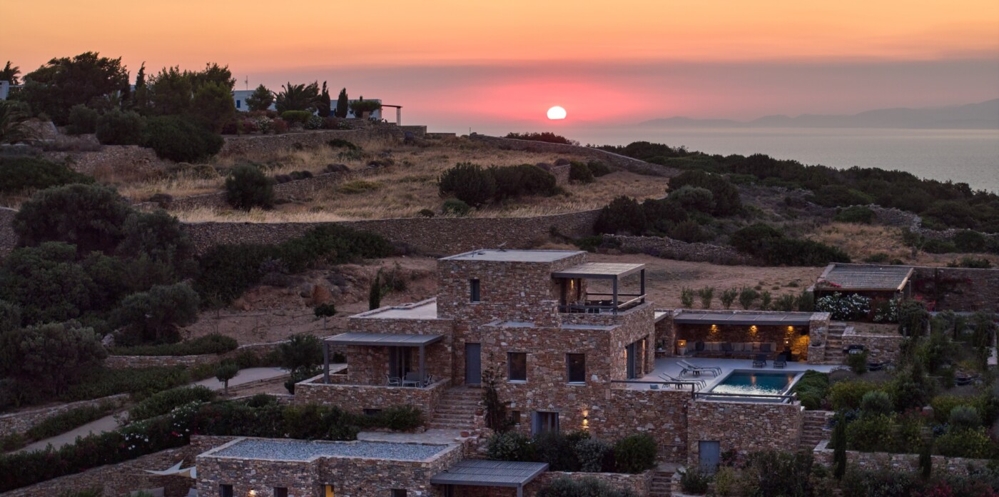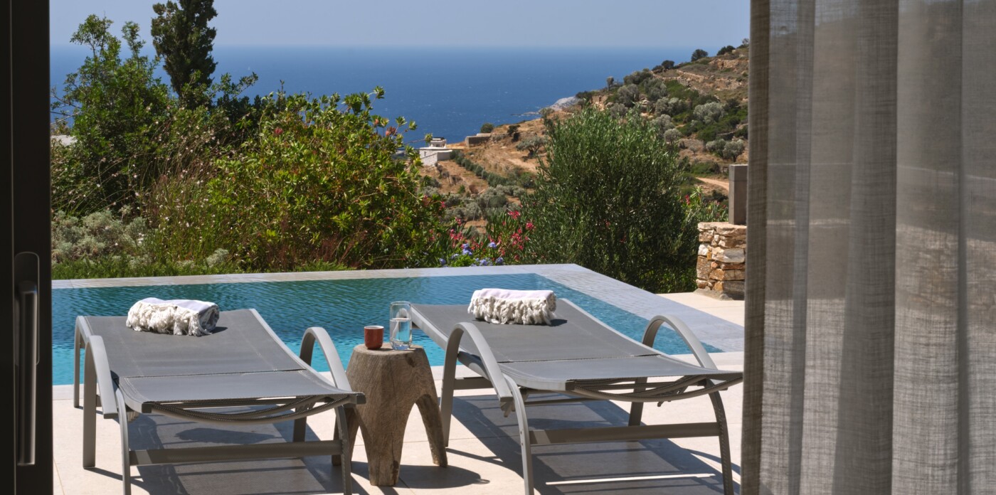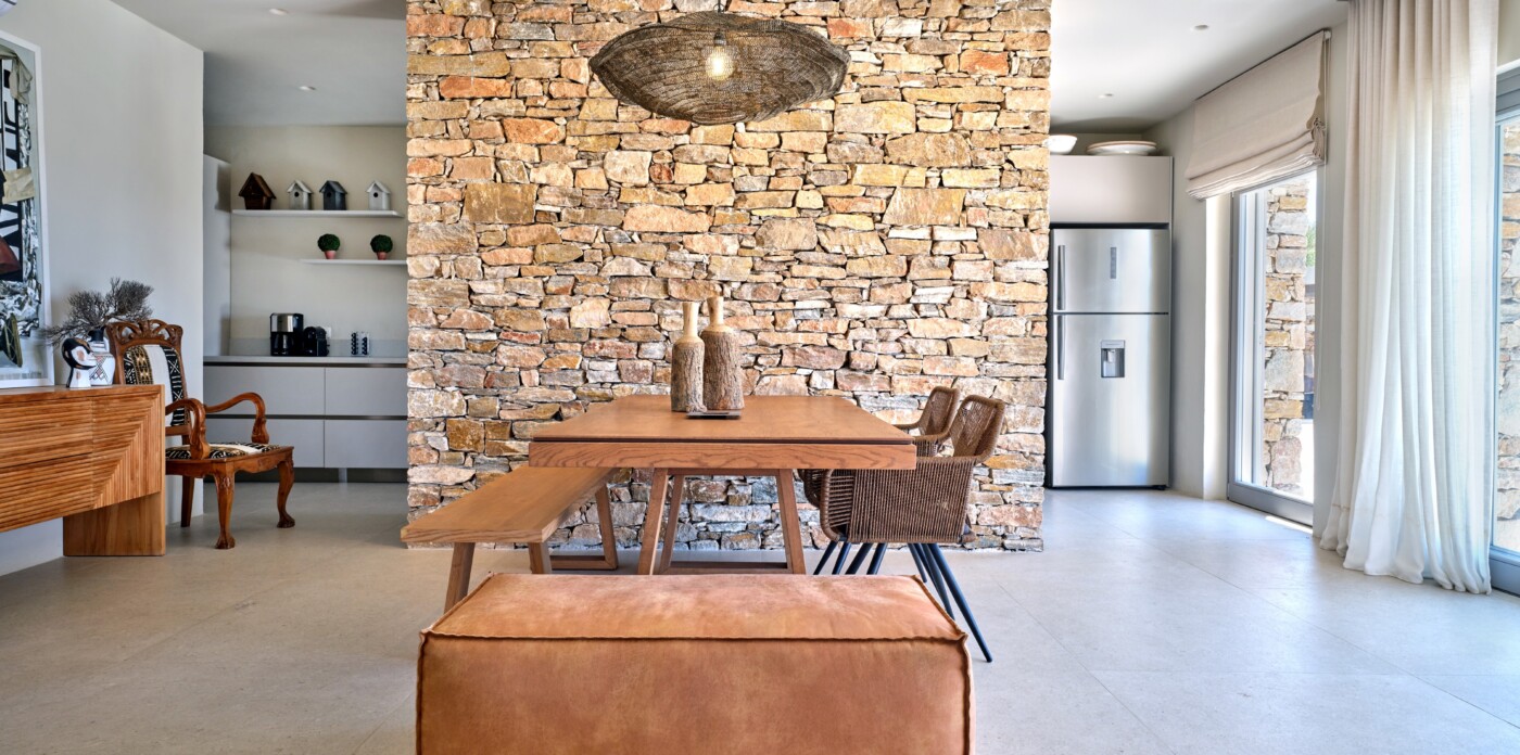 Diinera masterfully blends traditional island architecture with contemporary enhancements. It features five spacious bedrooms within the main residence and two independent guesthouses, providing ideal accommodation for friends and family with utmost privacy and comfort. Every interior space is bright and inviting, showcasing high-end finishes and designed to perfectly frame the sea and countryside views.