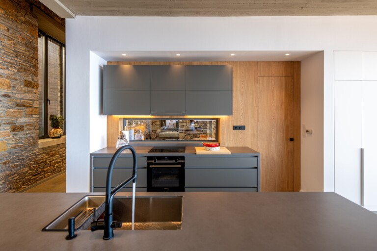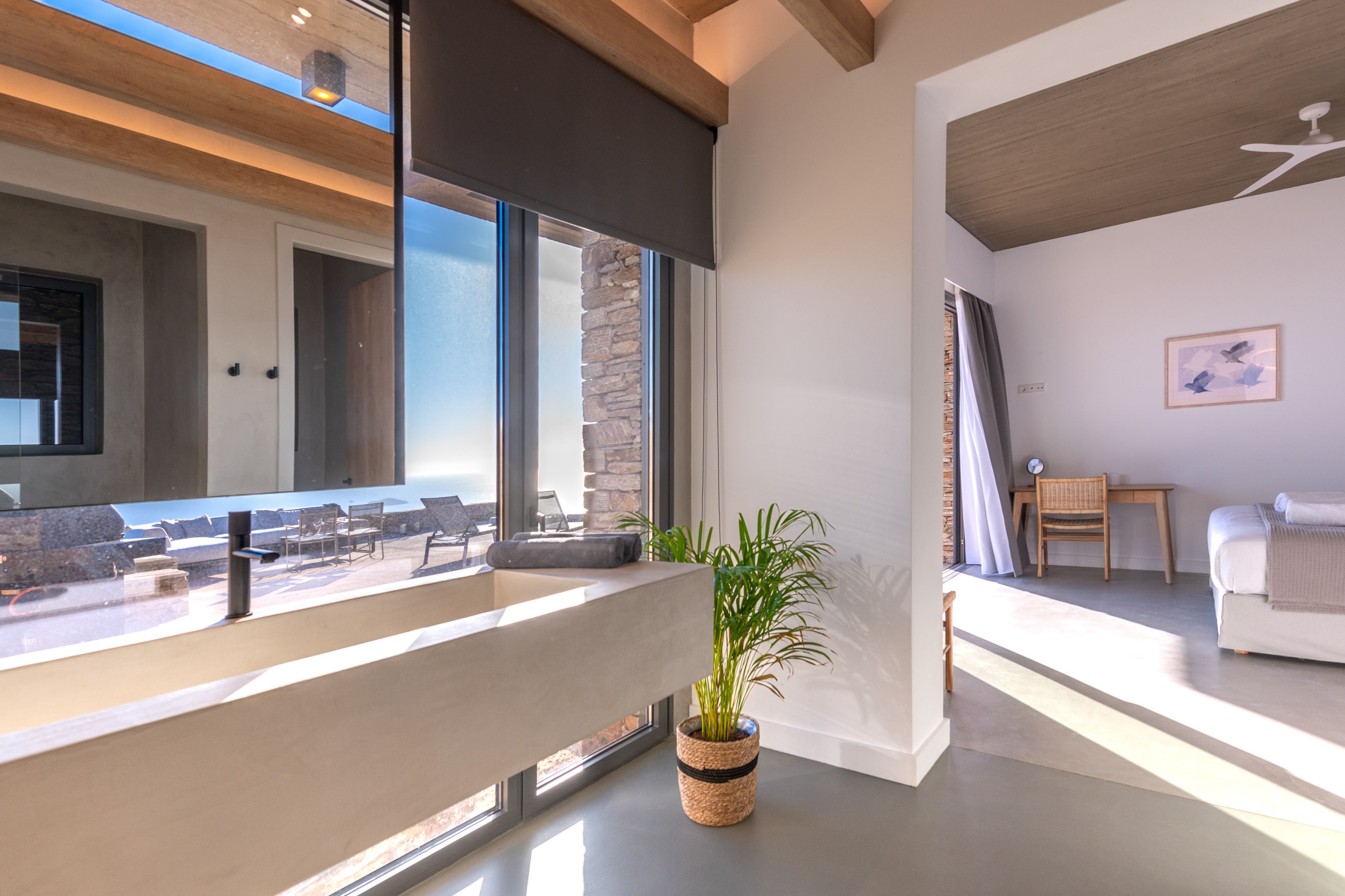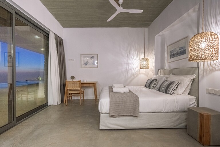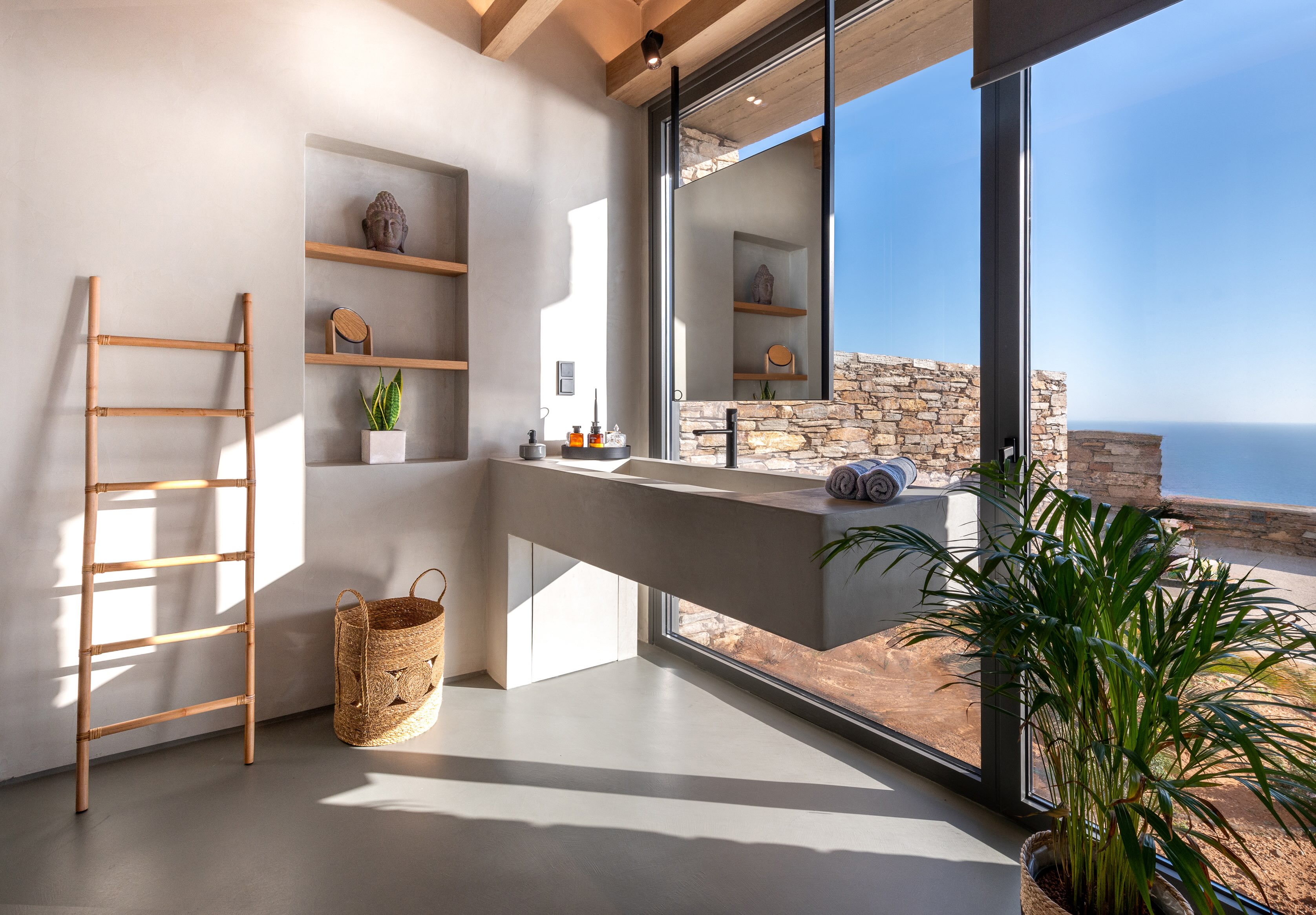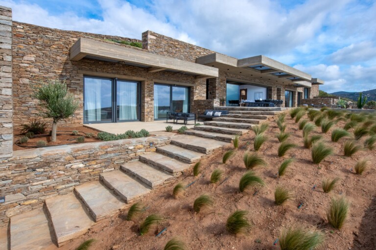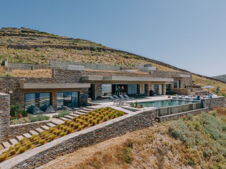 Set on a 4,250 sq.m. plot and unfolding across 320 sq.m. on a single level, the villa is carved into the hillside, its natural stone and concrete forms blending seamlessly with the terrain. Conceived as a modern cave dwelling, it celebrates the island’s raw textures and elemental calm while offering a life of understated luxury.