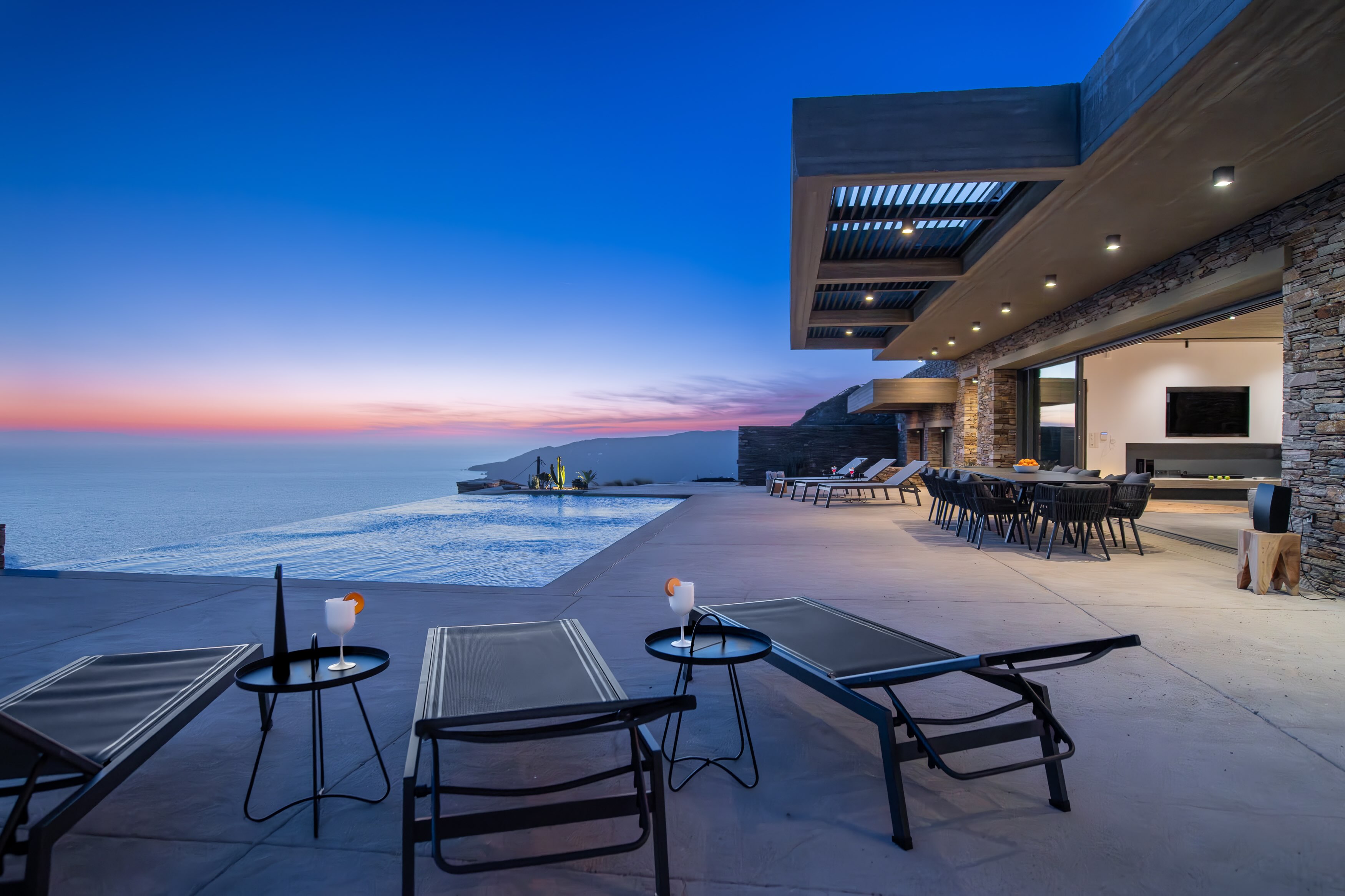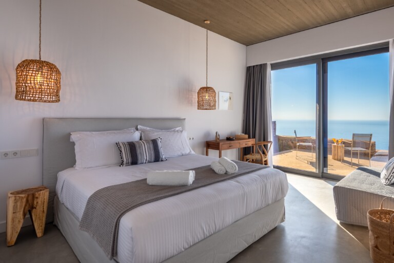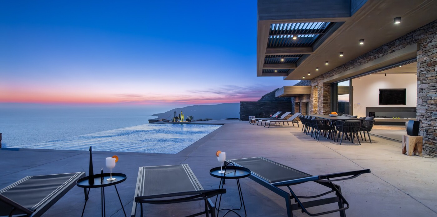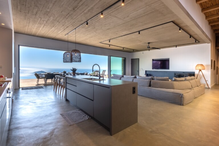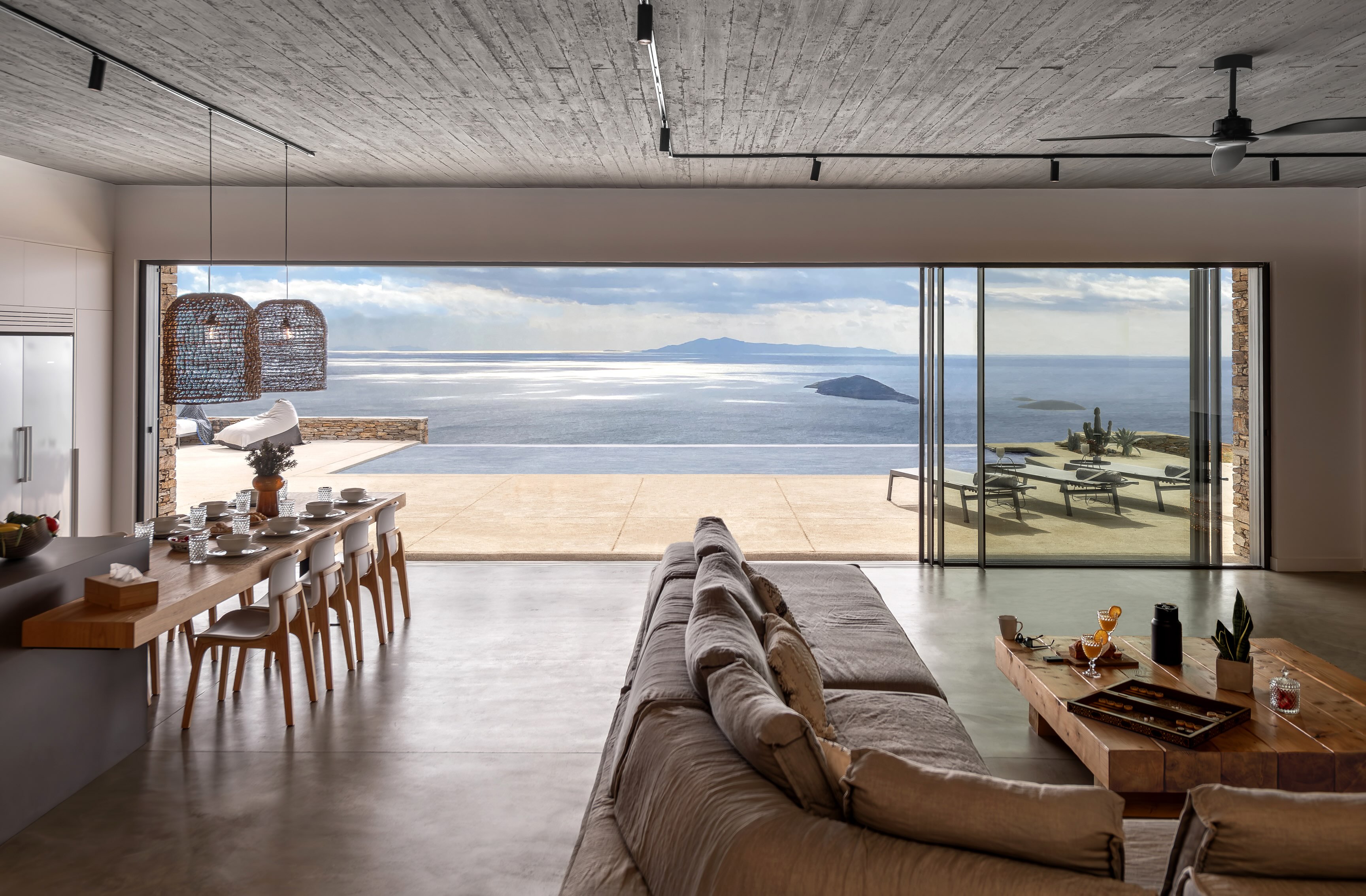 Inside, an open-plan living and dining area draws the eye outward to the horizon. Floor-to-ceiling glass doors erase the boundary between interior and exterior, opening onto an infinity pool terrace where sea and sky meet in one endless line. At the villa’s heart, a glass-framed patio carved into the rock showcases native flora — a living sculpture that connects architecture to earth.