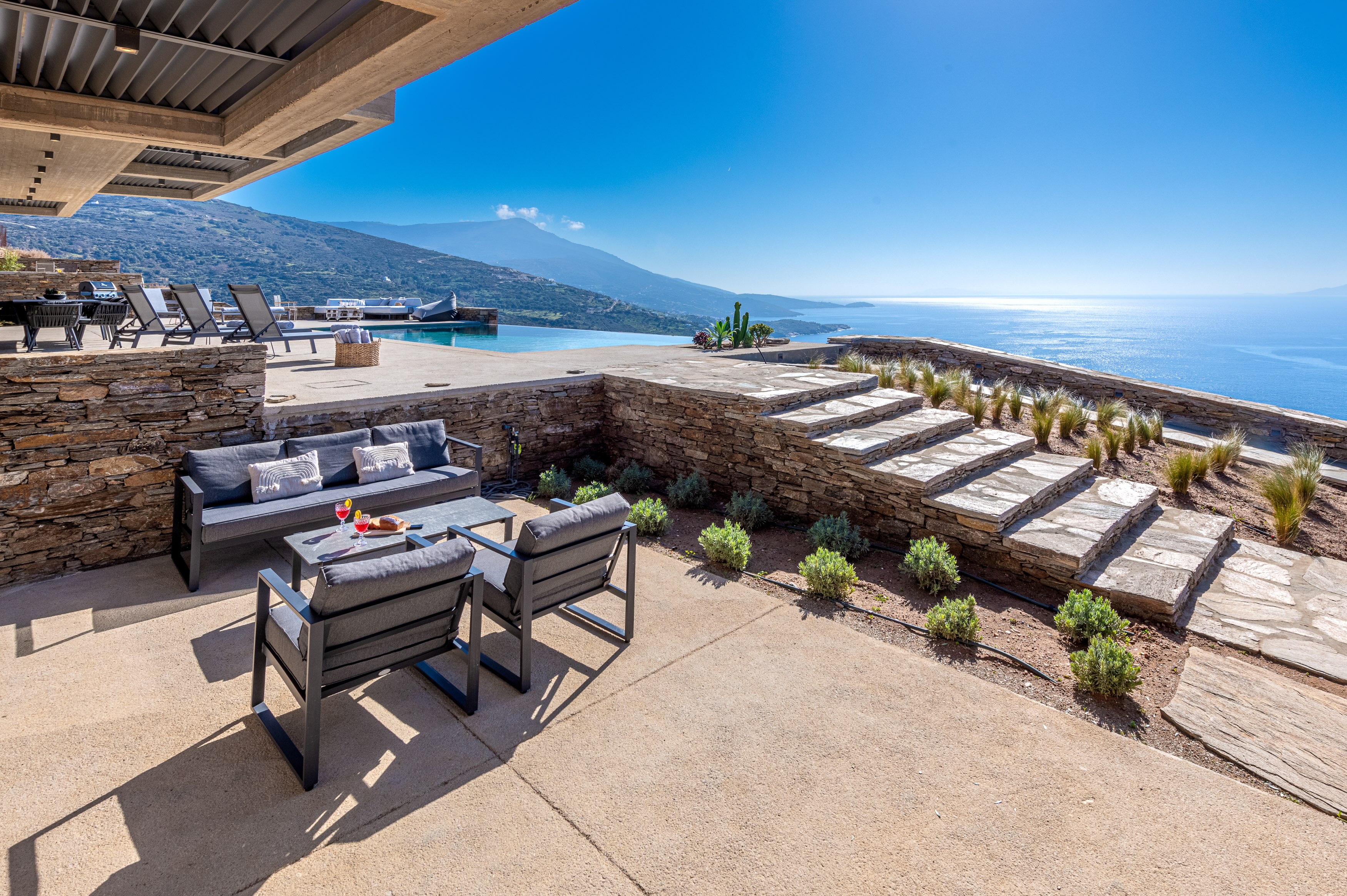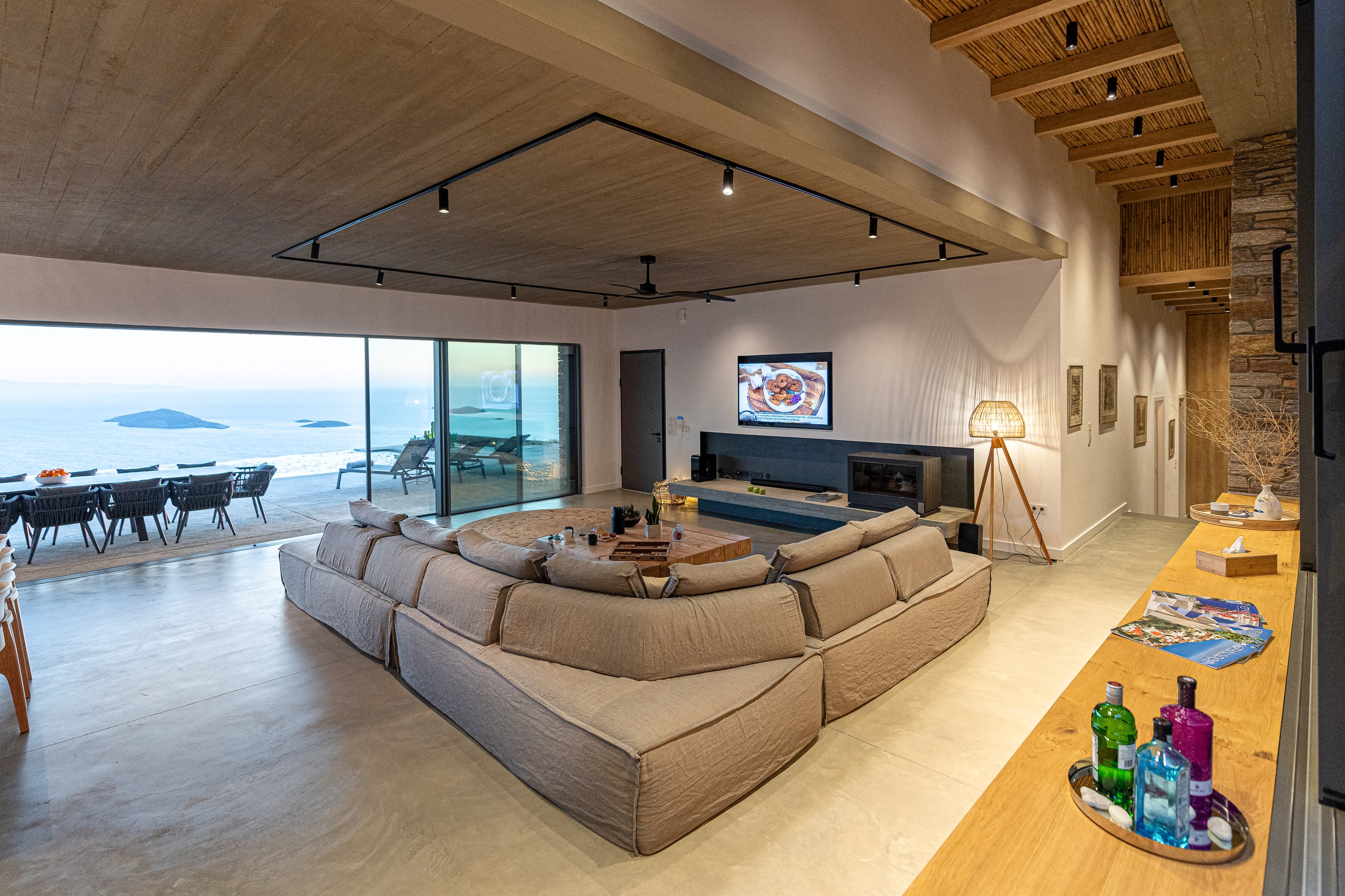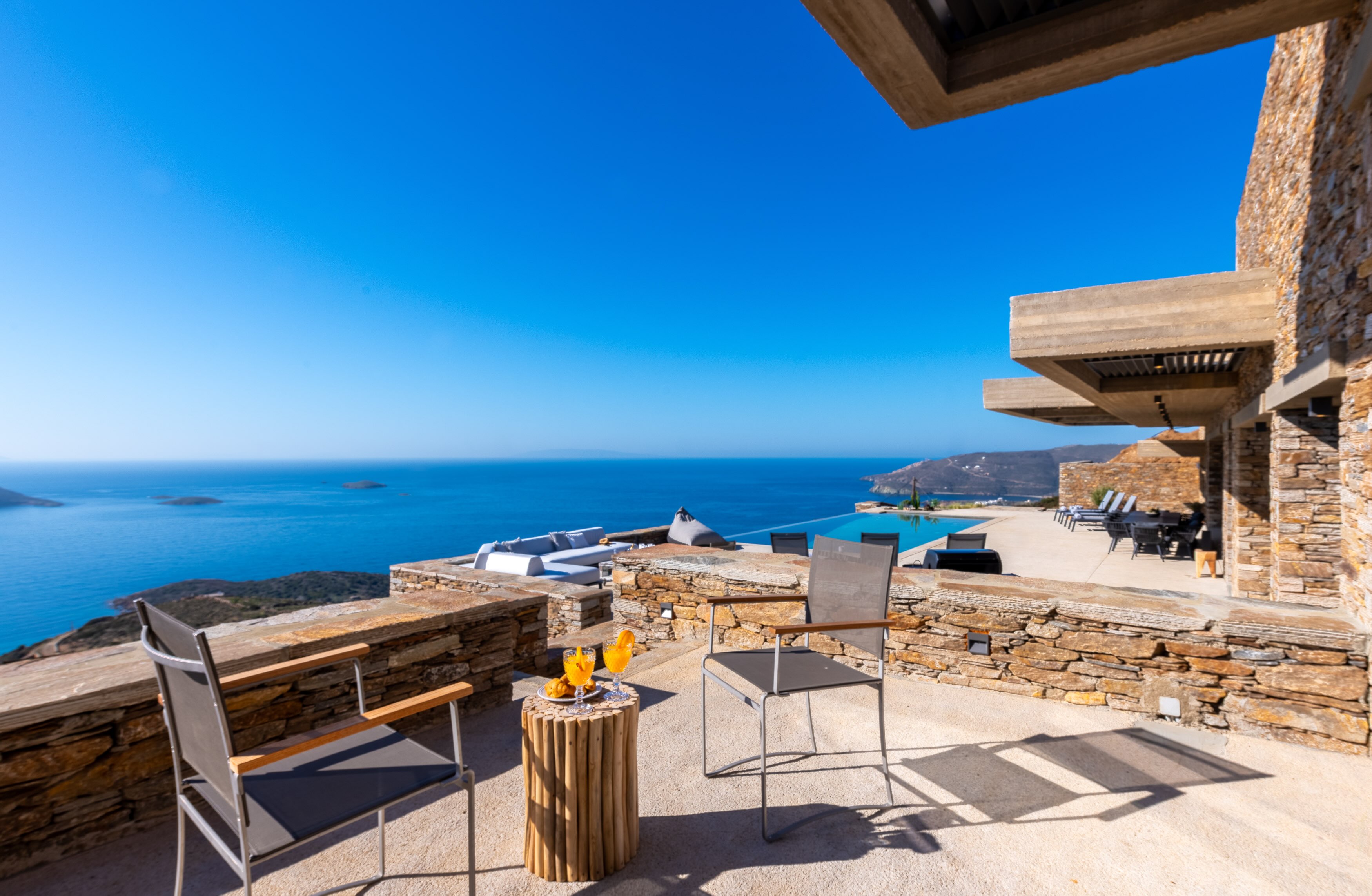 Outside, expansive terraces flow around the infinity pool, offering both shaded and sun-drenched spaces for relaxation or entertaining. With its southwest orientation, Villa Elysion enjoys spectacular sunsets that paint the Aegean in hues of amber and rose.