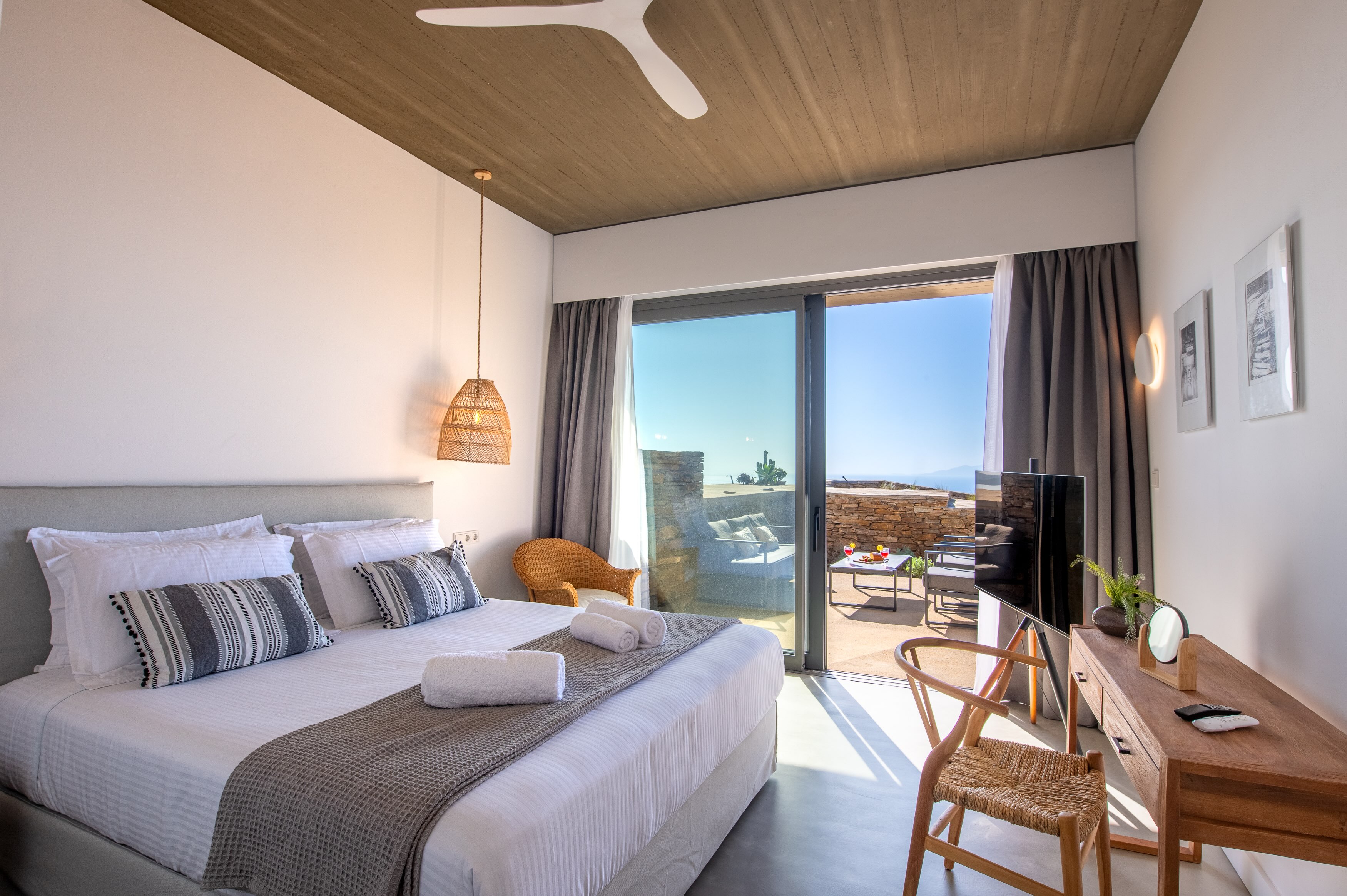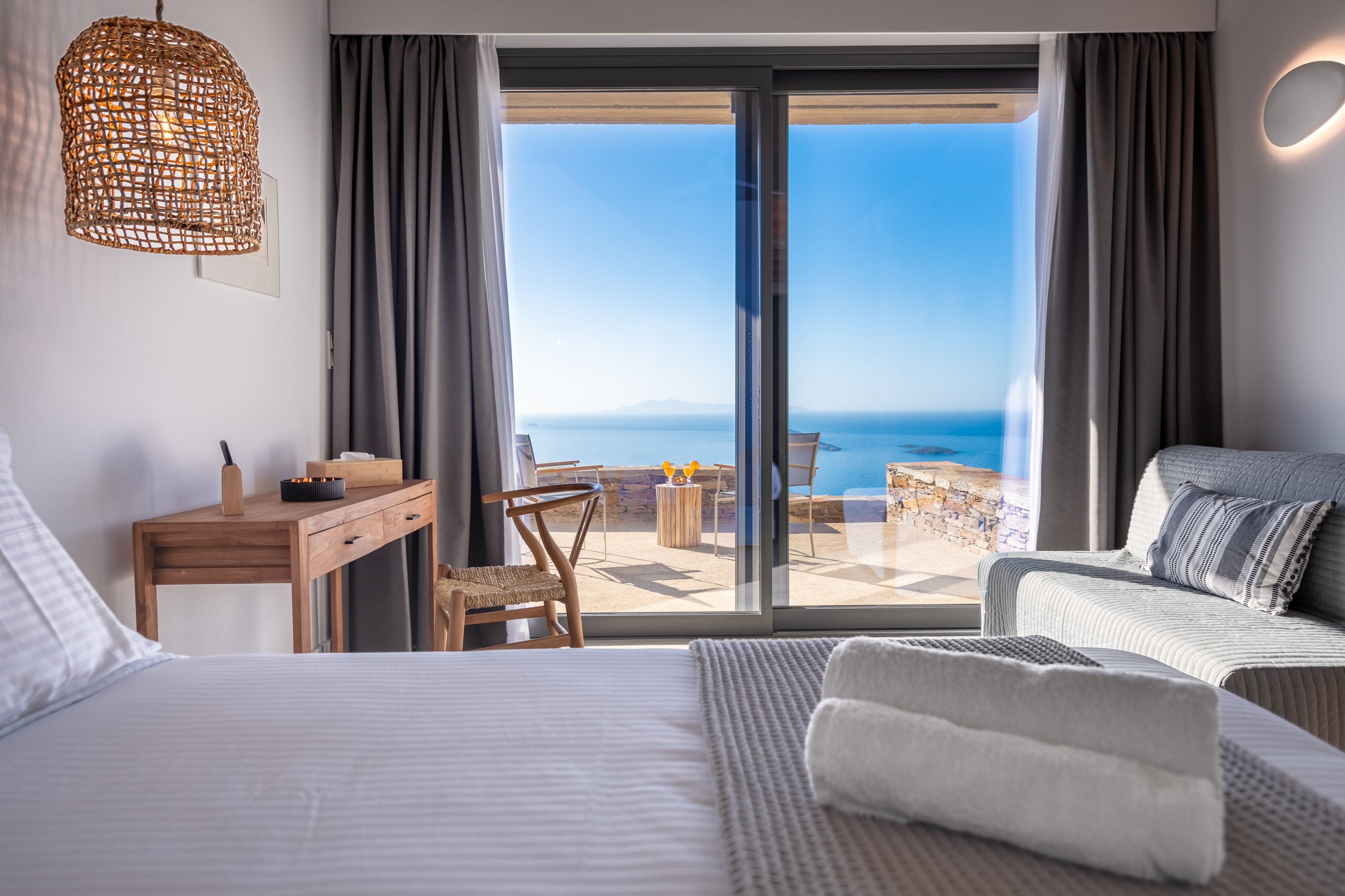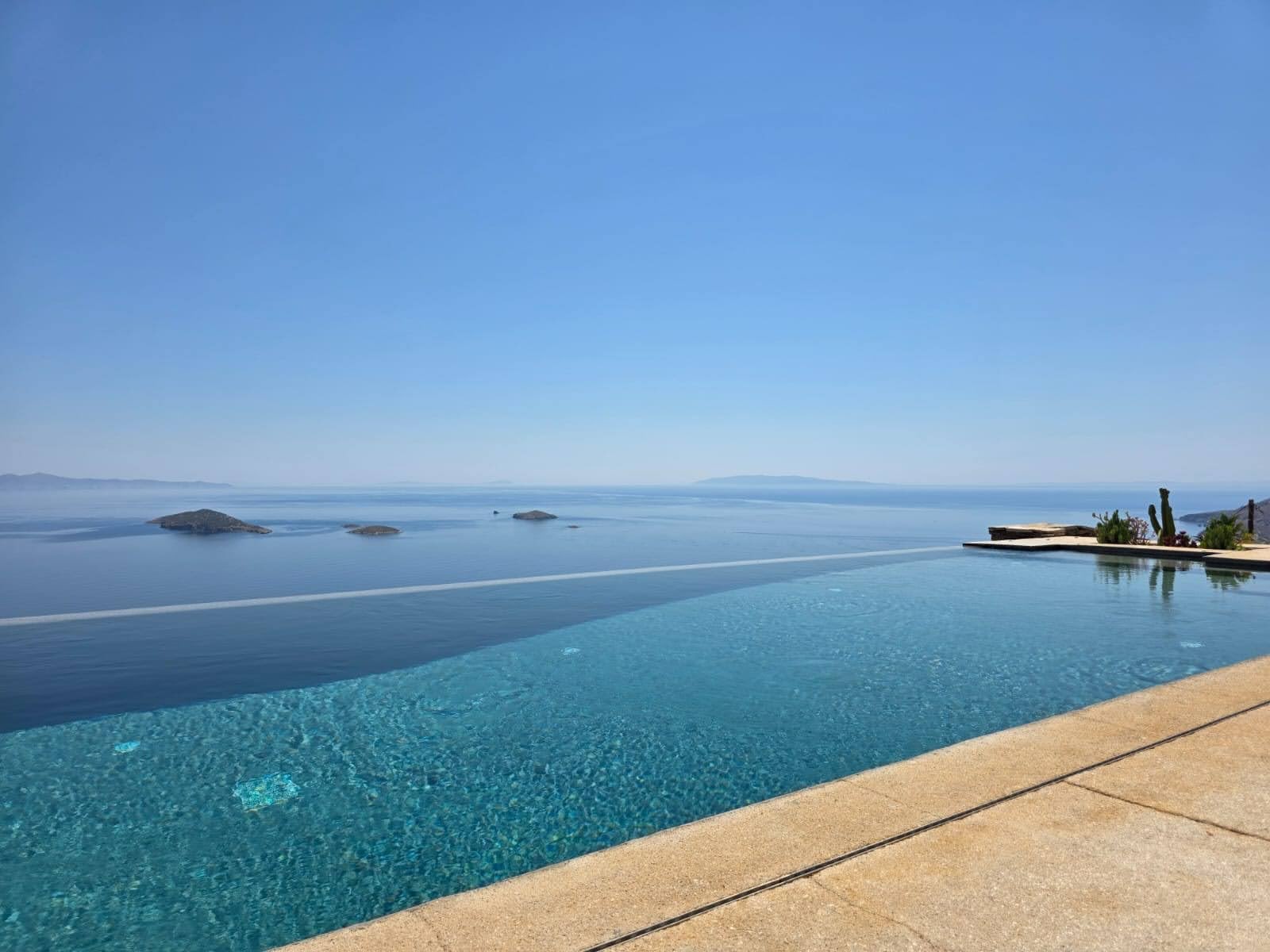 Outside, expansive terraces flow around the infinity pool, offering both shaded and sun-drenched spaces for relaxation or entertaining. With its southwest orientation, Villa Elysion enjoys spectacular sunsets that paint the Aegean in hues of amber and rose.