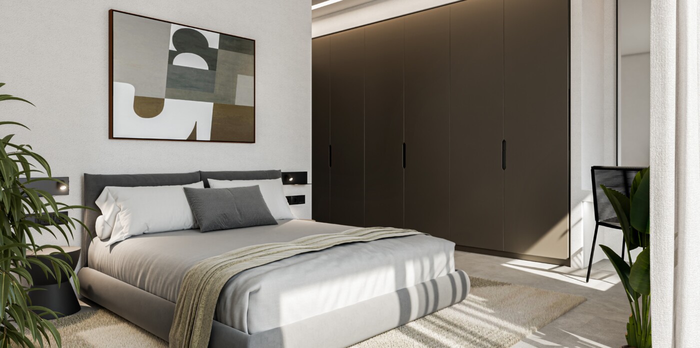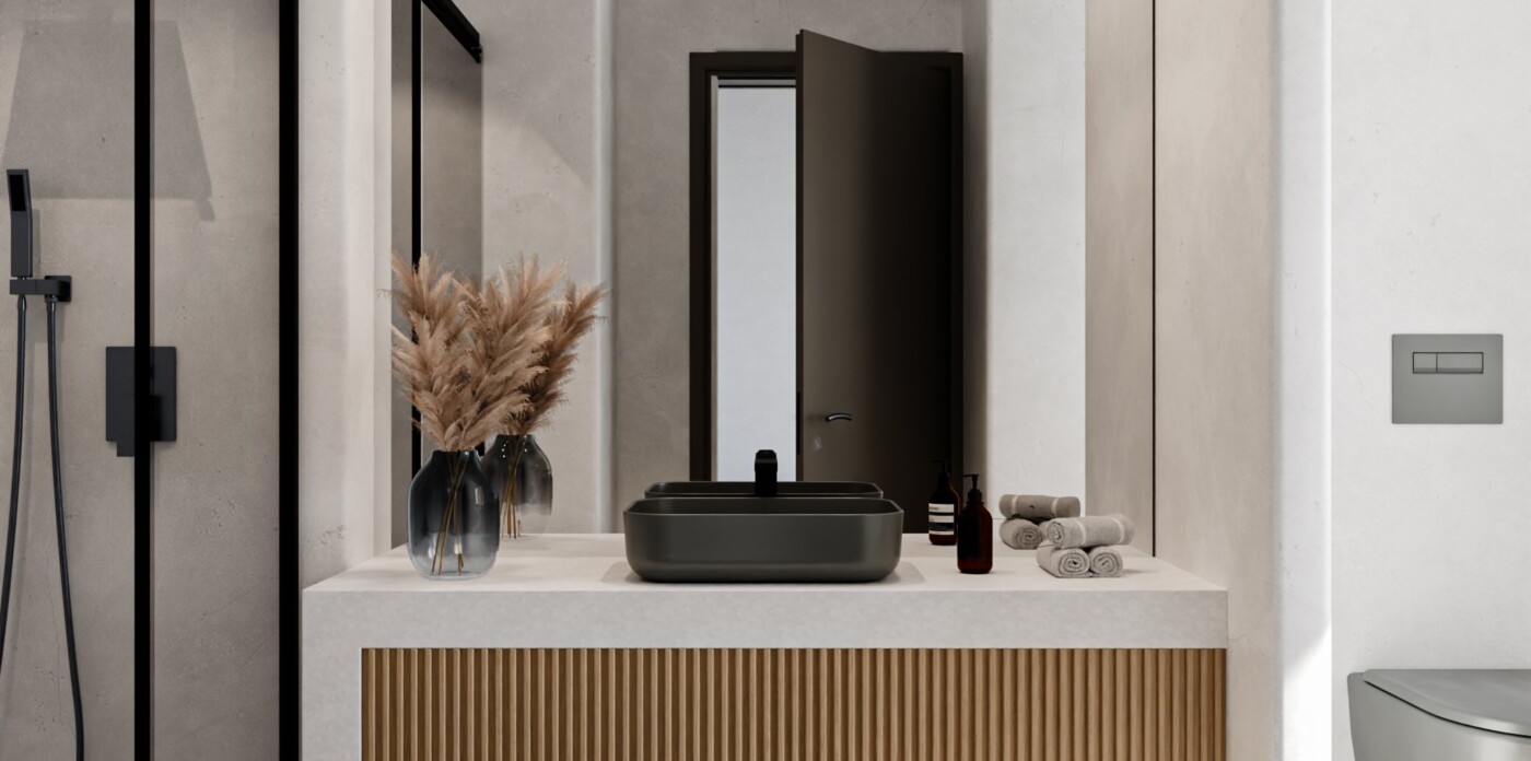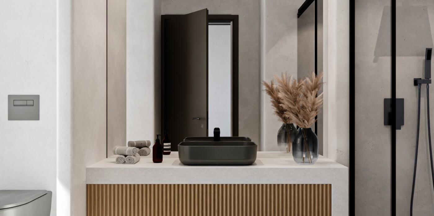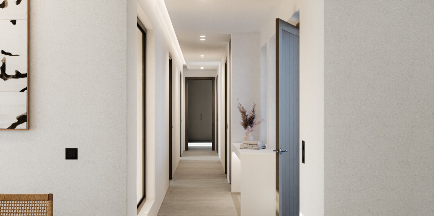 Outdoors, a 14-metre swimming pool is designed to anchor the landscaped terrace, forming a natural extension of the living spaces. An external lounge area, shaded by a pergola and incorporating a built-in sofa, is planned as an inviting setting for summer afternoons and al fresco entertaining.