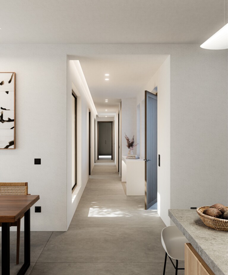 The open-plan kitchen and living area will form a bright and welcoming environment, centred around a fireplace and enhanced by underfloor heating. Large openings are planned to allow natural light to flow throughout the interiors, creating a setting well suited to both everyday living and social gatherings throughout the year.