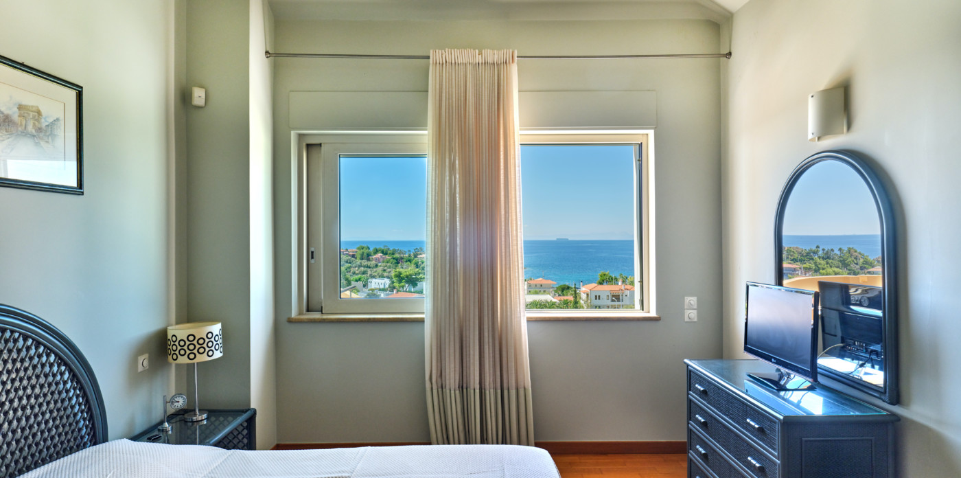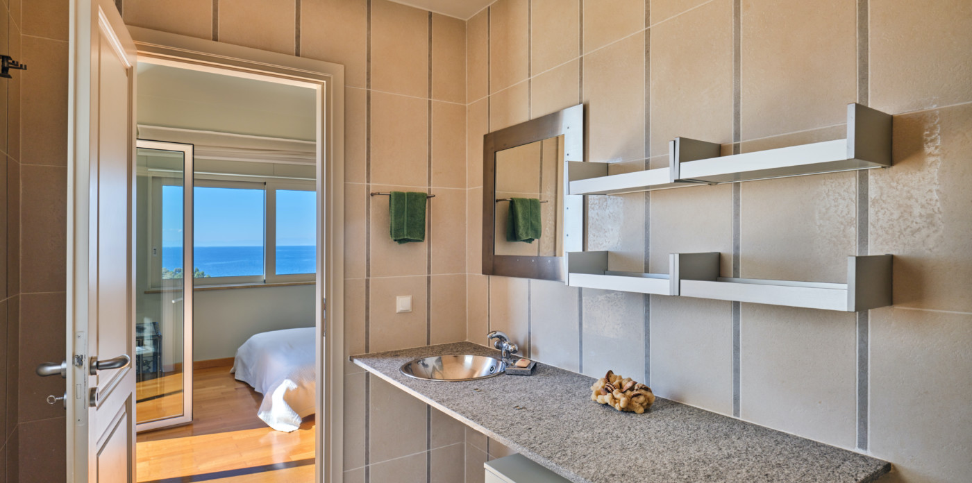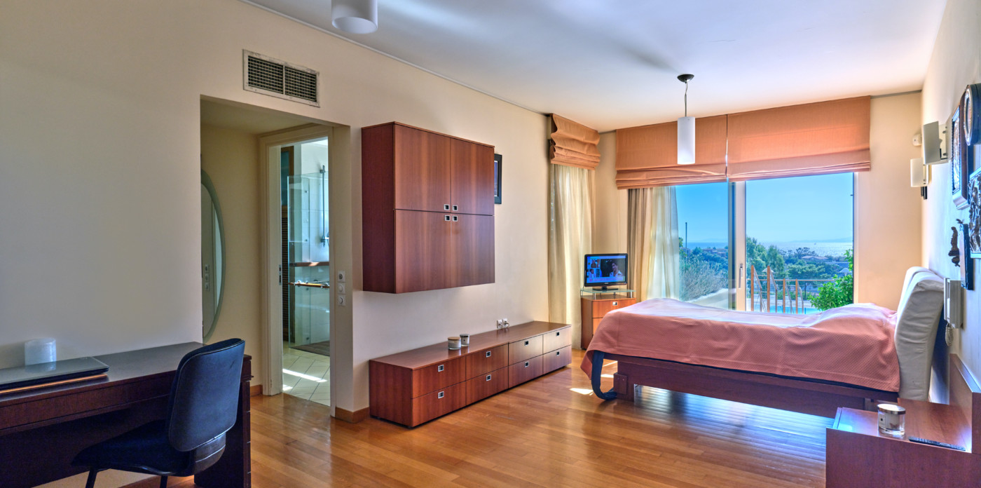 The villa’s first and ground-floor elegant interiors feature two master bedrooms with en-suite bathrooms and a walk-in closet. All rooms have private balconies and big windows that overlook the Aegean. Additionally, there is one more master bedroom with an en suite bathroom and its own private lounge.