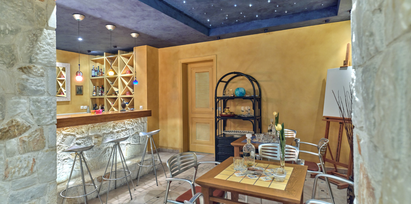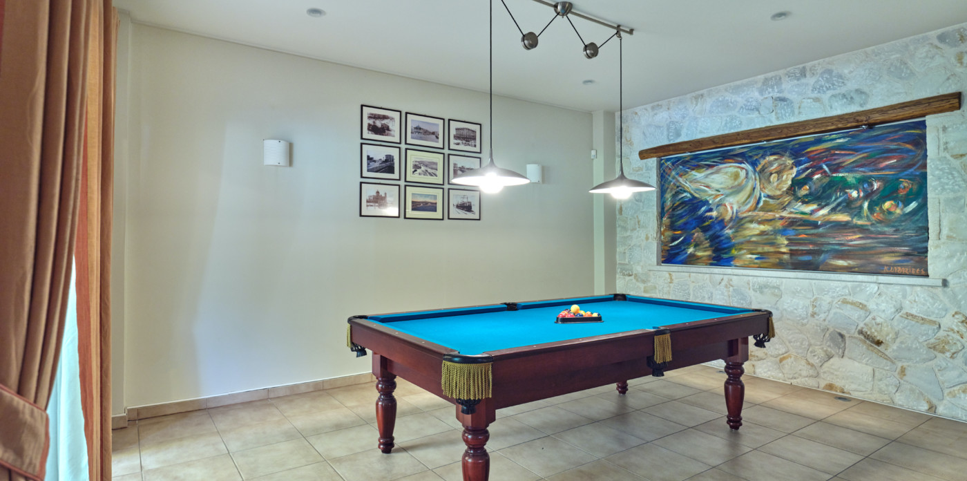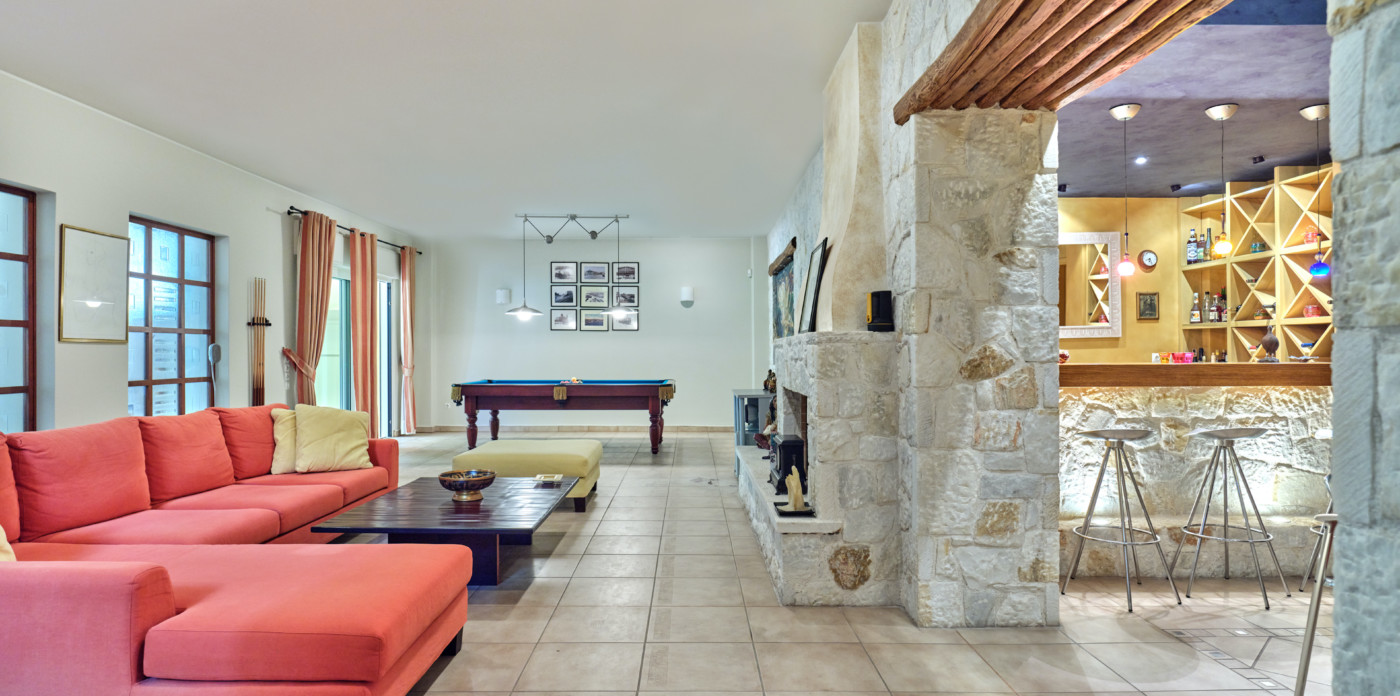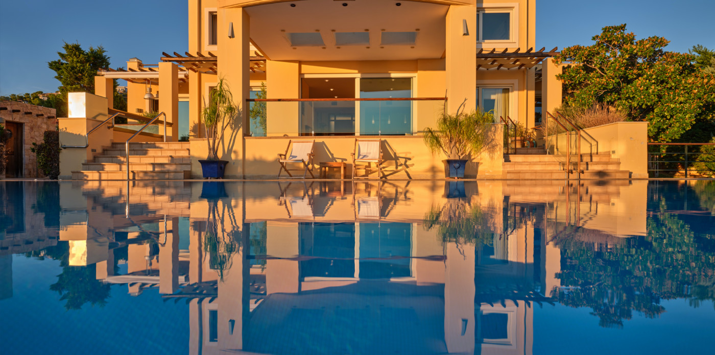 The villa’s first and ground-floor elegant interiors feature two master bedrooms with en-suite bathrooms and a walk-in closet. All rooms have private balconies and big windows that overlook the Aegean. Additionally, there is one more master bedroom with an en suite bathroom and its own private lounge.