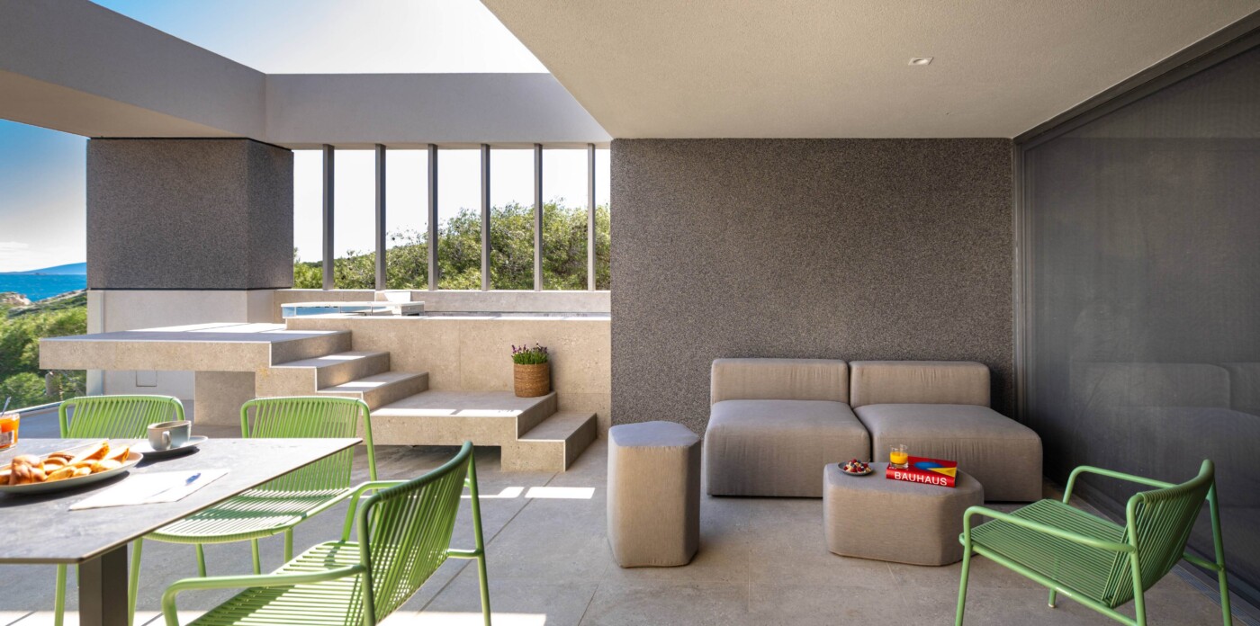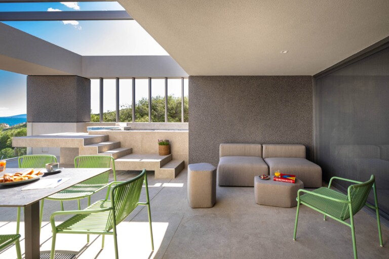The transition between indoor and outdoor areas is clearly defined, with the terrace extending the main living space. The property also includes a private lap pool, a feature not commonly found in similar homes. Sea views, open space, and water are consistent elements throughout.