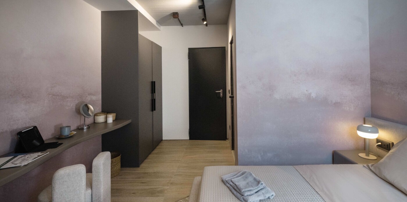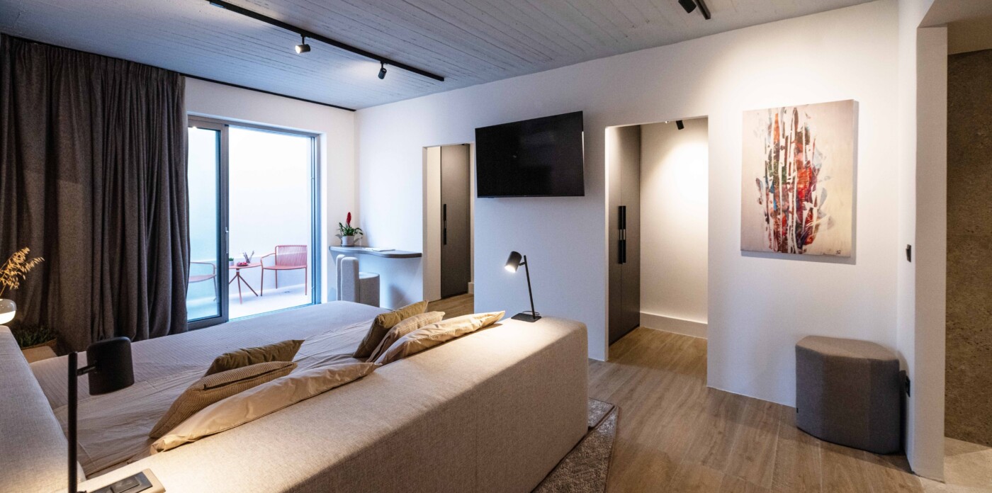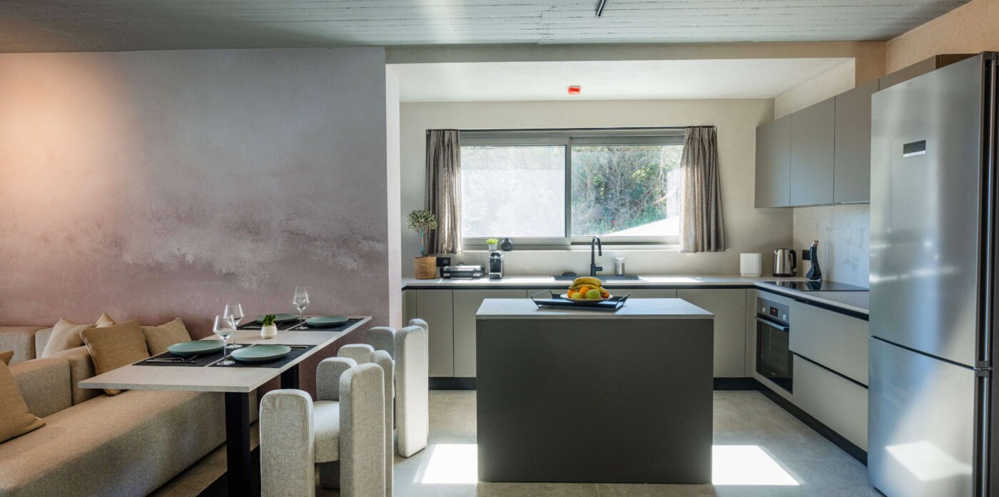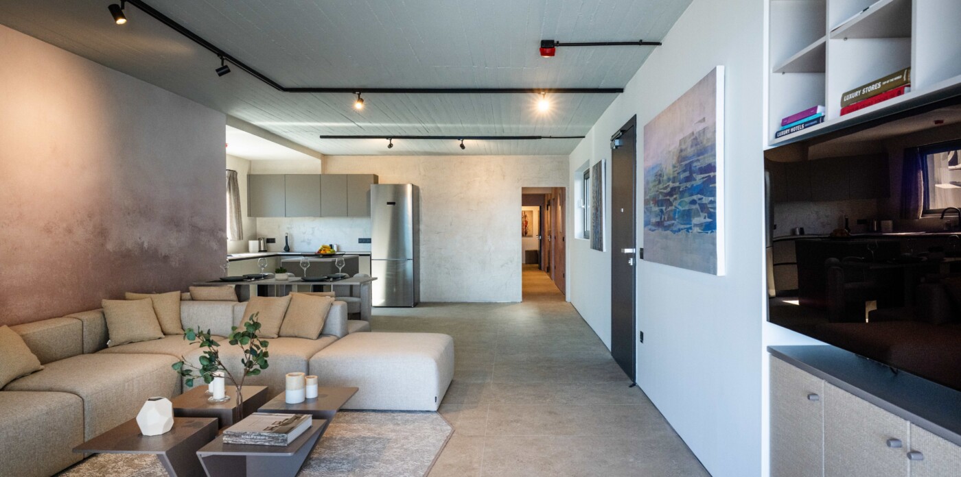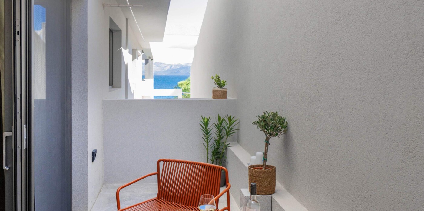 The apartment is arranged with a clear layout centred around an open-plan living and dining area leading to a terrace with uninterrupted sea views. Large openings allow for natural light throughout the day, while the kitchen is integrated into the main living space with a focus on functionality.