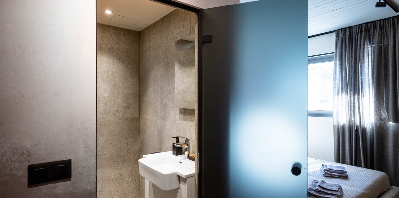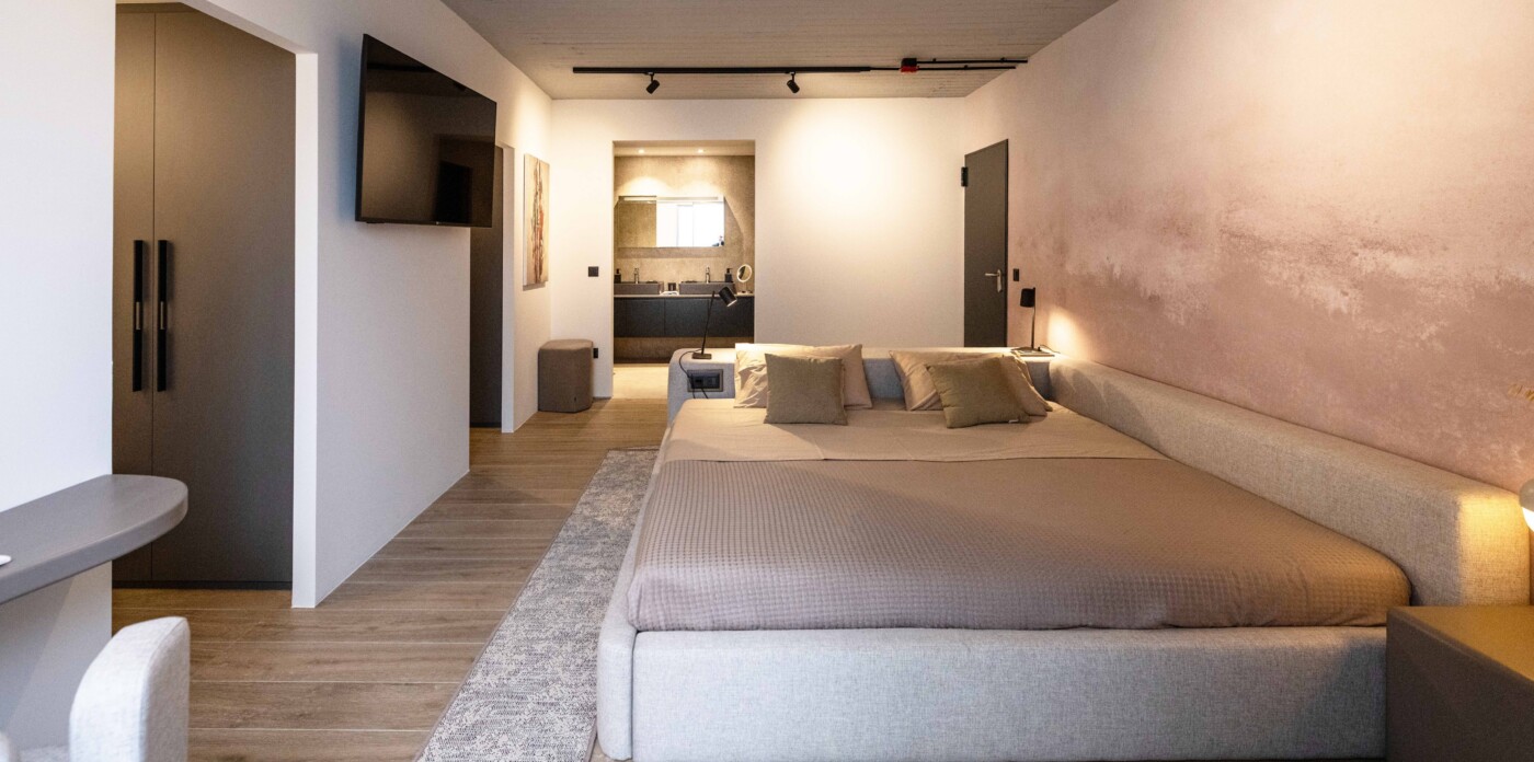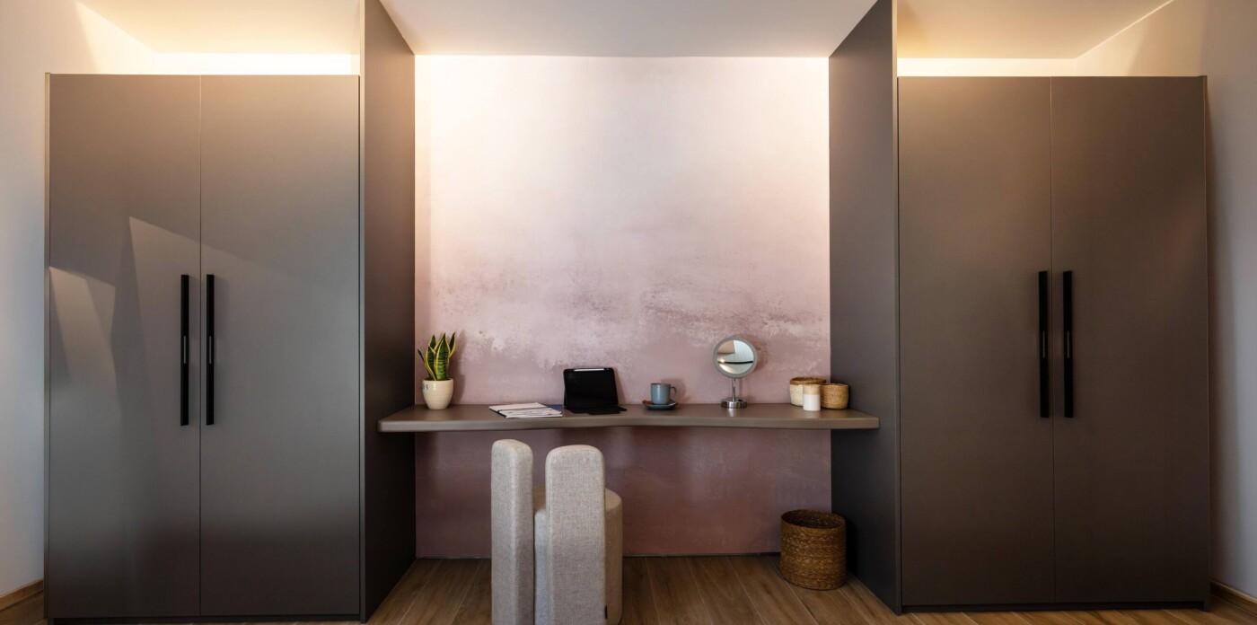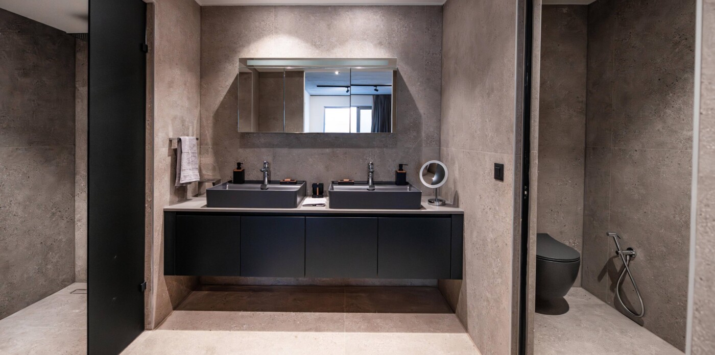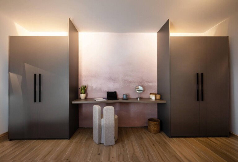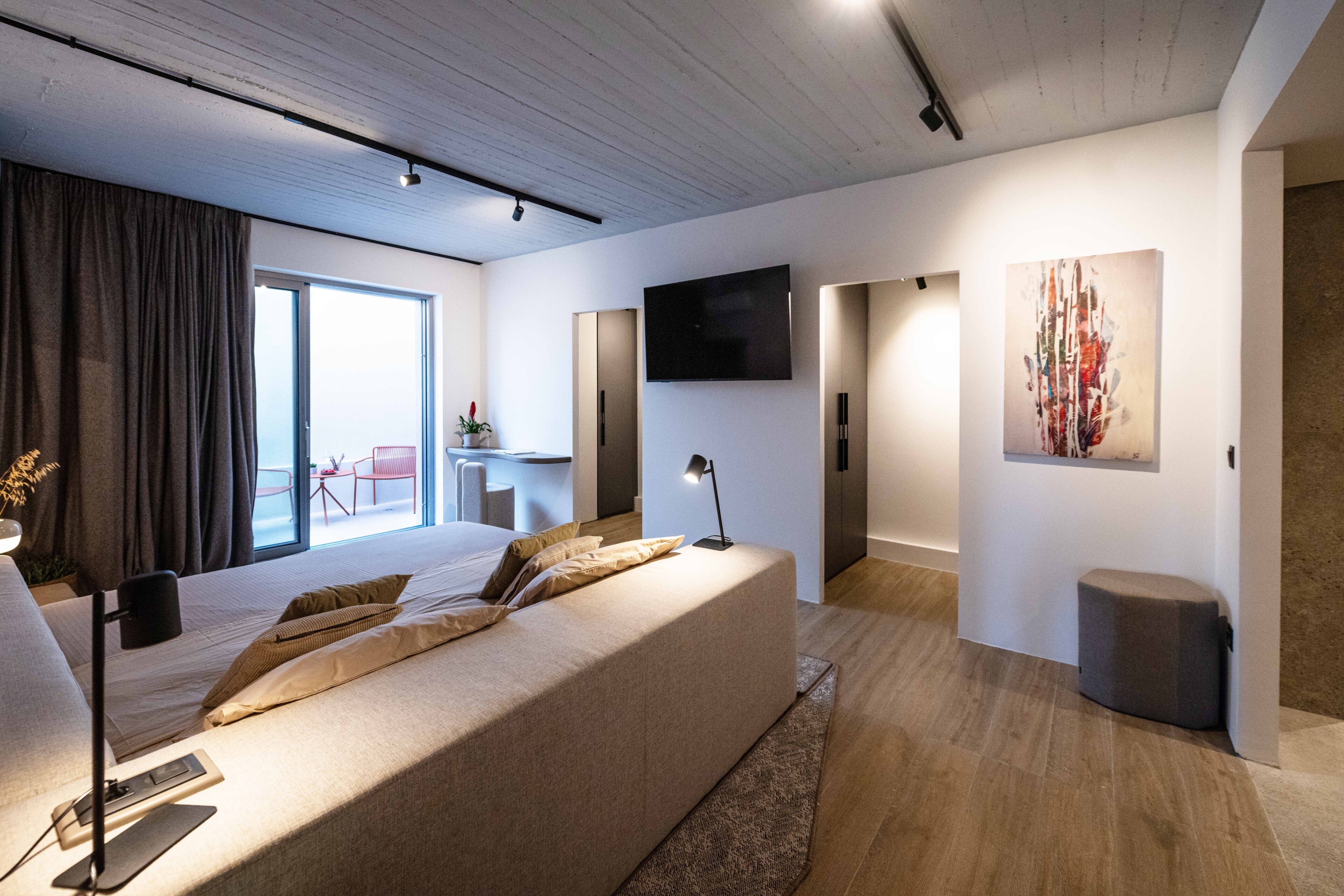 The apartment is arranged with a clear layout centred around an open-plan living and dining area leading to a terrace with uninterrupted sea views. Large openings allow for natural light throughout the day, while the kitchen is integrated into the main living space with a focus on functionality.