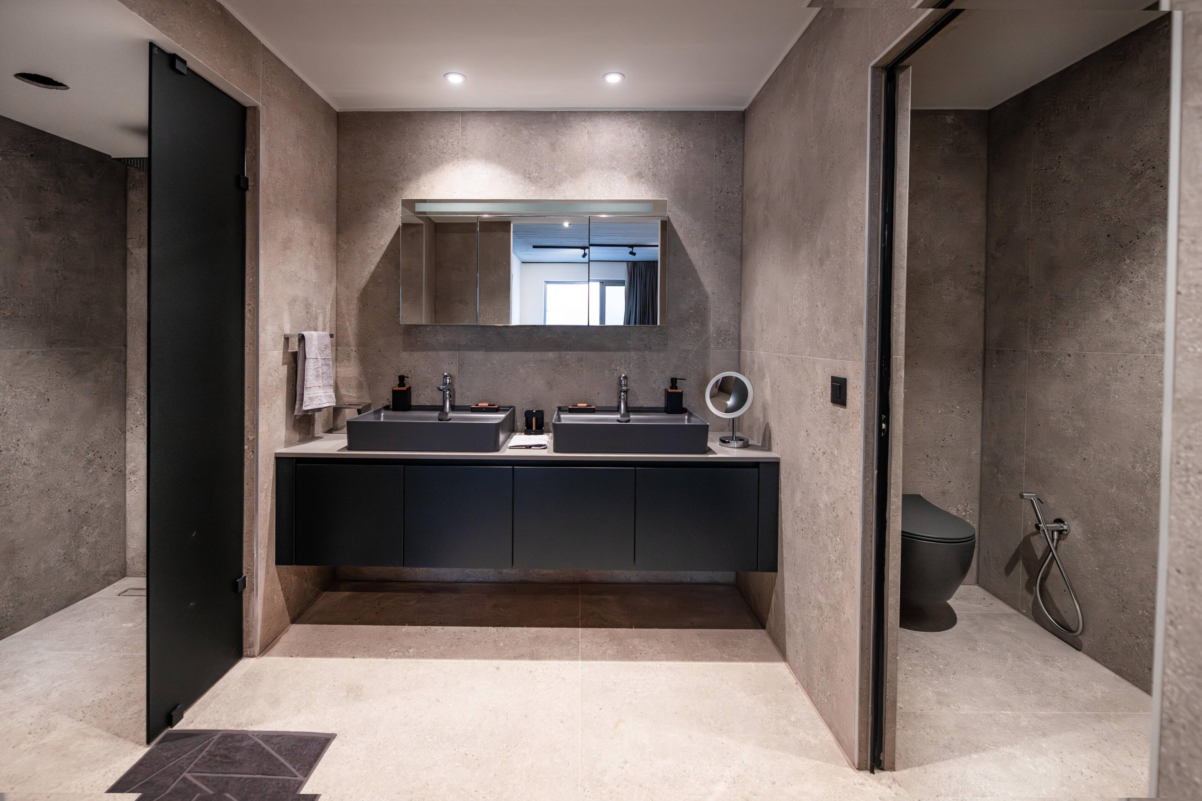 The apartment comprises three bedrooms, including a primary suite, along with additional bathrooms. A separate laundry room is also included.