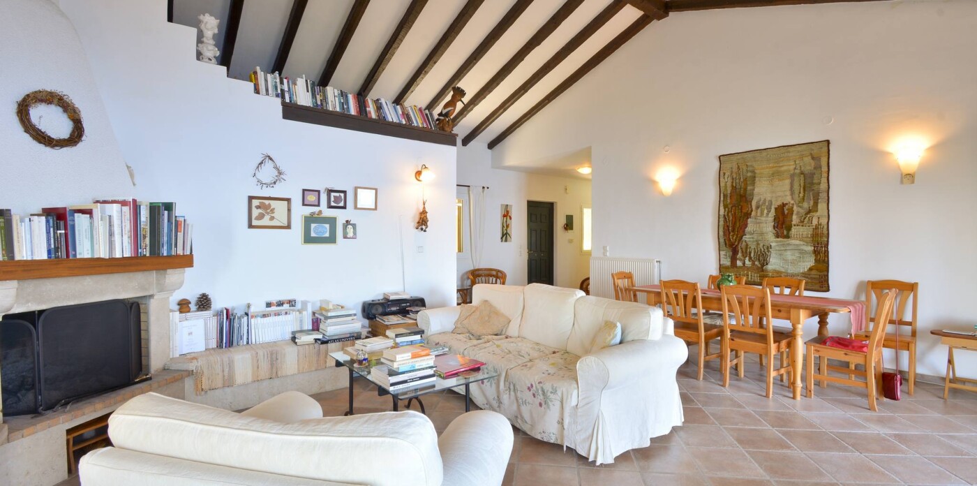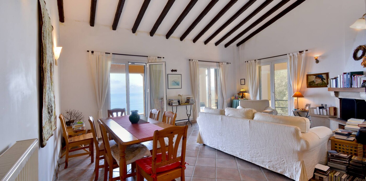 Step inside to find an open plan living room with a rustic fireplace and high beamed ceilings, creating a warm and inviting atmosphere. The 3 spacious bedrooms all offer sea views and access to their own sea view terraces, perfect for enjoying a morning coffee or evening cocktail while soaking in the scenery.