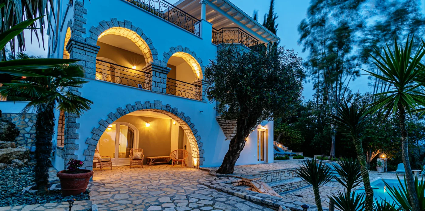 Introducing Eudora, a captivating villa nestled on the picturesque island of Corfu, where panoramic views of the Ionian Sea await. This stylish and elegant home boats 6 en-suite bedrooms and 450sqm of luxury living space. Upon entering the villa, you will be greeted by an ornate staircase and massive windows that provide an open and airy atmosphere, beautifully capturing the natural light and views of the surrounding landscape.