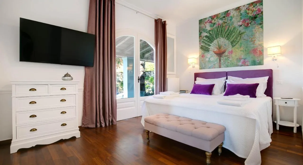 With a large pool and beautifully landscaped gardens, Eudora is an ideal oasis to escape and relax, and the large terrace with a dining table is the perfect spot to enjoy a meal while taking in the breathtaking views of the bay and the sea. The outdoor barbecue facilities provide a great opportunity to gather family and friends for some delicious meals, to be enjoyed under the cover of the romantic gazebo draped in grape vines.