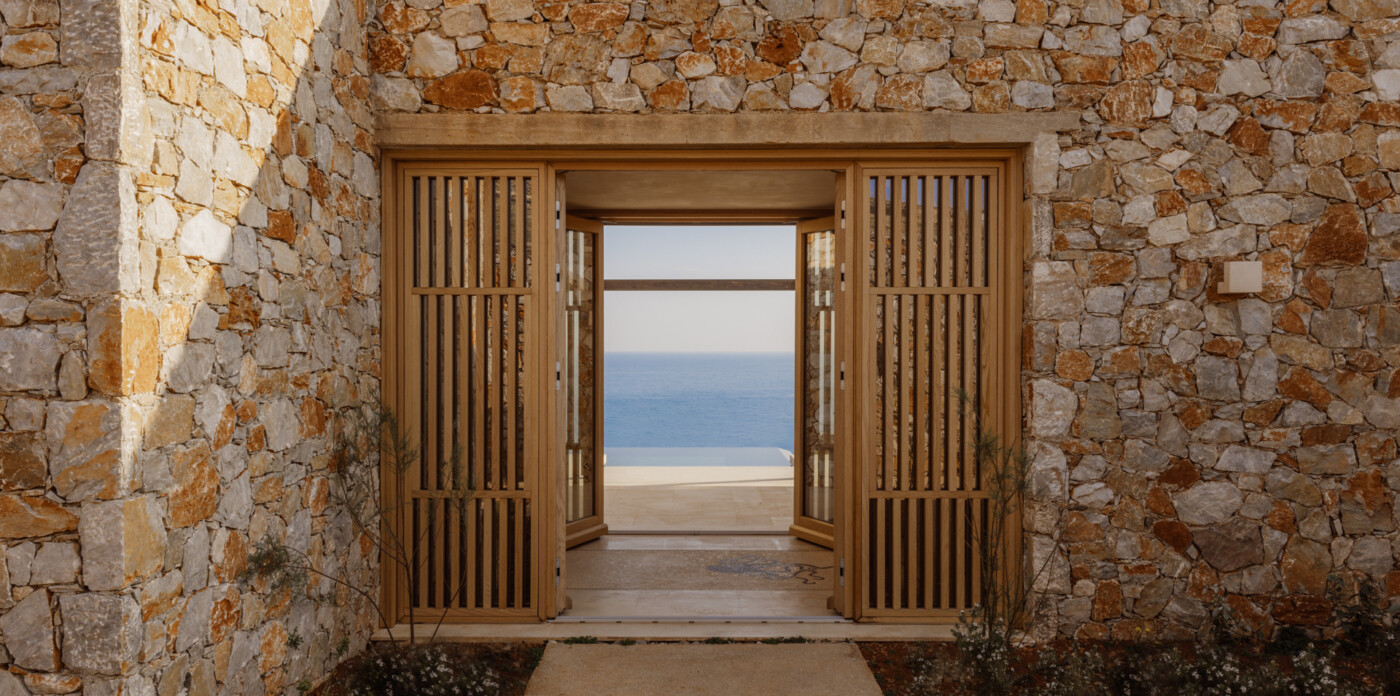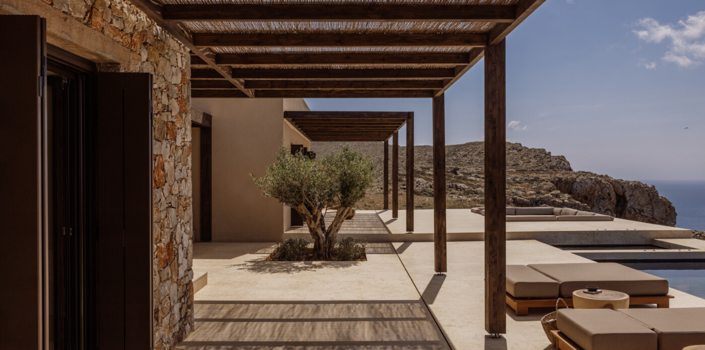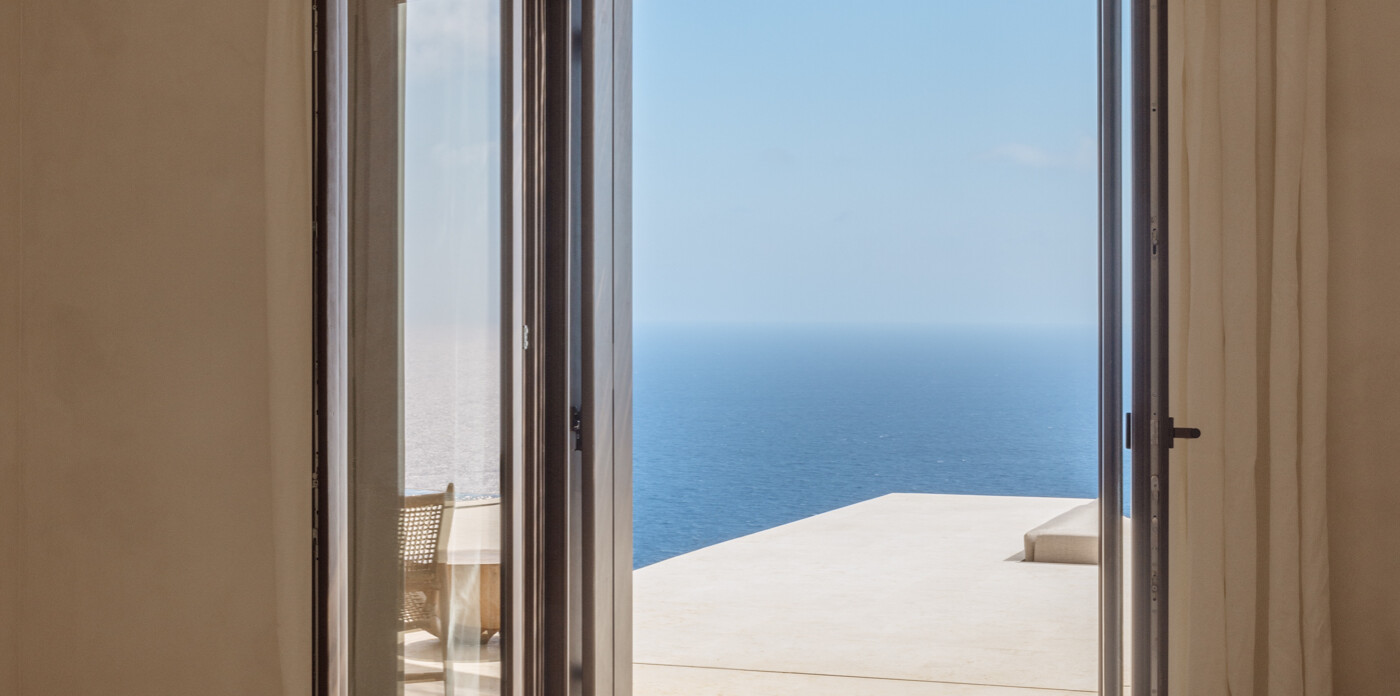 The gently sloping landscape offers idyllic sweeping sea views of the Aegean reaching out the blue horizon and the Cycladic, citrus coloured, sunset.