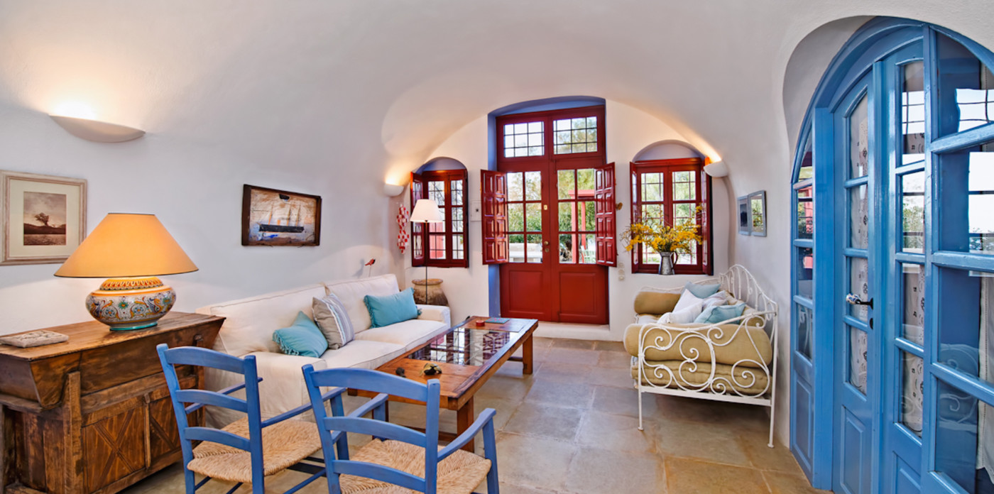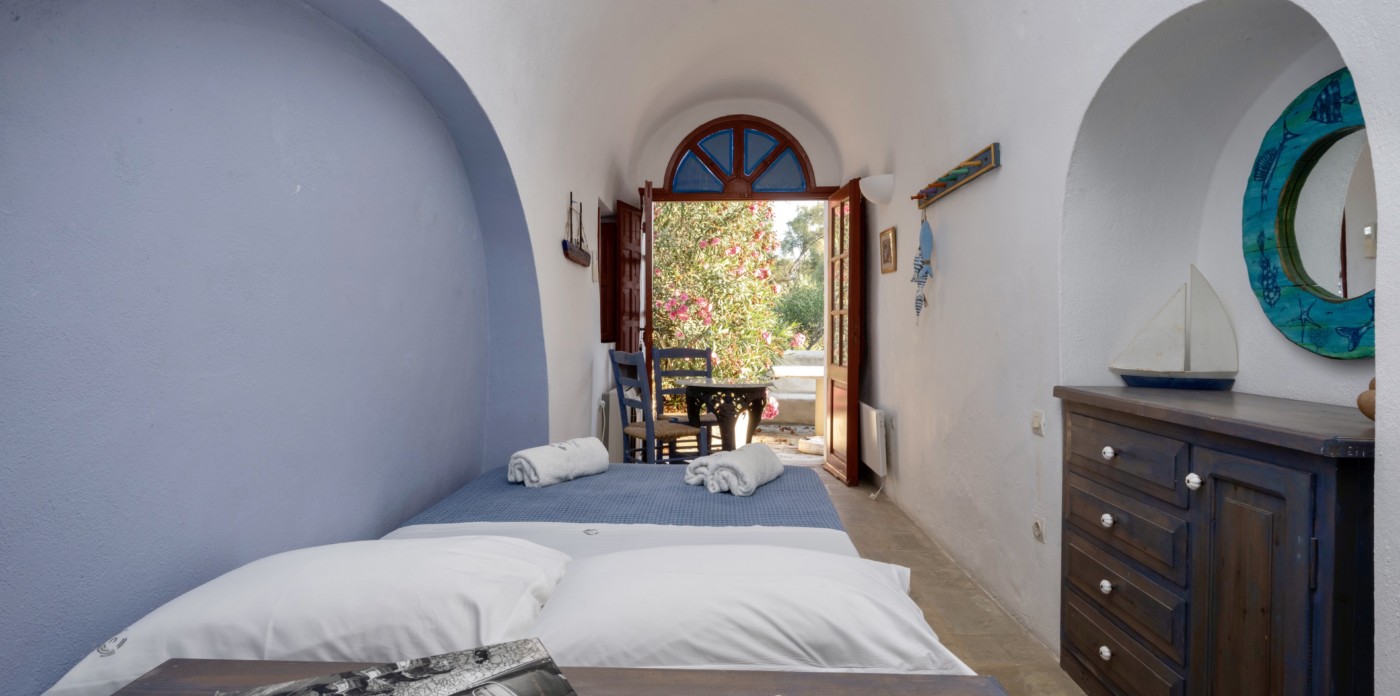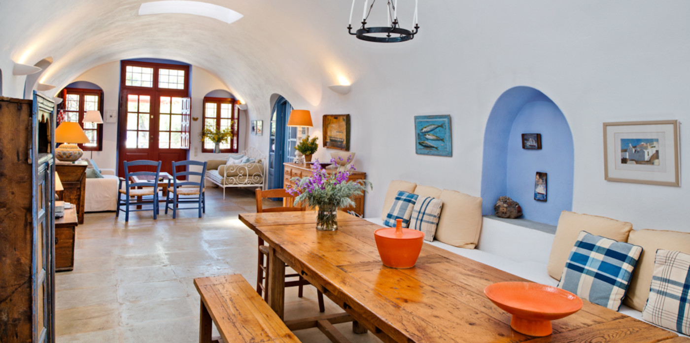 Step inside to charming interiors in the classic style of the Cyclades islands with simple but traditional decor. Curved ceilings, attractive alcoves and stone floors are just some of the features found here. The living space is centered around a large dining room table with built-in seating on one side and a lounge area with double doors and windows, leading out to the terrace. There are four en-suite bedrooms and an office space.