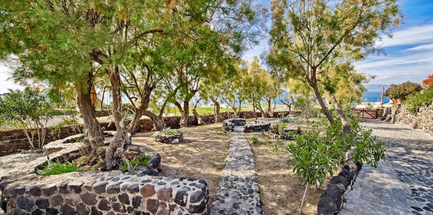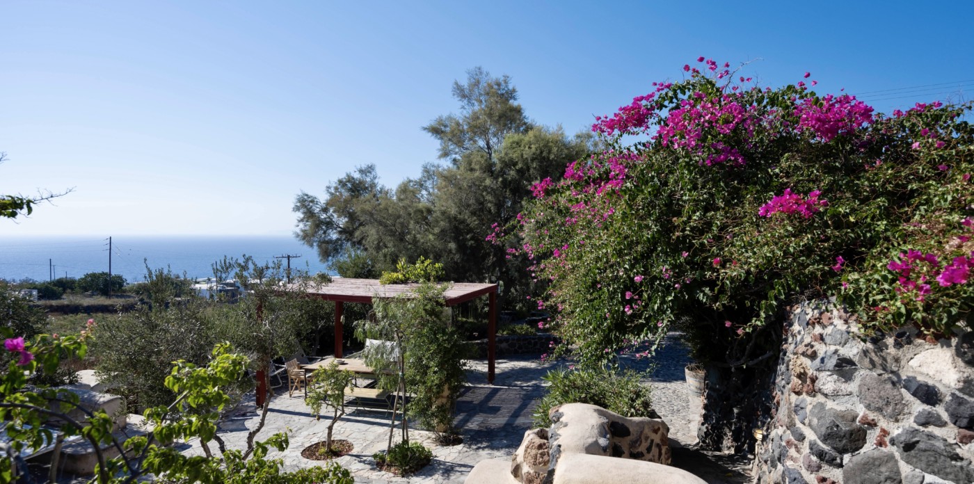 Vine covered seating areas, stone paving and a built in BBQ are all part of the gardens that look out over sea views. Olive trees, mature planting and vibrant fuchsia flowers bring color and fragrance to this island retreat.