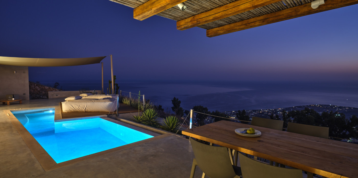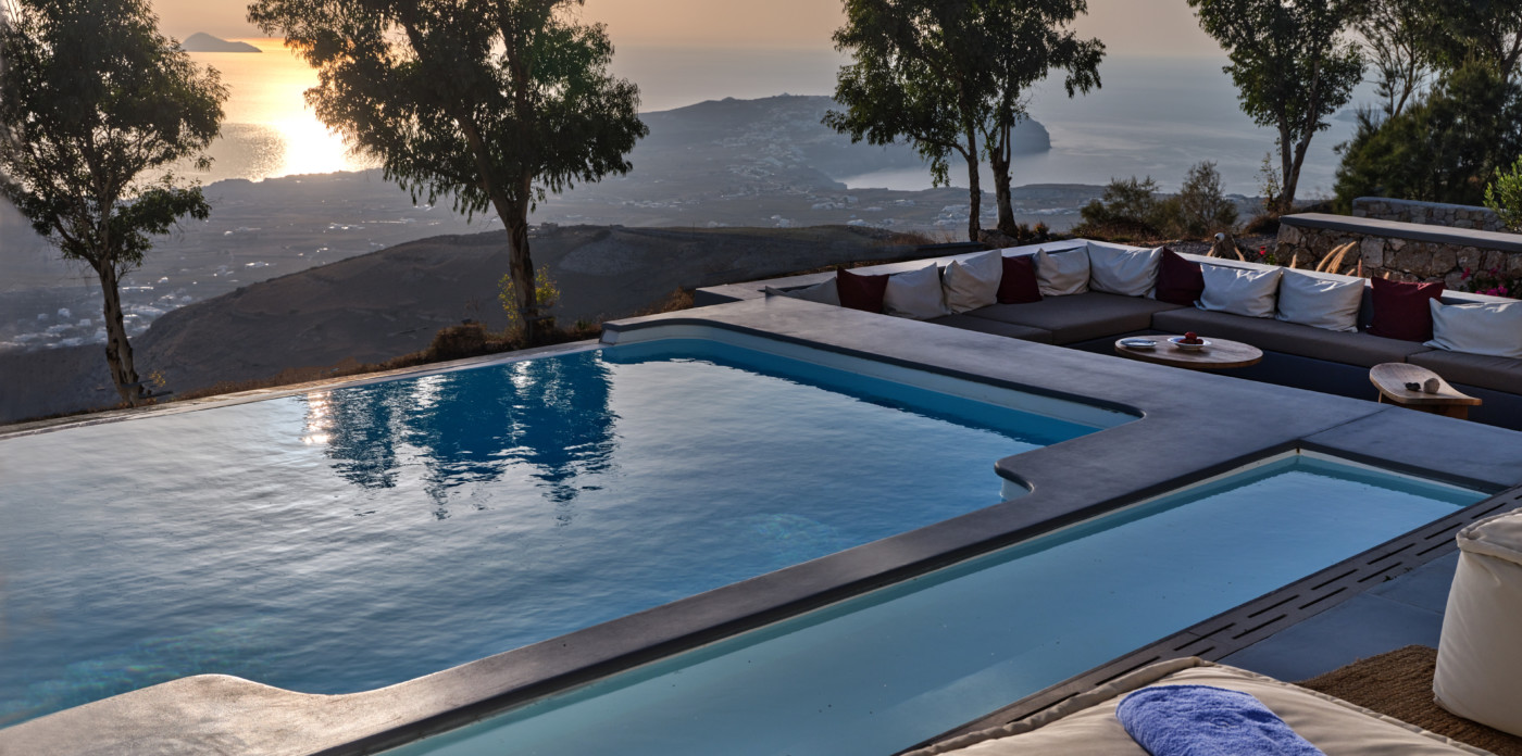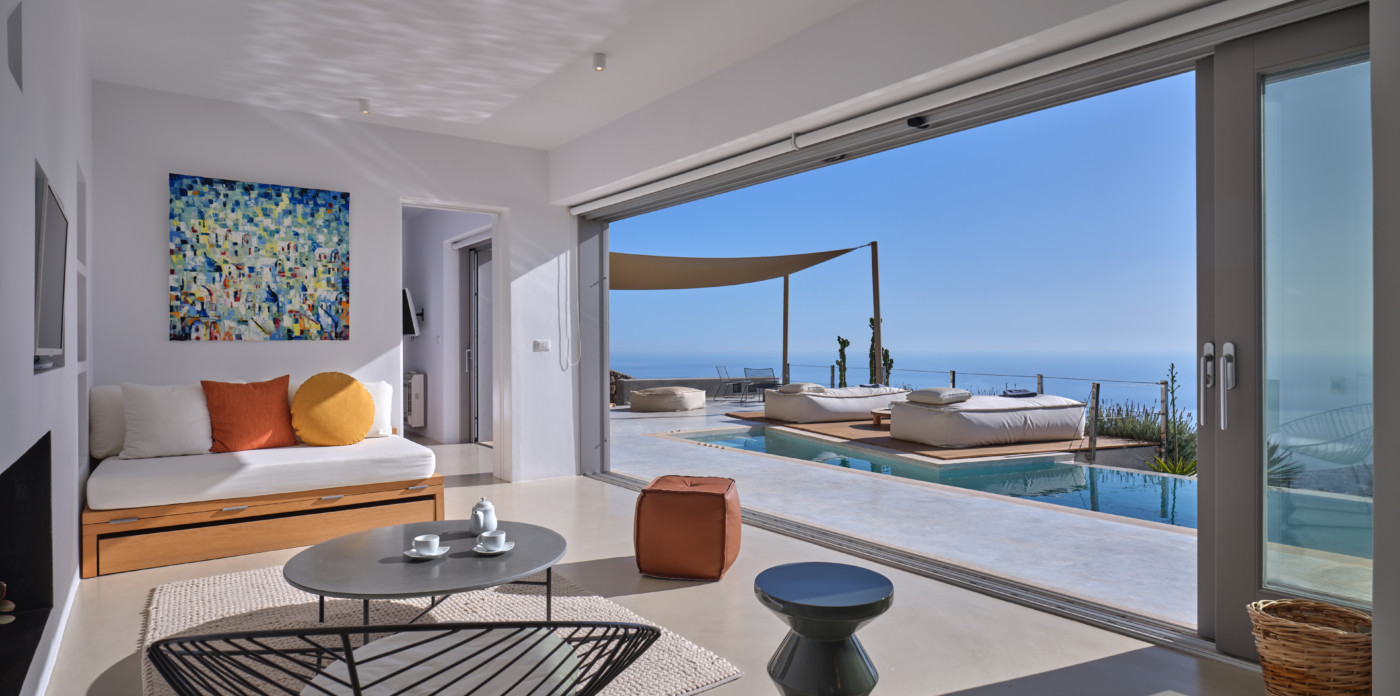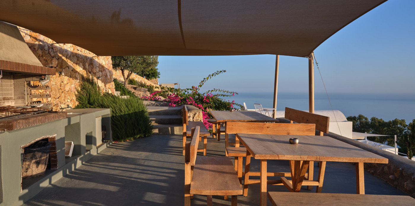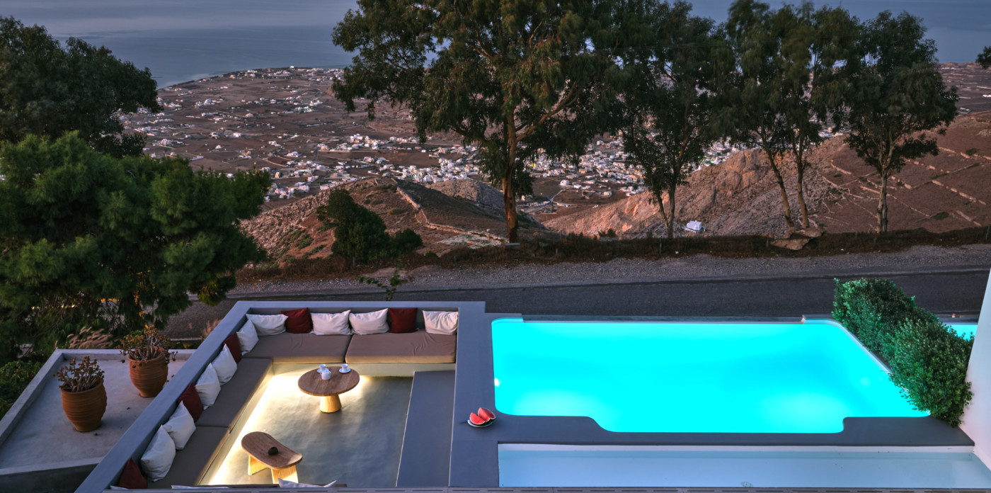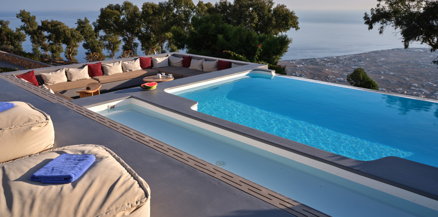 A heated infinity pool on the villa’s terrace and shady dining area overlook sweeping views of Santorini and the Aegean.