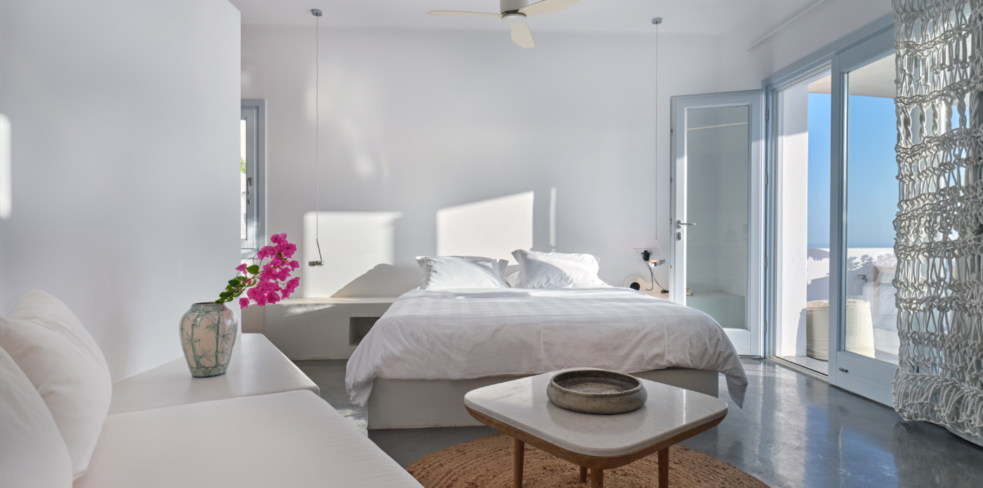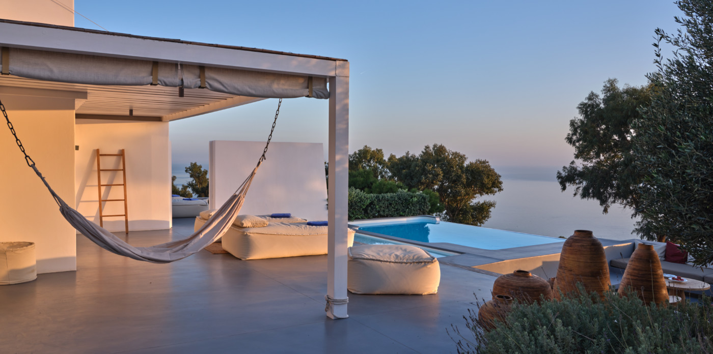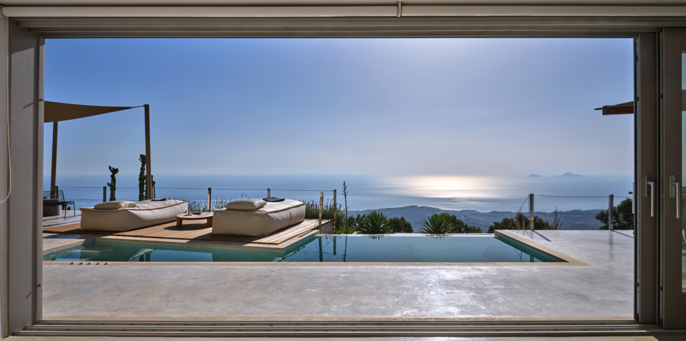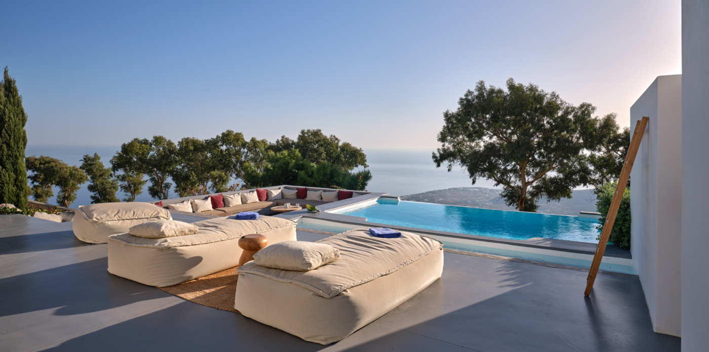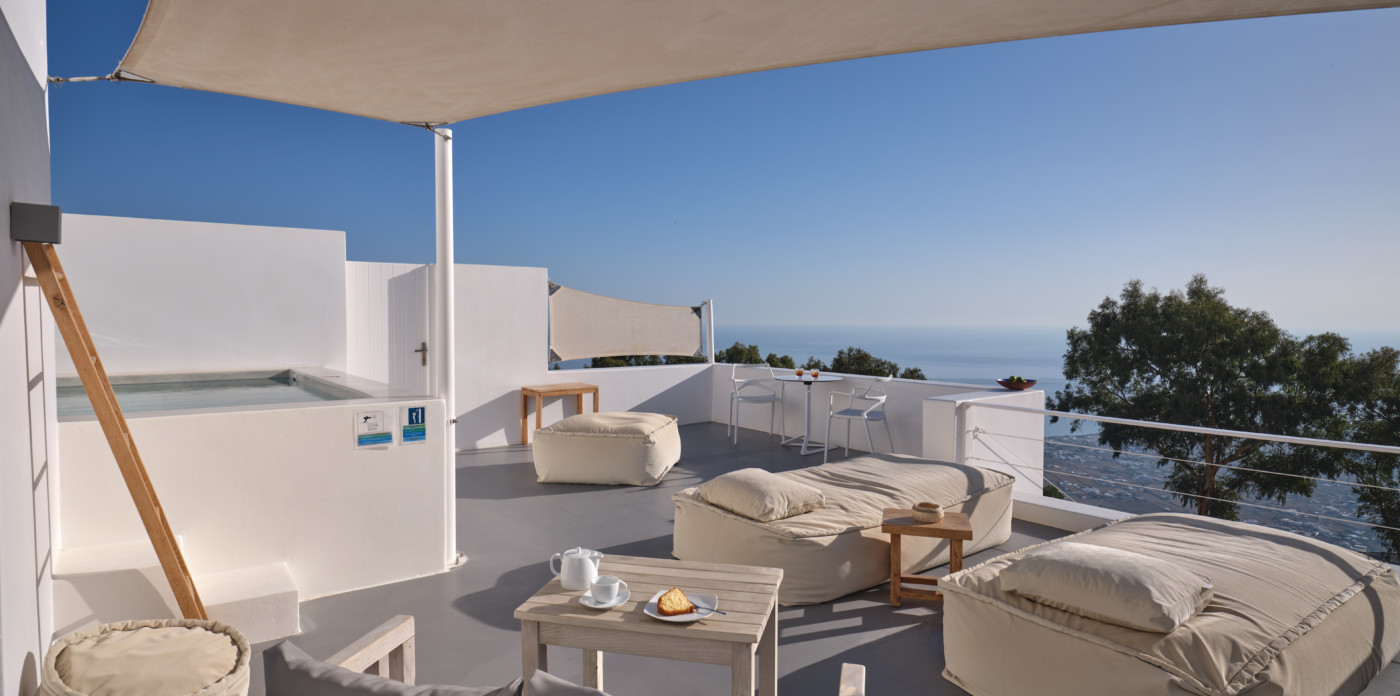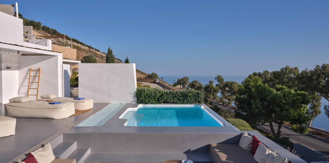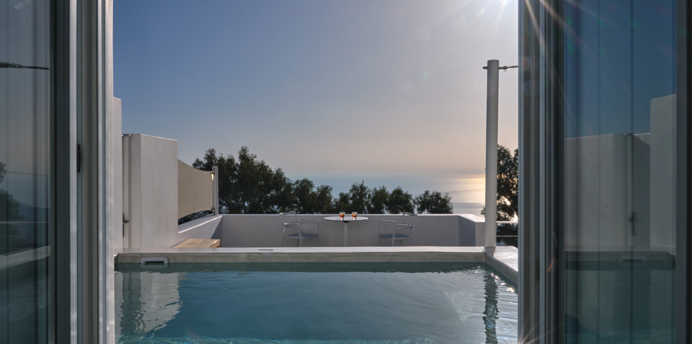 A heated infinity pool on the villa’s terrace and shady dining area overlook sweeping views of Santorini and the Aegean.