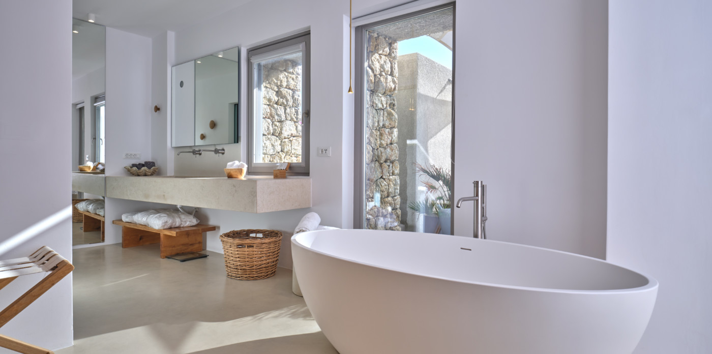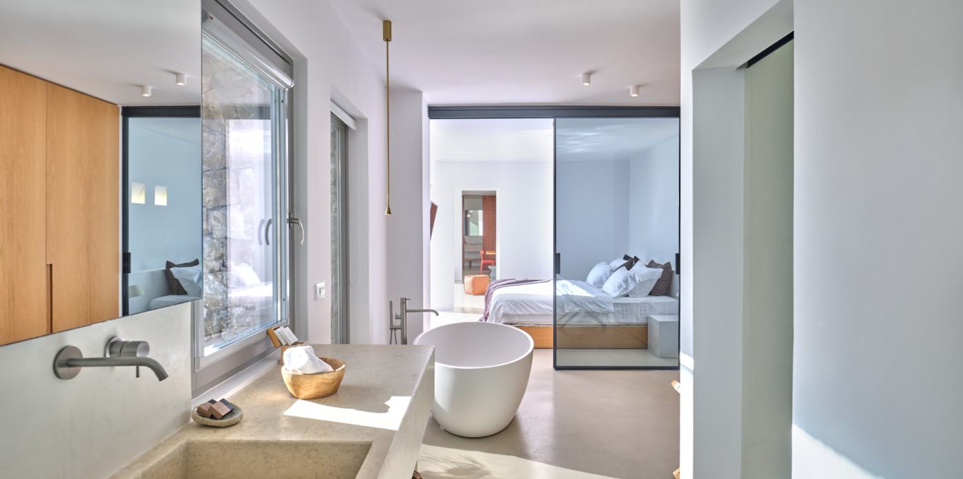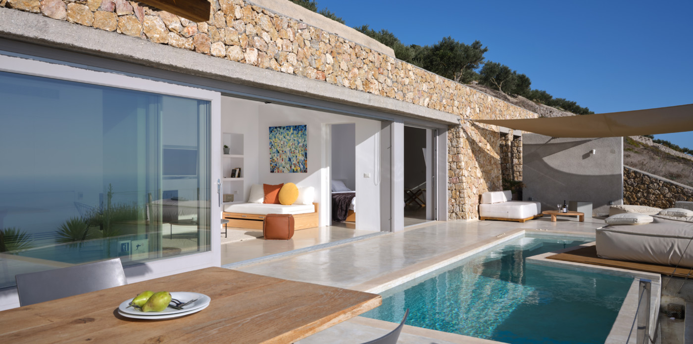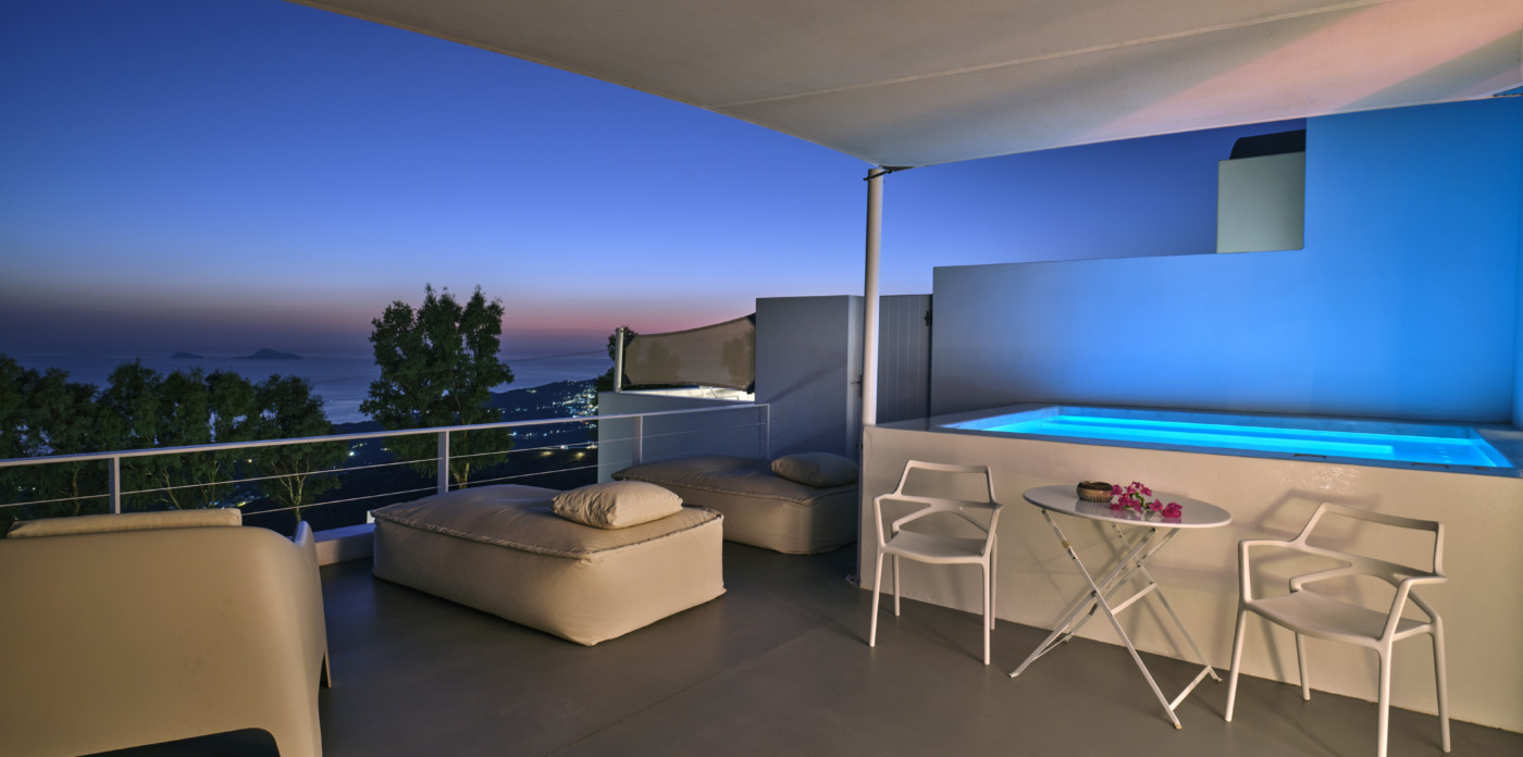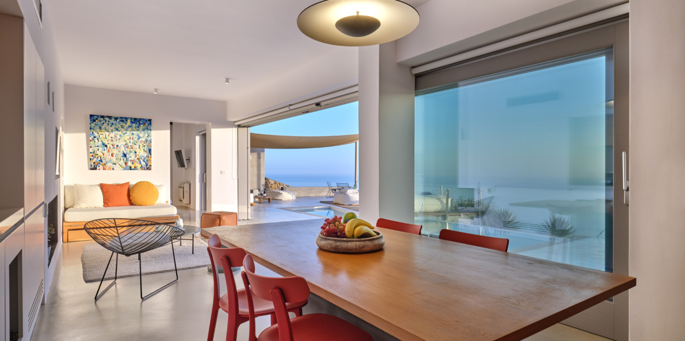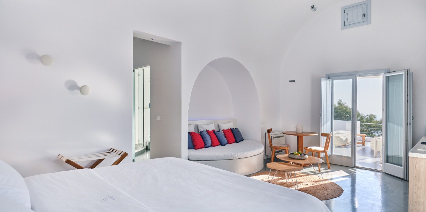 A heated infinity pool on the villa’s terrace and shady dining area overlook sweeping views of Santorini and the Aegean.