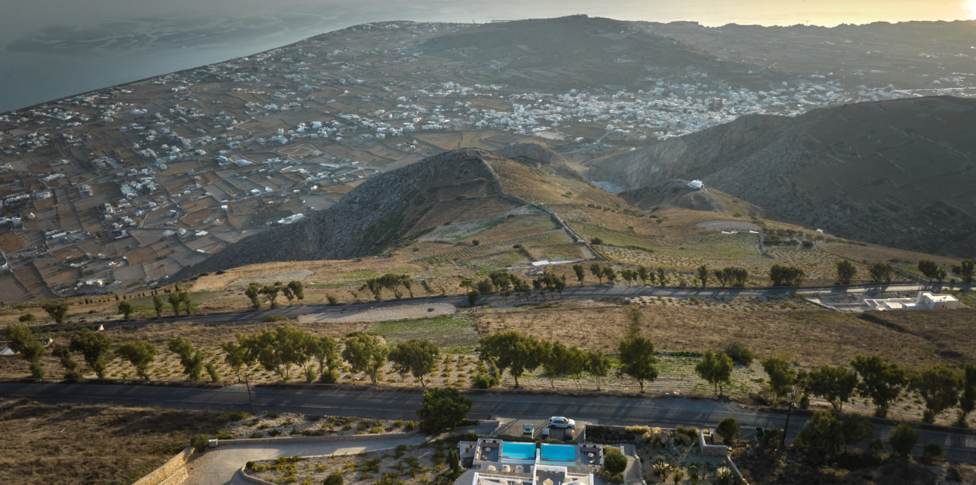 The Harpa Estate is located in the picturesque hilltop village of Pyrgos Kalisti and just 9 kilometers from Perissa, Santorini’s famed black sand beach.