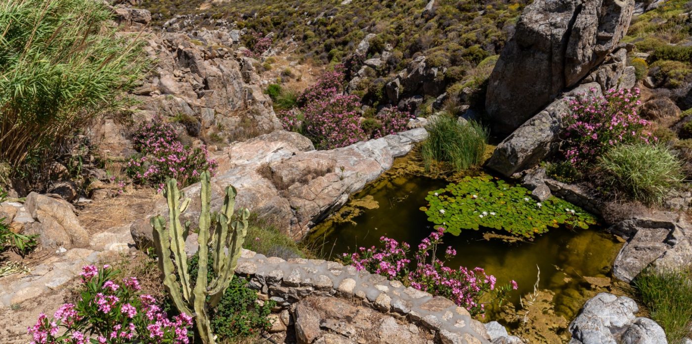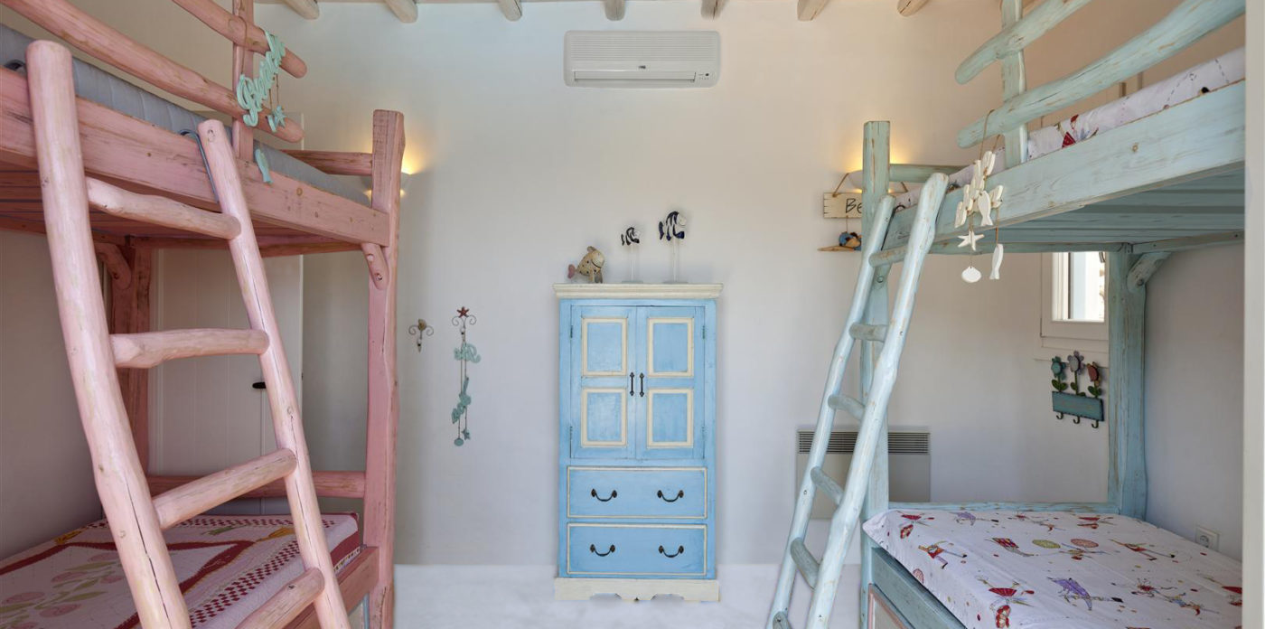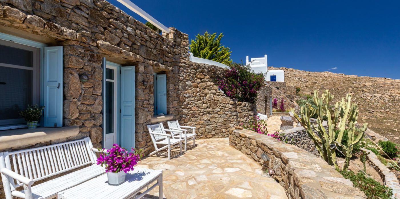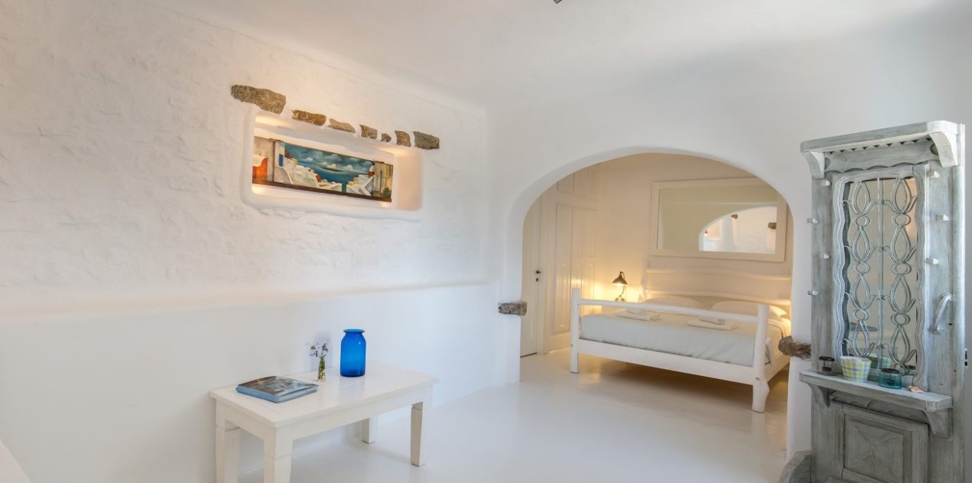 Agrari Beach, with its intimate charm and crystal clear water, is just a quick 10 min walk downhill. The villa’s charming interior, schemed in light blue, white and ochre, could be described as “beach house style” combining traditional elements of Cycladic architecture with provincial selected details.
