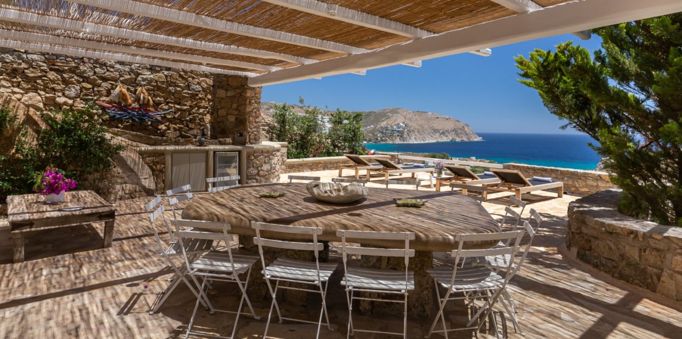 The outdoor spaces of the Hidden Secrete surrounded by rocky hills and Mediterranean herbs, embrace the true spirit of summer life as they allow living each moment of the day in total comfort and relaxation. An array of two-level sitting areas and one distinct dining/lounge pergola-shaded area, paired with a stone-sculpted dining table and a traditional wood fire BBQ, is offering guests a perfect entertaining area. An elegant infinity pool surrounded by a very spacious sun deck with comfortable summer furniture dominates the villa’s terrace well accompanied by a covered pergola providing shading. The fully equipped kitchen with modern appliances gives onto a pleasing living-sitting space directly accessing the swimming pool and its wide terraces.
