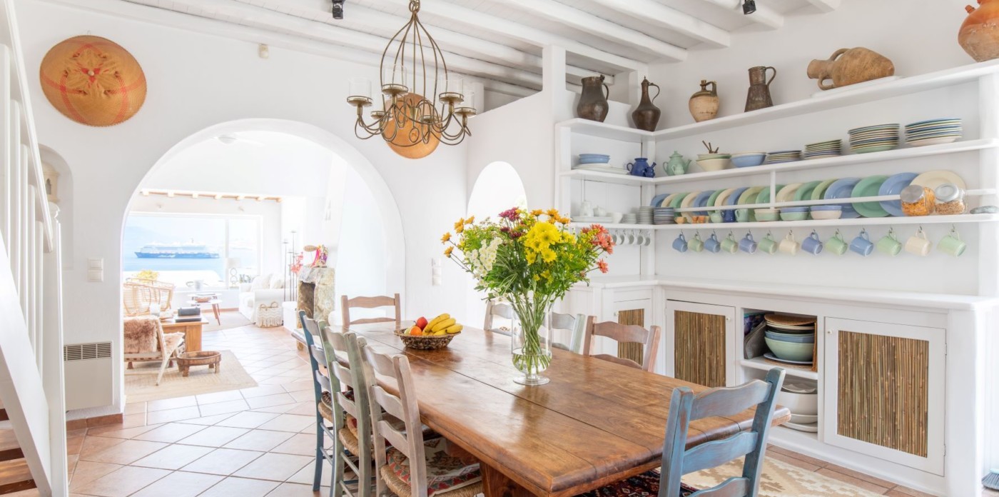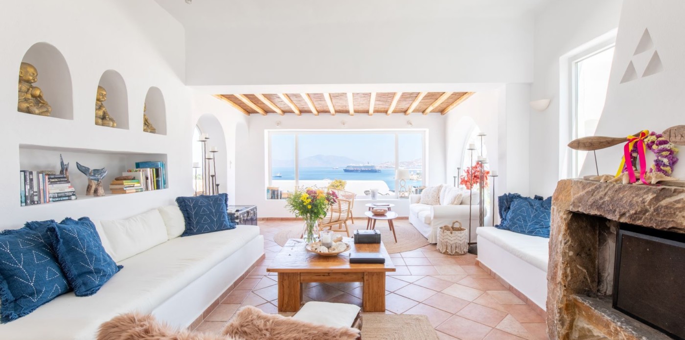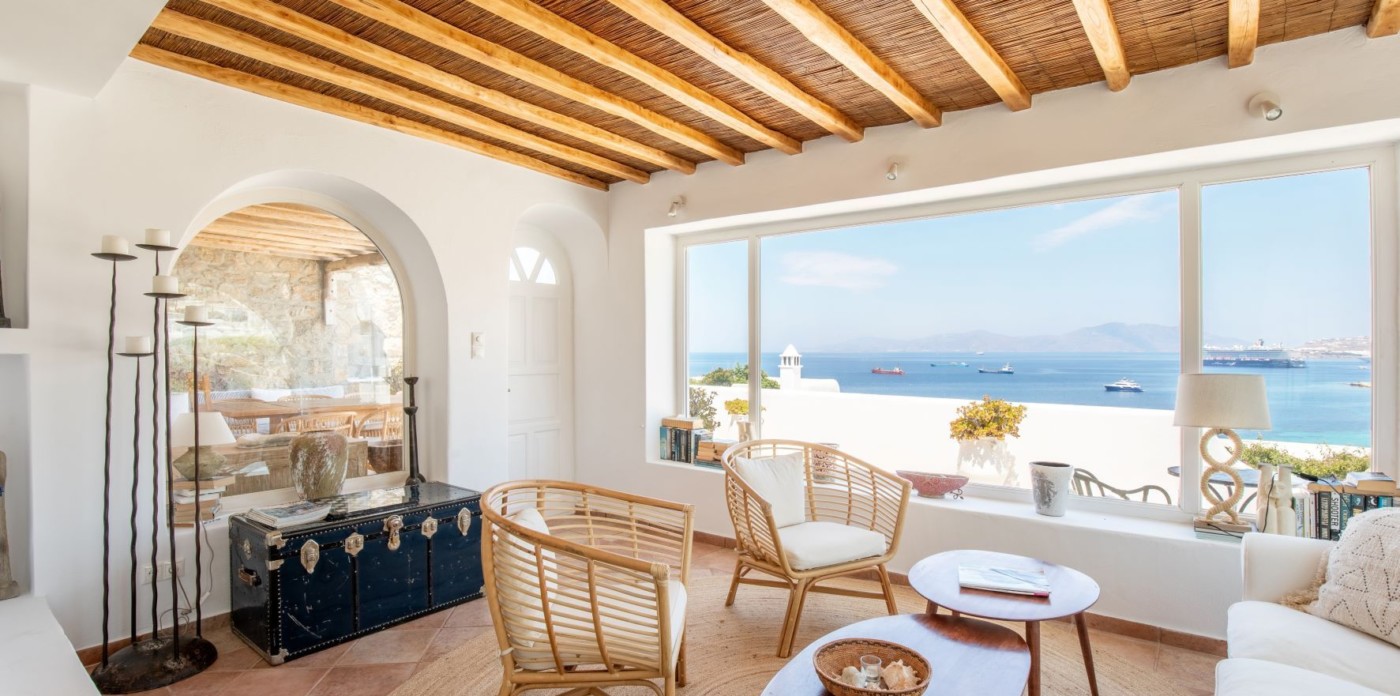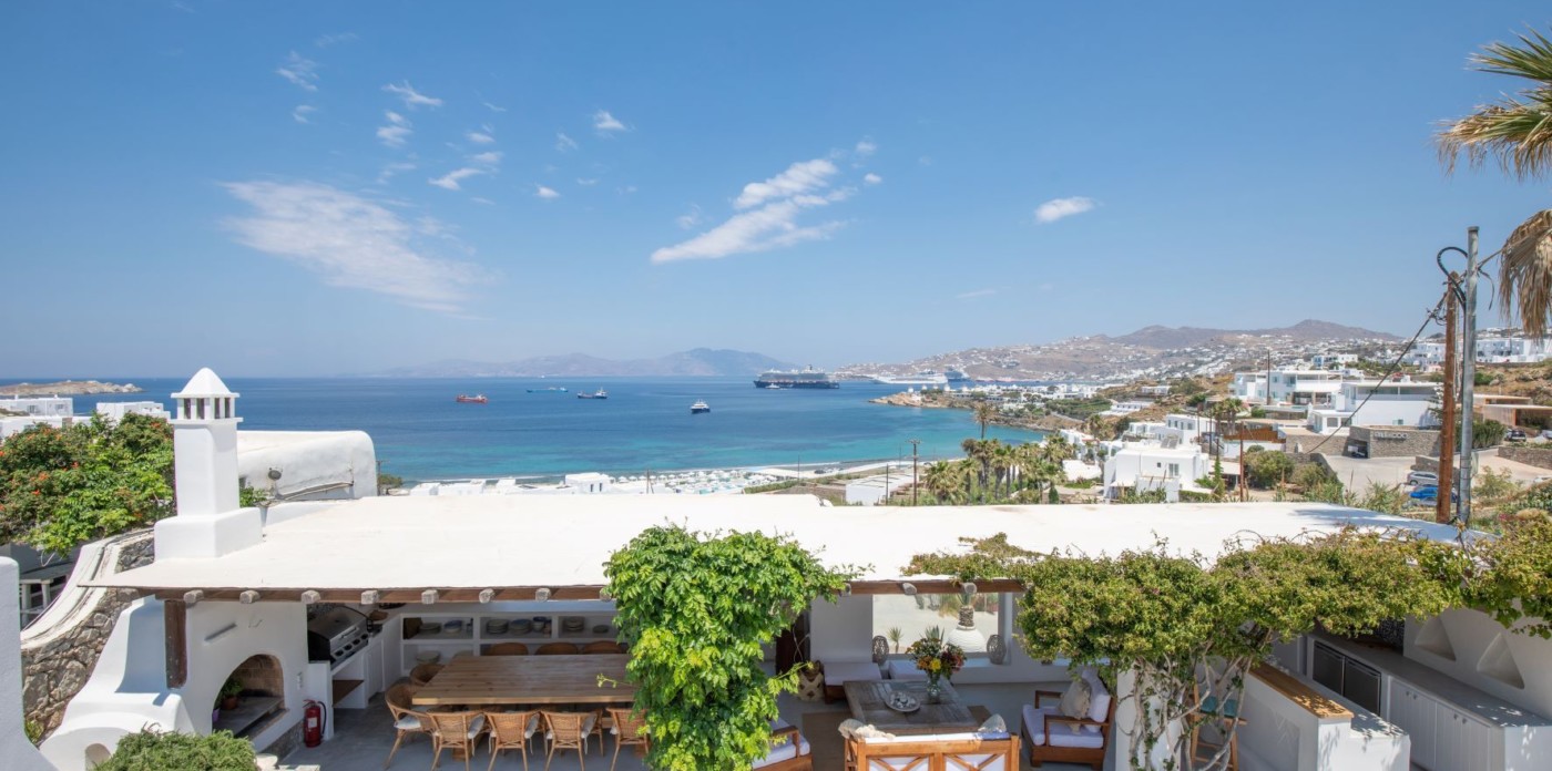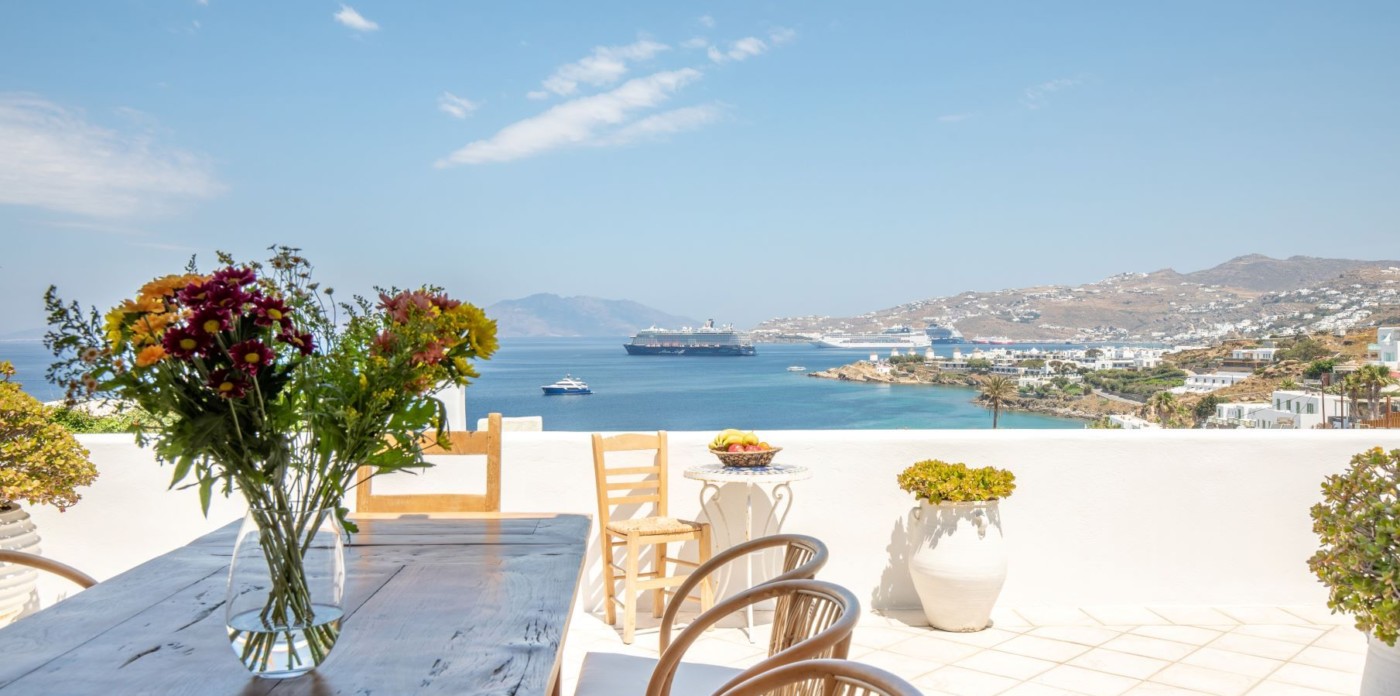 This savvy home inspires energy and a cosmopolitan flair with its perfect positioning right above of it all. Sit back and enjoy the cruise ships and the sailing yachts as they come in to dock and be part of the cosmopolitan and luxurious lifestyle Mykonos has to offer.