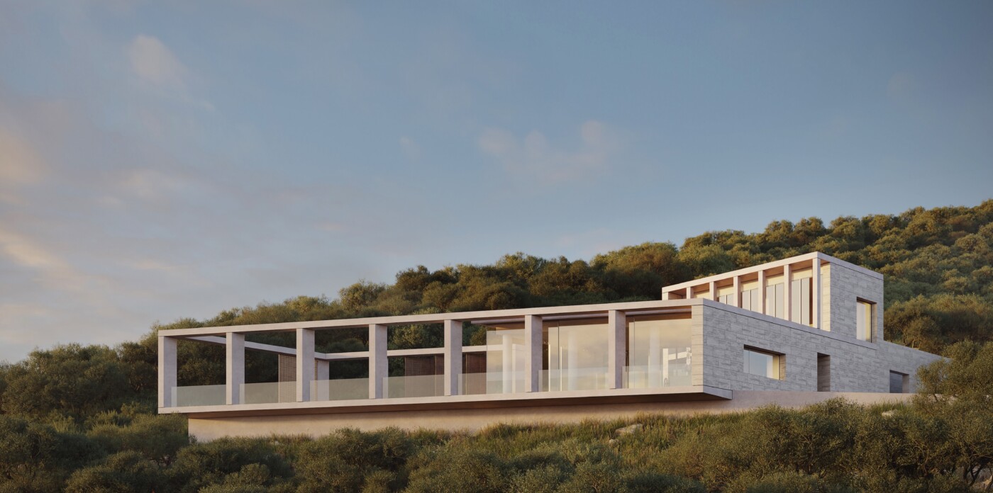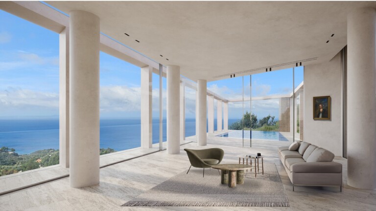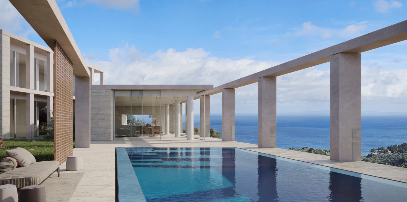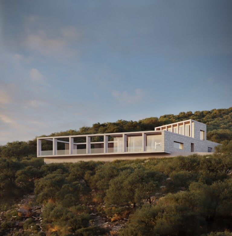 Set on a hillside in Vasilikos, near Kaminia Beach, “Indigo” overlooks the Ionian Sea with uninterrupted views, defined by a contemporary architectural approach and its connection to the landscape.