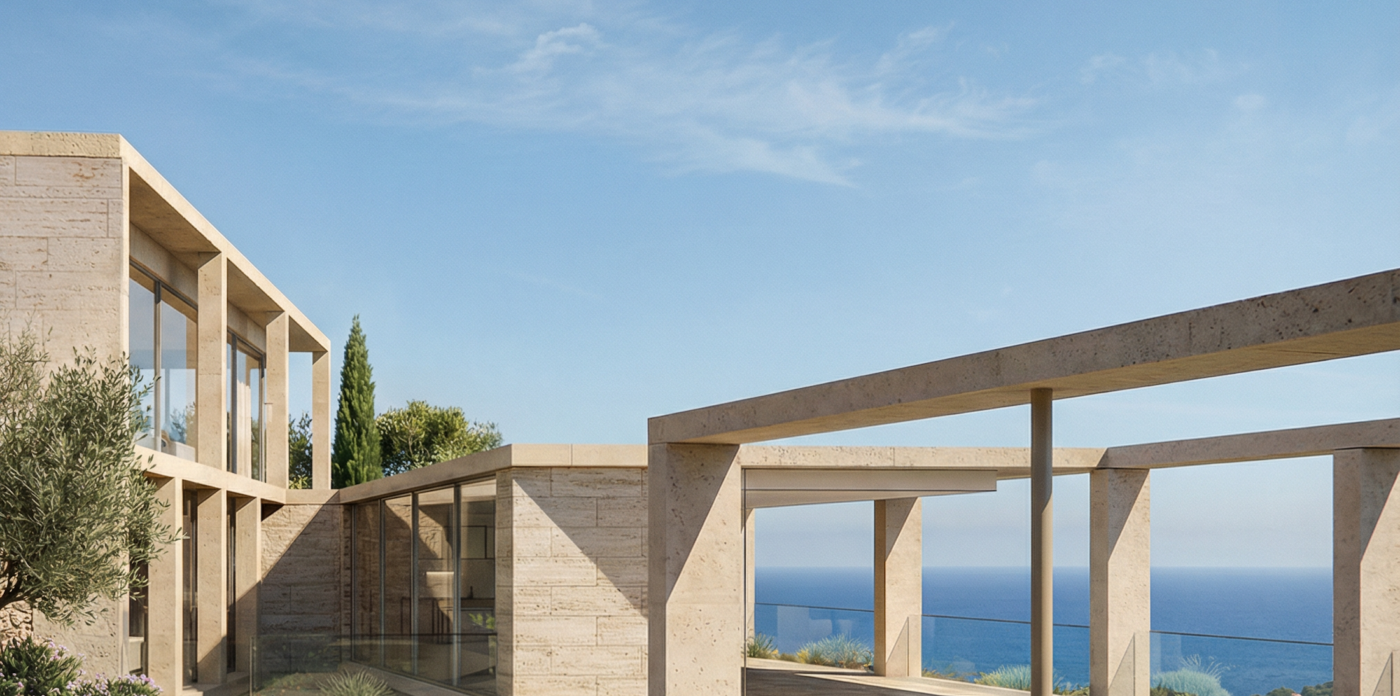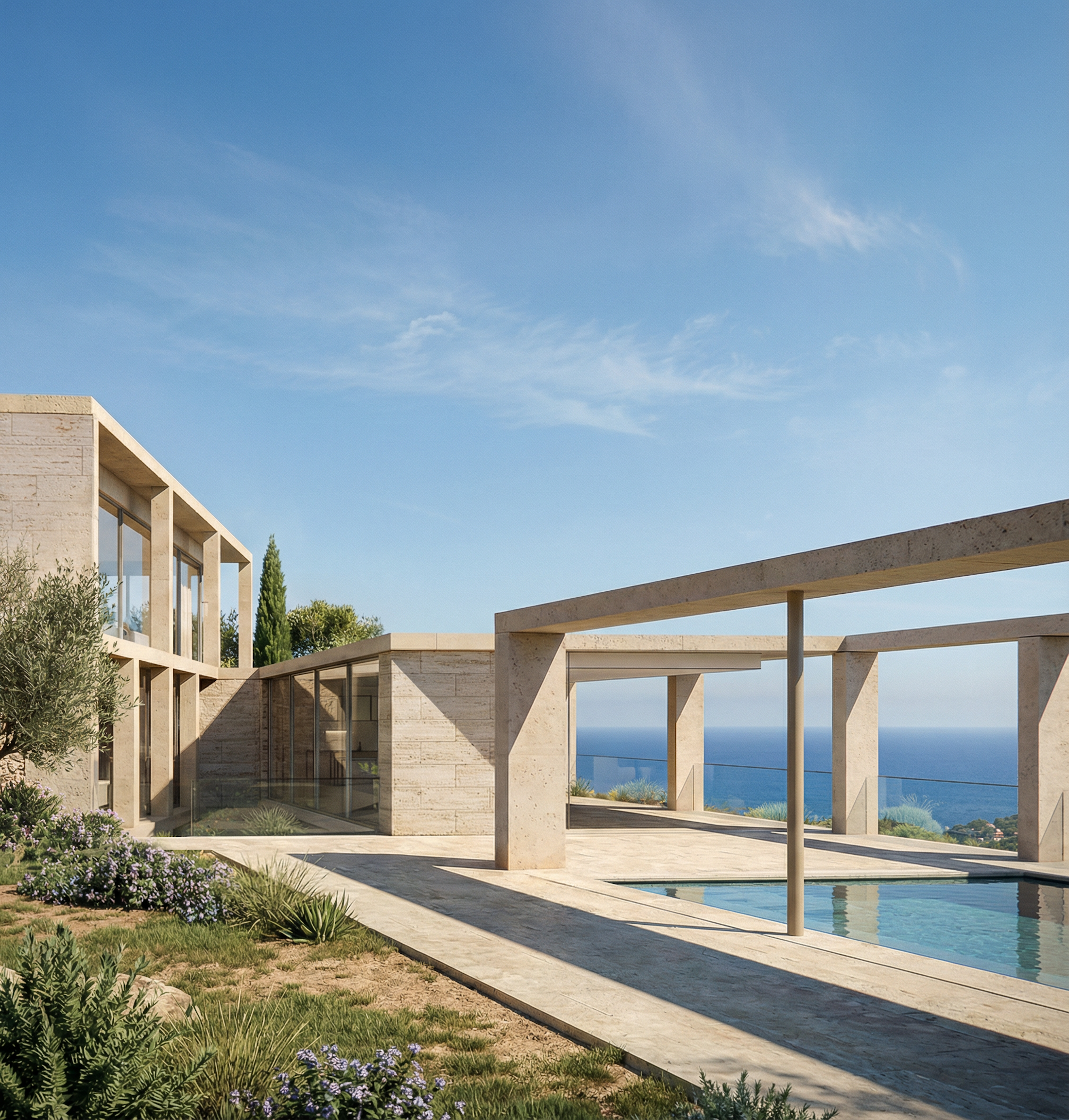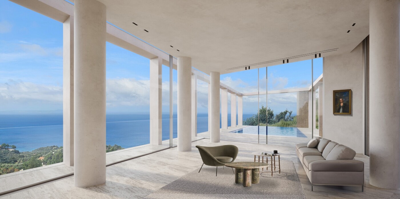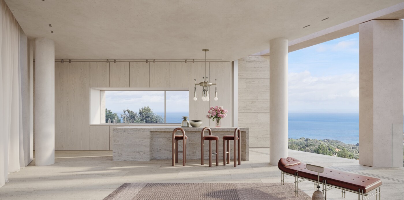 The villa is organised around an open-plan living space, where the sitting, dining, and kitchen areas connect directly. Floor-to-ceiling glazing opens onto a large terrace oriented towards the sea.