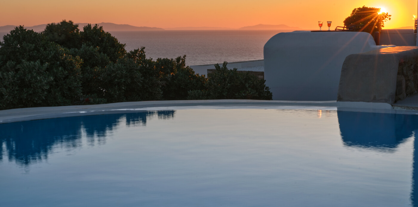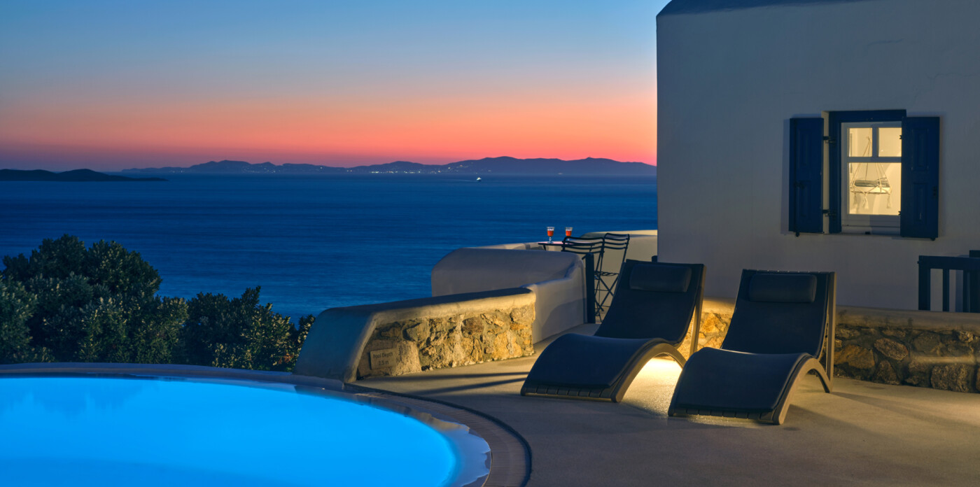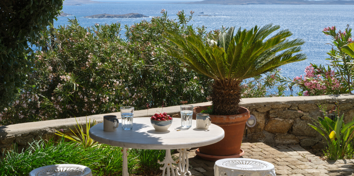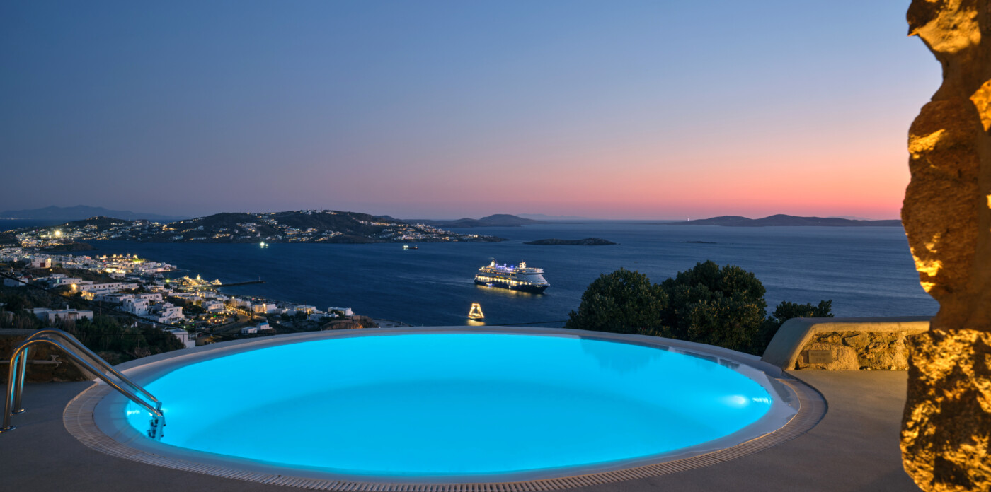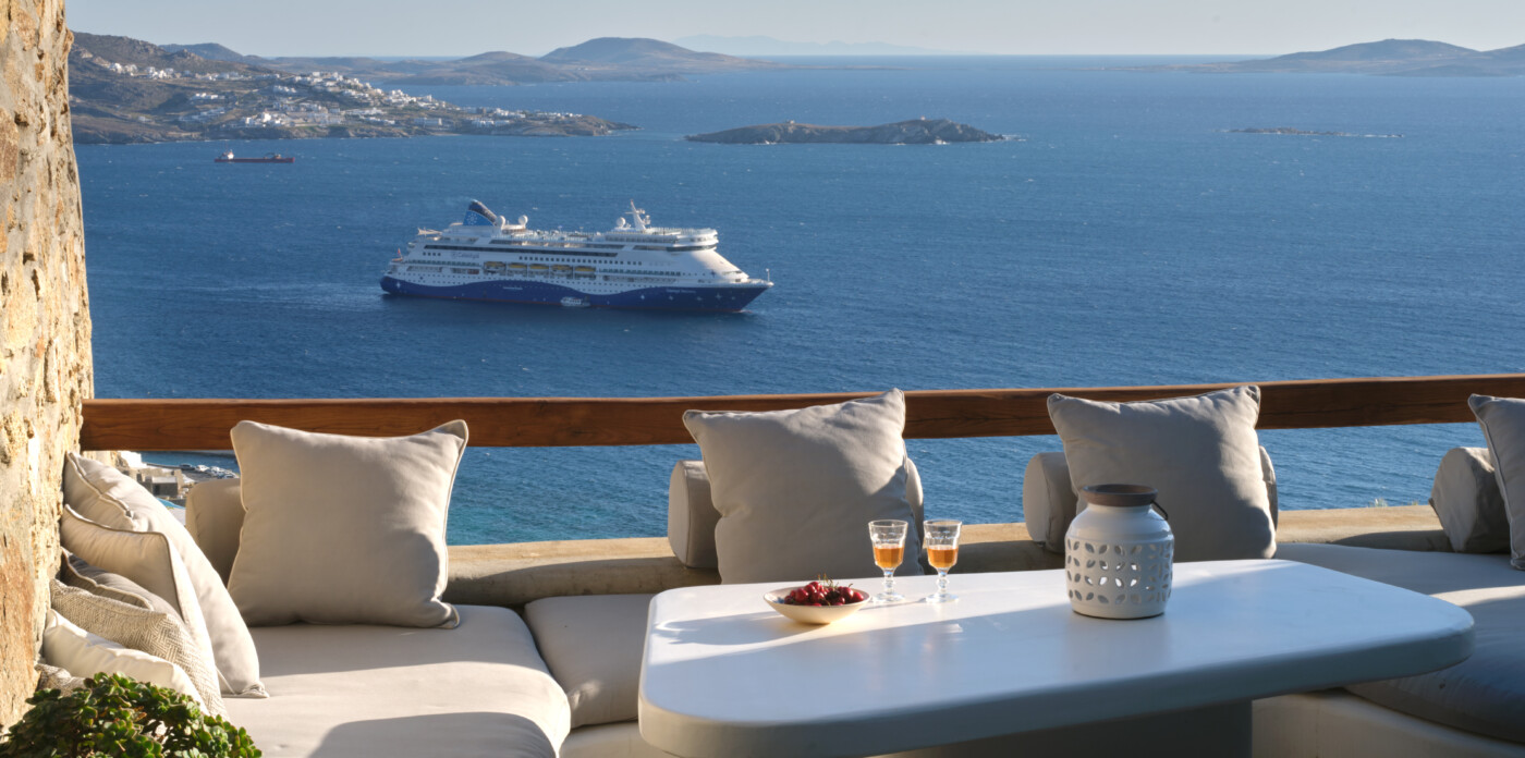 Set on a beautifully landscaped plot, the property’s elevated position shelters it from the winds, offering uninterrupted views of the ports and Mykonos town.