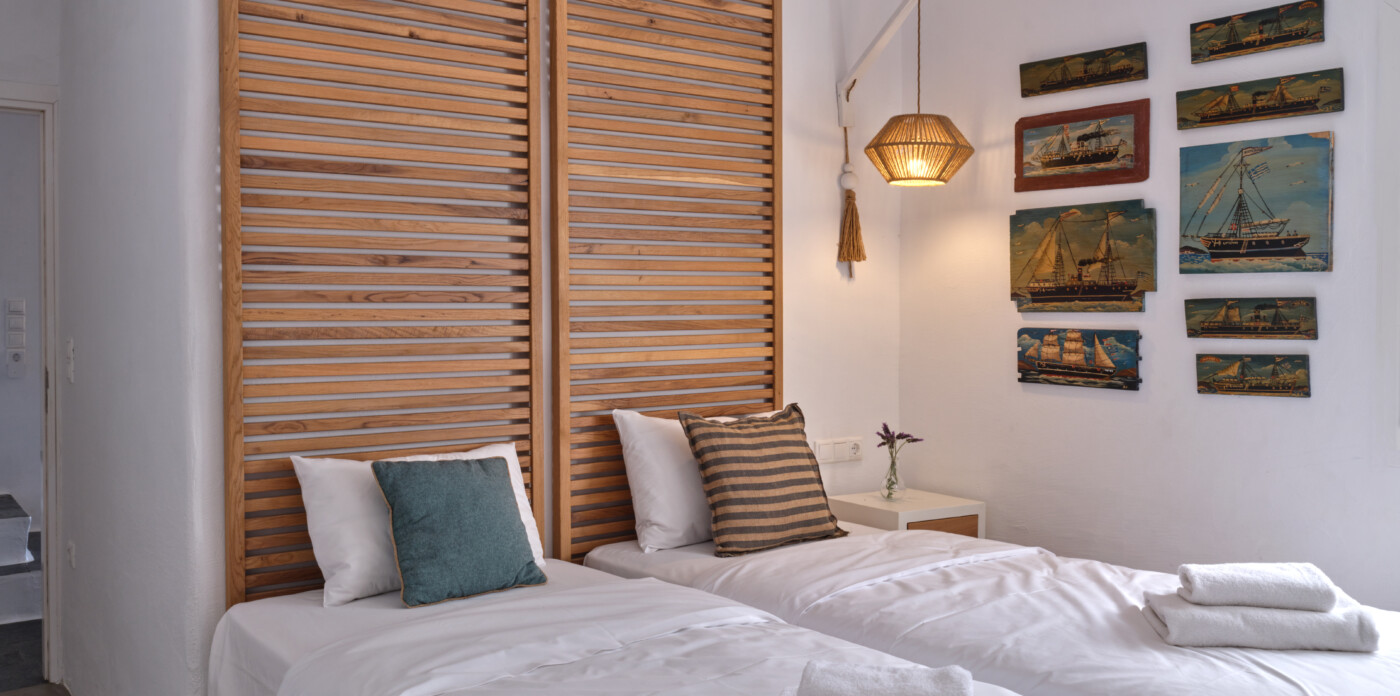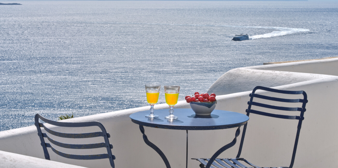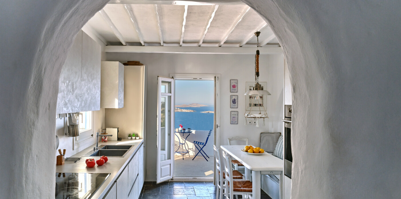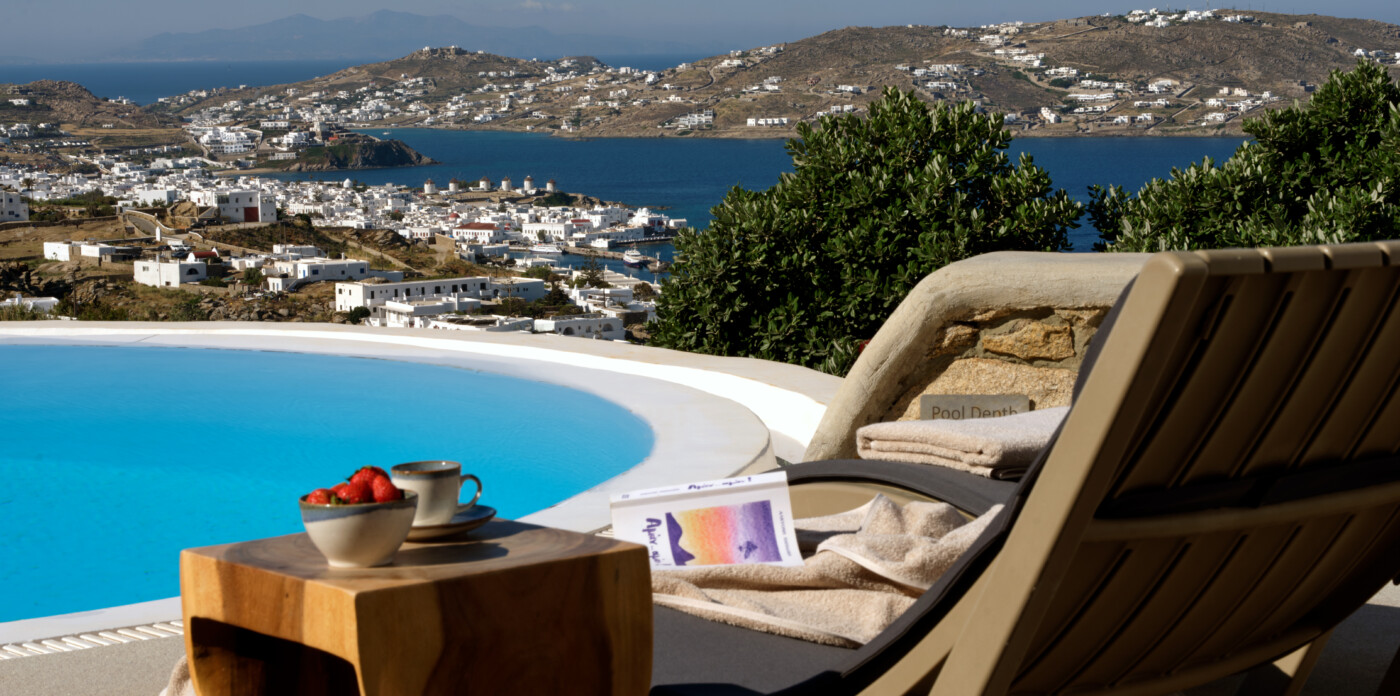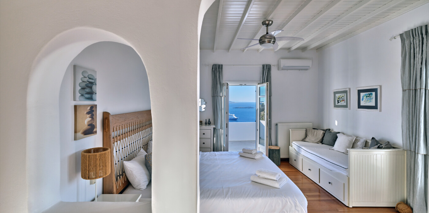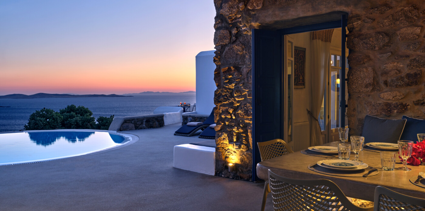 Set on a beautifully landscaped plot, the property’s elevated position shelters it from the winds, offering uninterrupted views of the ports and Mykonos town.