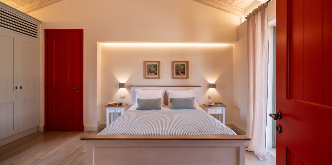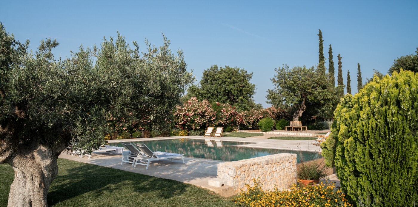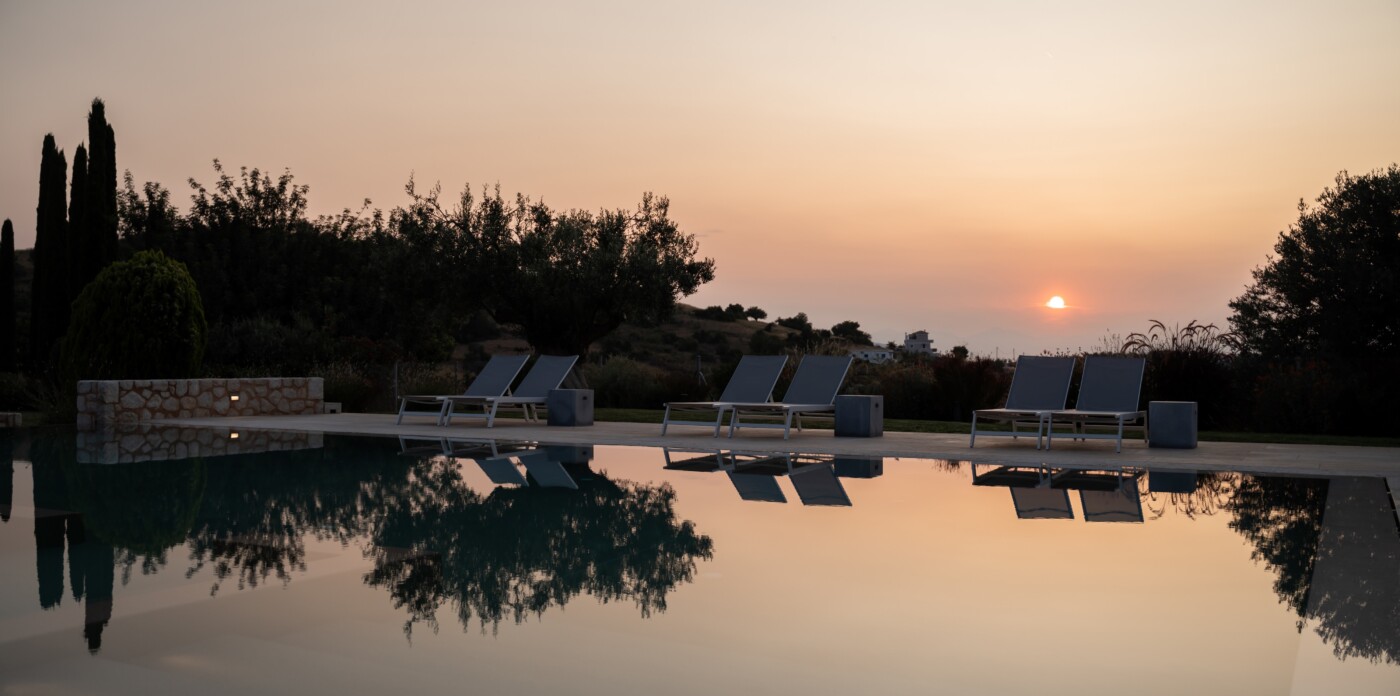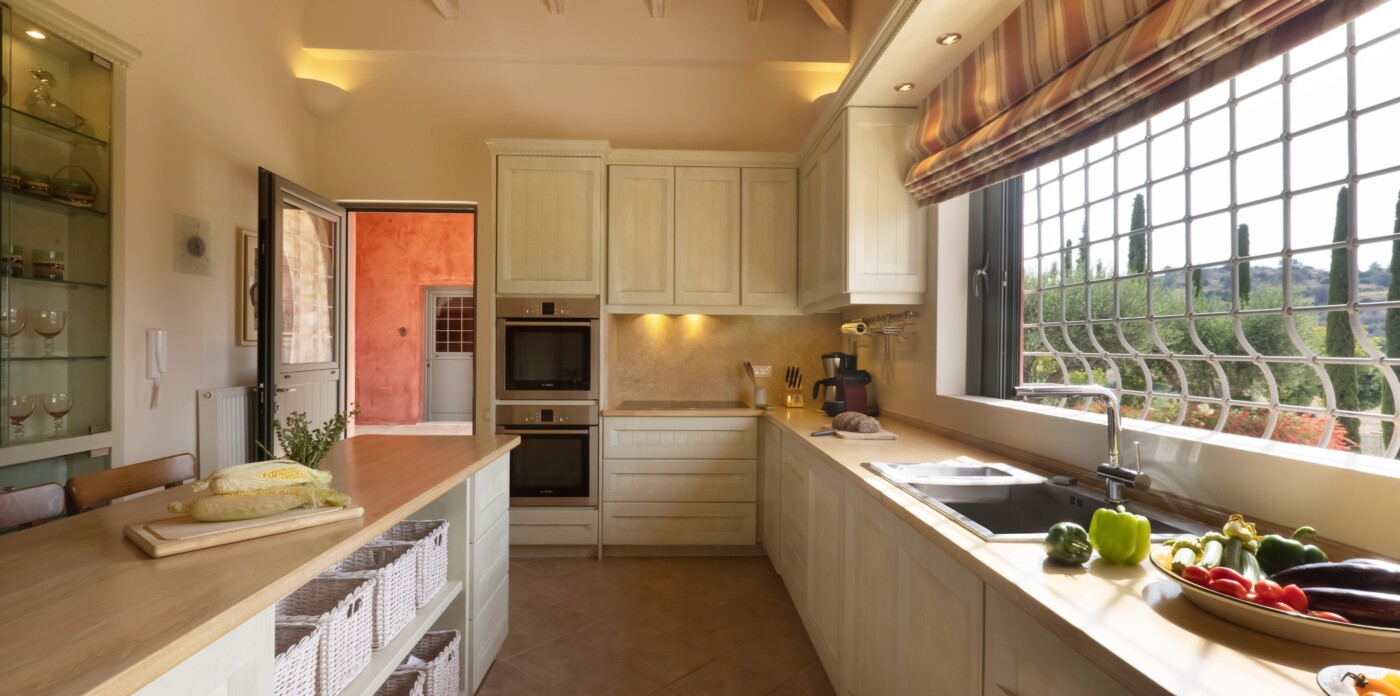 The outdoor areas of Kallia are designed for both relaxation and recreation. Lush gardens surround the estate, filled with vibrant flowers, fragrant herbs, and an olive grove that reflects the region’s heritage. A sparkling swimming pool, framed by sun loungers and shaded seating areas, invites leisurely days, while an outdoor kitchen and barbecue area are perfect for al fresco dining.
