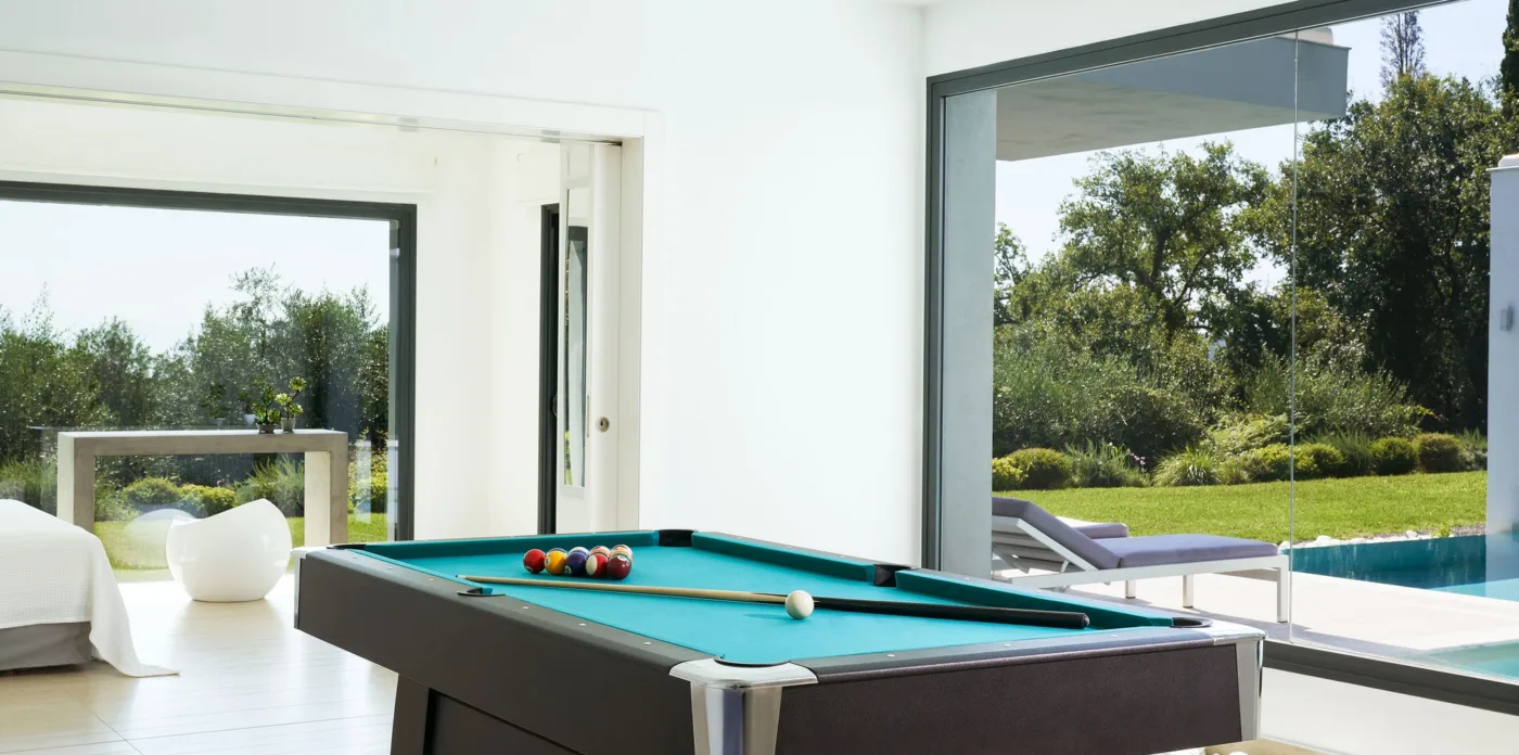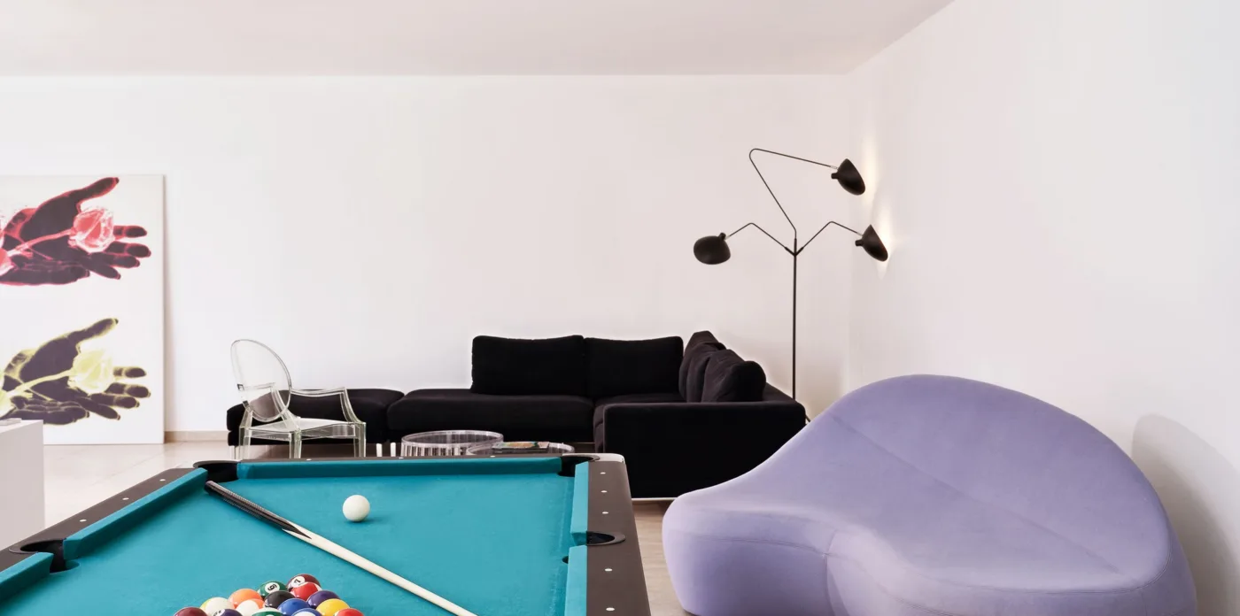 On this floor, is an open plan kitchen with breakfast bar, elegant dining room, living room with billiard table, a fully equipped gym, and a spacious bedroom with ensuite bathroom.