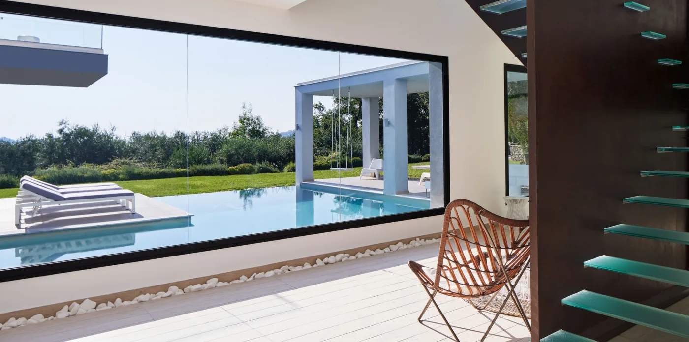 The main entrance opens to the main living area, with floor to ceiling windows seamlessly connecting the the exteriors with the interiors and allowing the space to be flooded with natural light.
