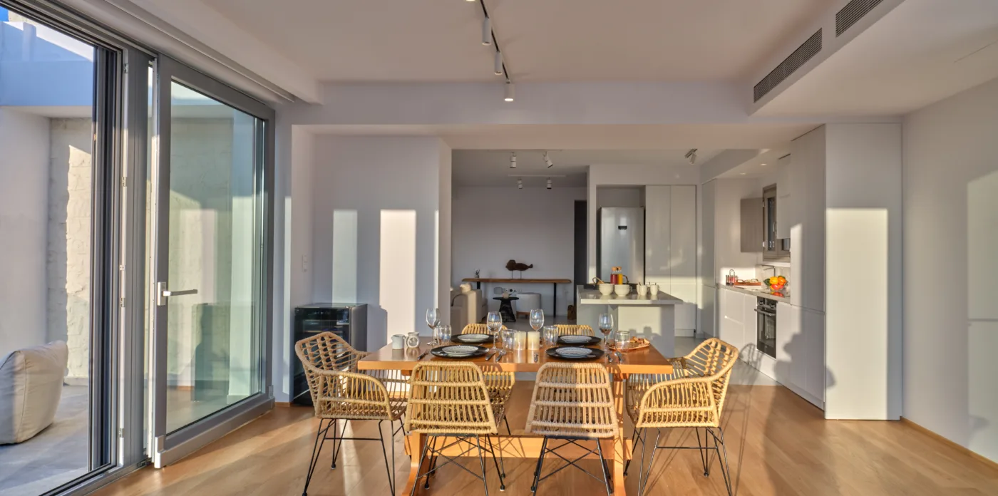 One prominent feature of the interiors is the floor-to-ceiling sliding glass windows. These windows not only flood the space with natural light, but they also merge the open plan living space and kitchen with the inviting outdoor terrace. This seamless connection to the outdoors creates a feeling of unity between nature and the interior environment. The living space is drenched in the views and the surroundings become an integral part of the lifestyle experience whilst also creating an added sense of expansiveness.