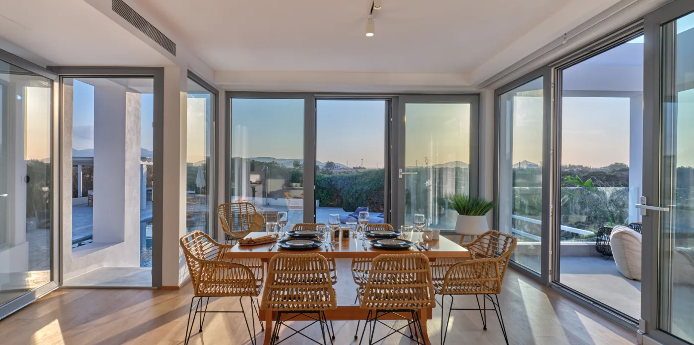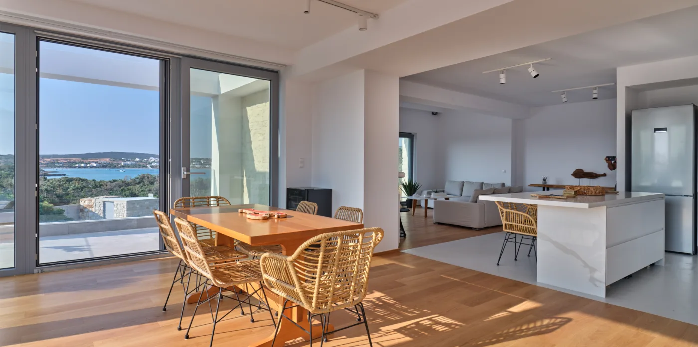 Masion de la Mer, located on the island of Paros, is a modern five bedroom villa that combines the beauty of its beachfront location with the tranquility of a nature protected area. The clean and sleek design of the minimalist interiors creates a sense of harmony, and the use of neutral colors and simple lines contribute to a minimalist aesthetic that is both calming and visually appealing.