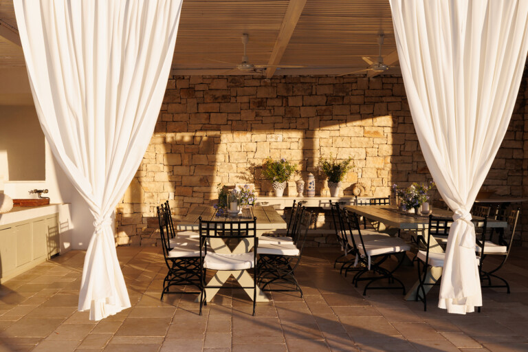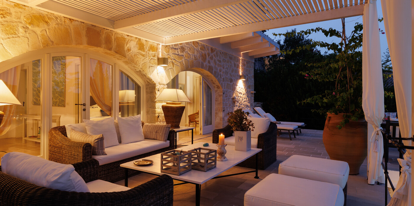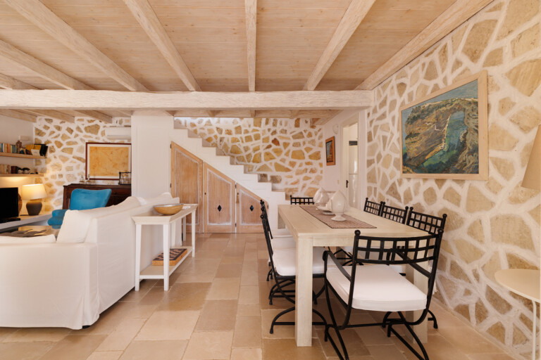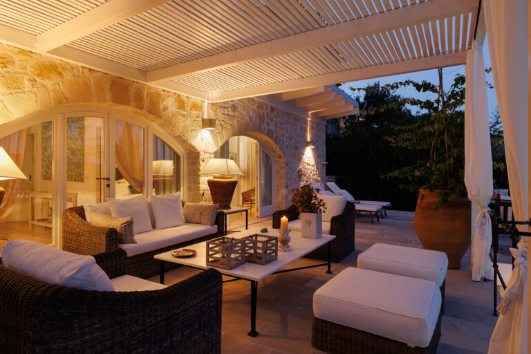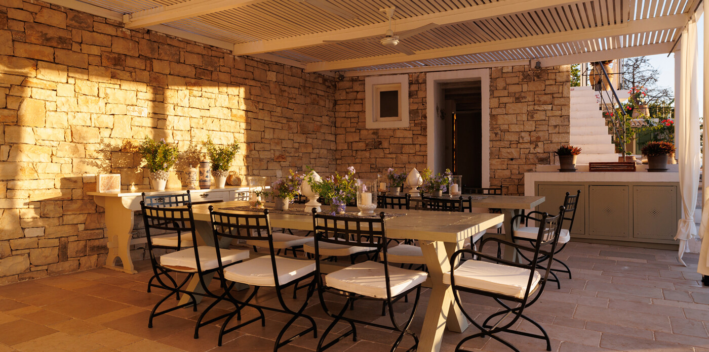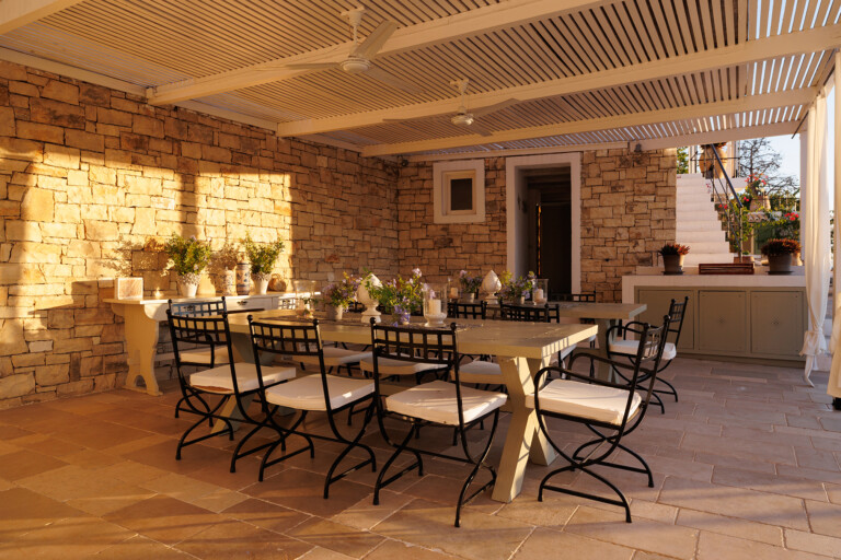 The estate is arranged around outdoor living, with a saline swimming pool (8m x 5m) at the centre of the garden. Stone-paved terraces, two outdoor kitchens, and a traditional pizza oven create a natural setting for open-air dining. Exterior lighting has been designed to shape the property after sunset. The grounds are defined by gentle level changes, adding dimension and a layered quality to the landscape, with some areas better suited to supervised access for younger children.
