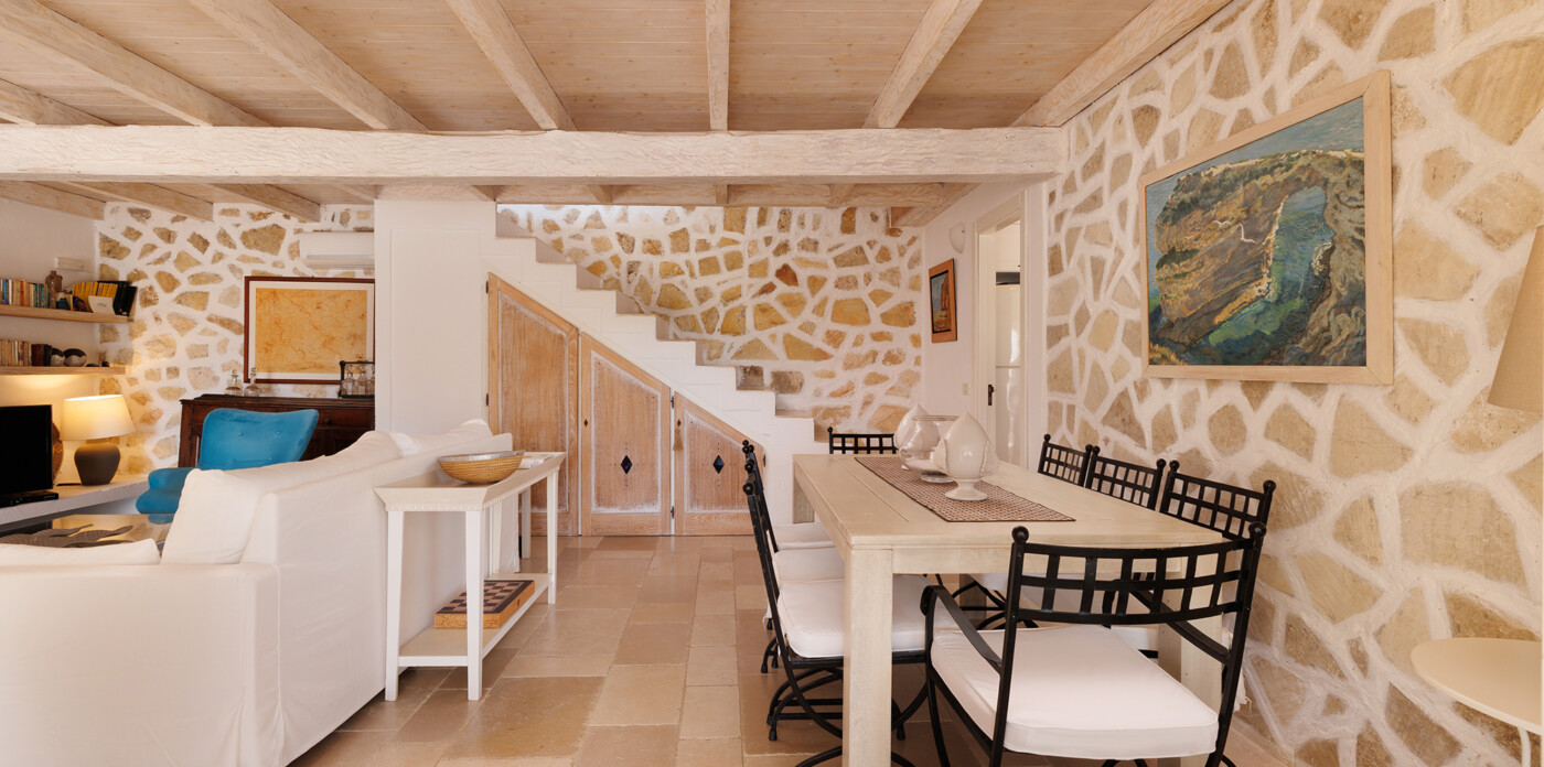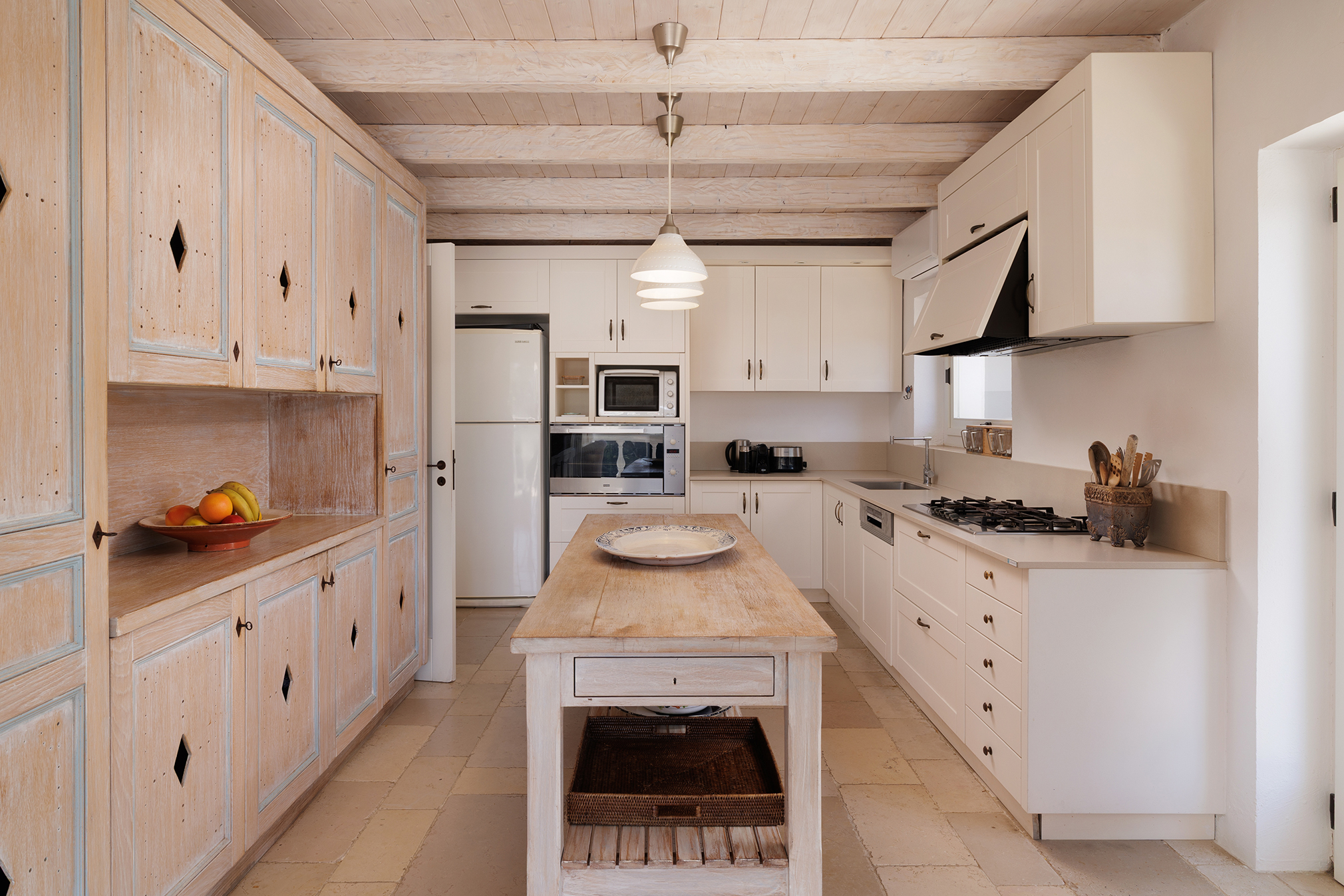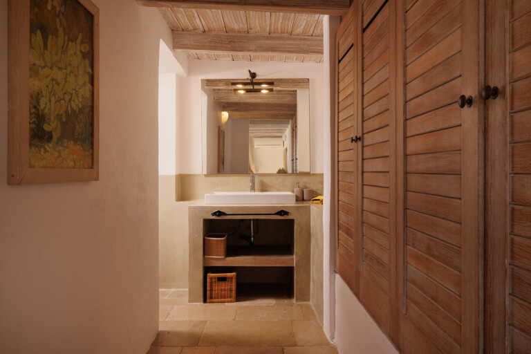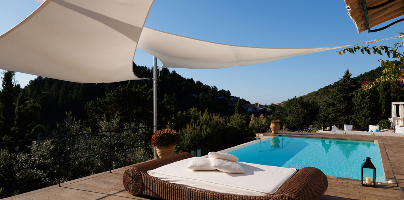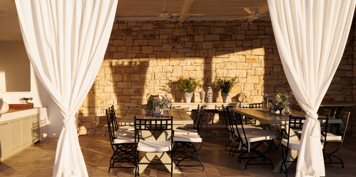 The estate is arranged around outdoor living, with a saline swimming pool (8m x 5m) at the centre of the garden. Stone-paved terraces, two outdoor kitchens, and a traditional pizza oven create a natural setting for open-air dining. Exterior lighting has been designed to shape the property after sunset. The grounds are defined by gentle level changes, adding dimension and a layered quality to the landscape, with some areas better suited to supervised access for younger children.