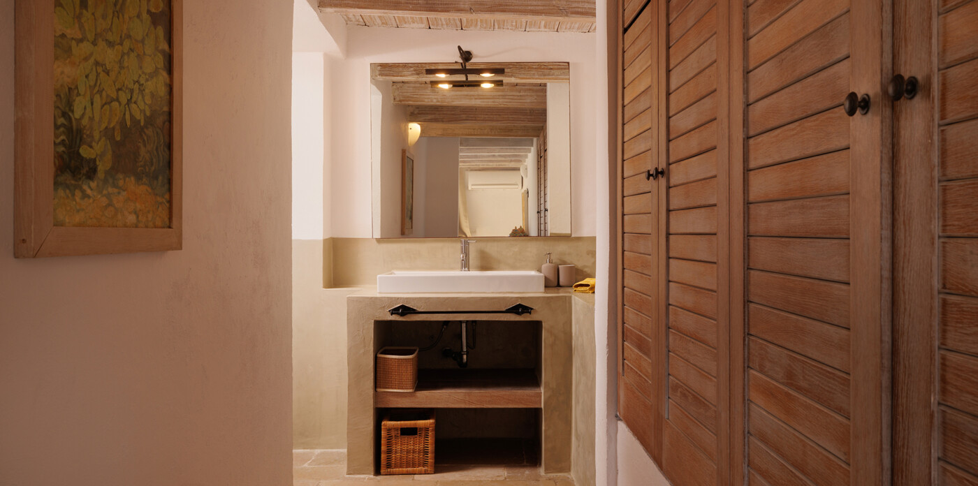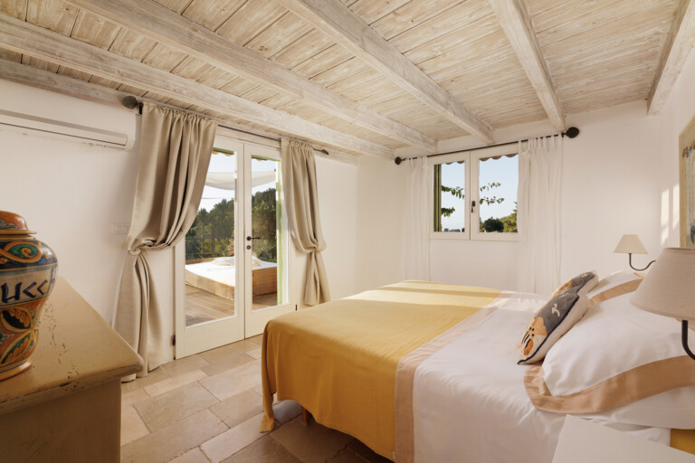 The main house includes a principal bedroom with king-size bed and en suite shower room, a twin bedroom with en suite, and a single bedroom with its own en suite and air conditioning, suitable for a child or staff. A fourth double bedroom with en suite and private entrance is positioned beside the pool.