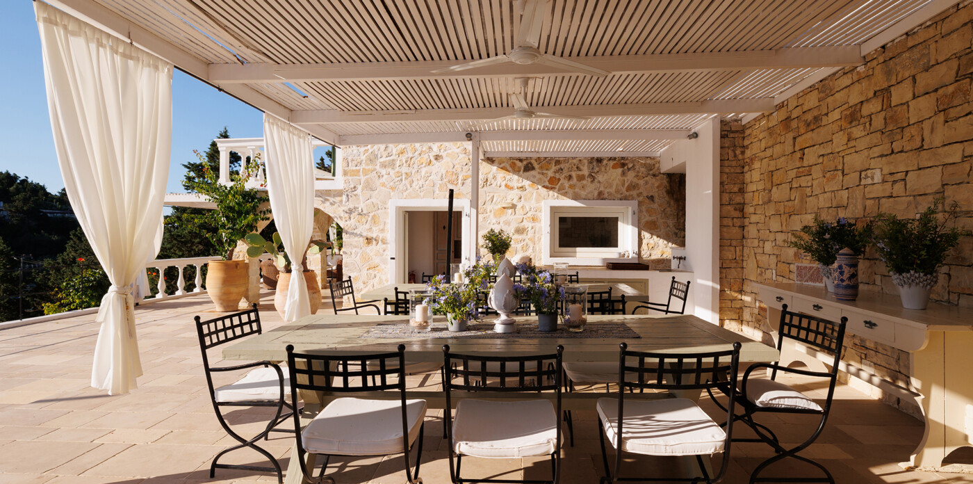 The open-plan kitchen and sitting room open directly onto a shaded outdoor lounge overlooking the pool and the sea, with wicker seating arranged for informal use. An adjacent outdoor kitchen supports outdoor dining.
