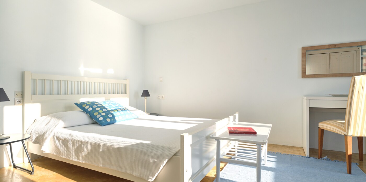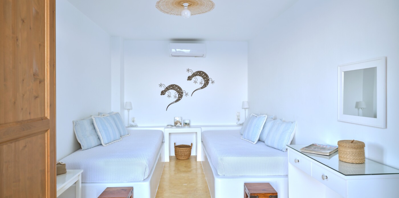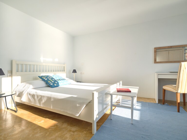 The main house extends across two floors, each accessible from the outdoors independently. On the ground floor, seamlessly integrated with the swimming pool area, you’ll find a welcoming living room with expansive built-in sofas, alongside a fully equipped open-plan kitchen and a dining room. This level also hosts a single bedroom with an ensuite bathroom for added convenience. Ascending to the first floor, you’ll discover three bright and generously sized bedrooms.