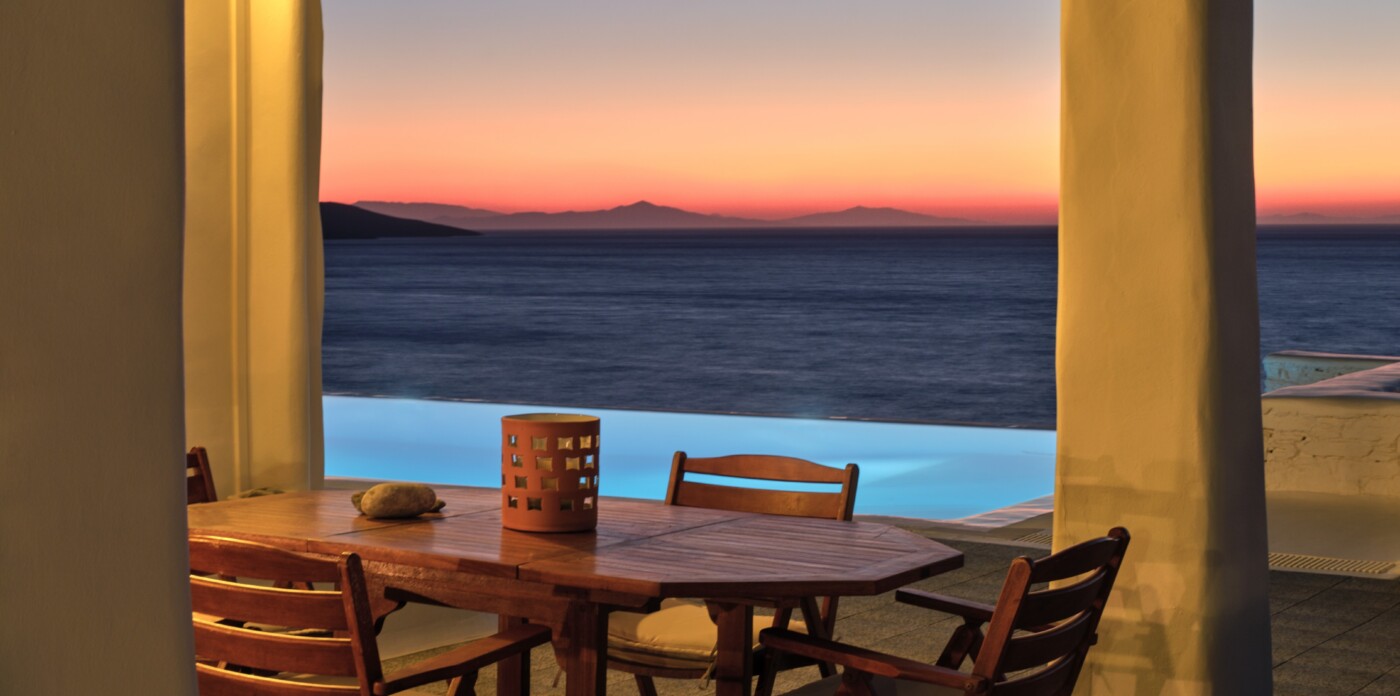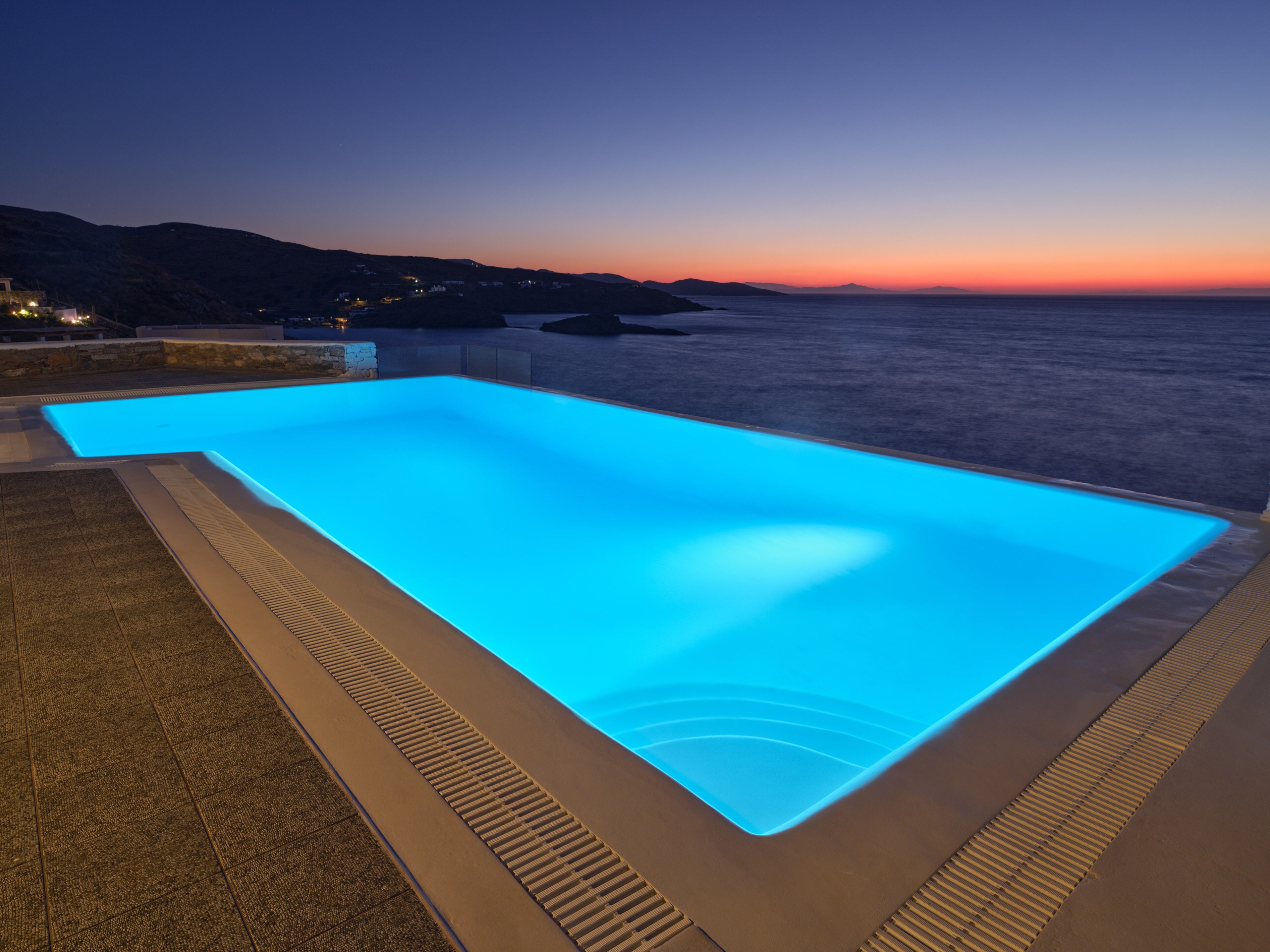 Outdoors, the private infinity seawater pool provides an idyllic setting for relaxation. The courtyard features a BBQ area adjacent to a shaded dining space. As the sun sets, the exterior lighting transforms Meraki into a mesmerising spectacle, creating an enchanting ambiance. Completing this idyllic scene is a charming chapel bathed in soft light, enhancing the overall atmosphere.