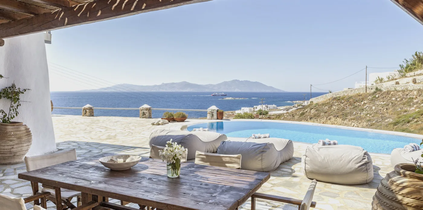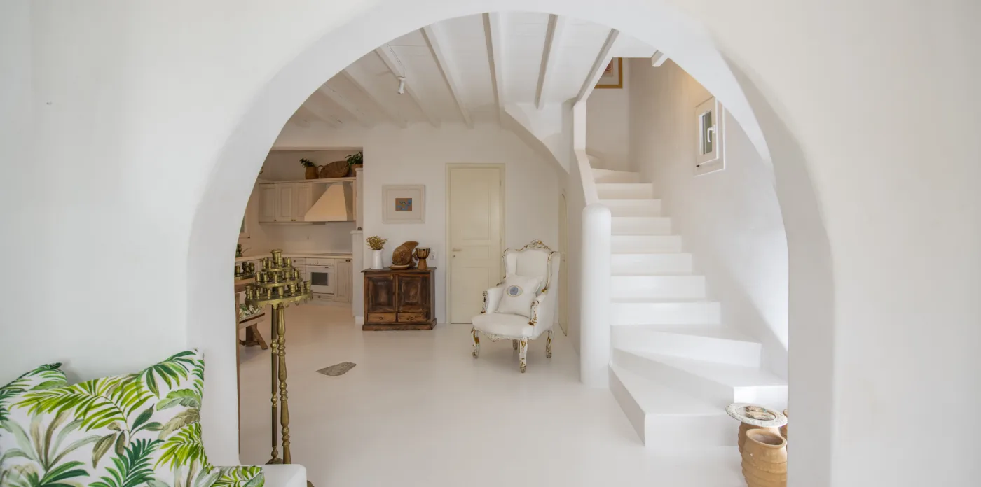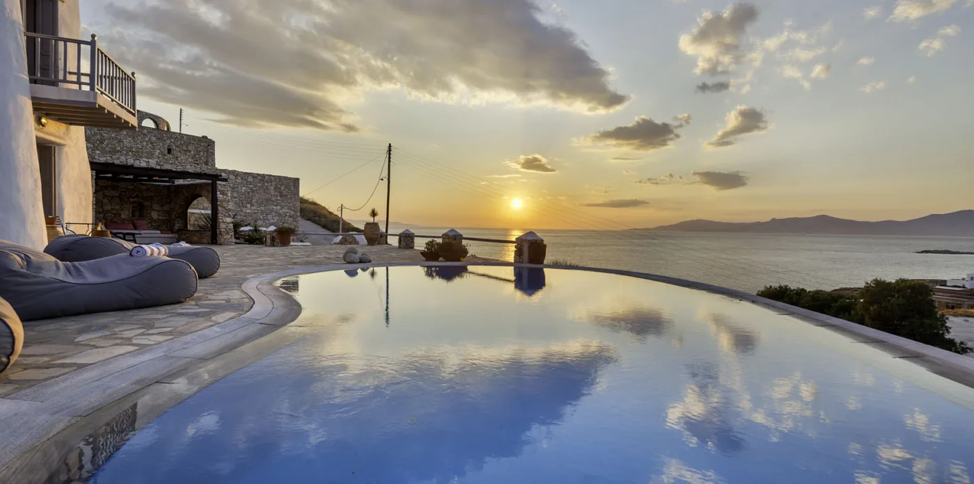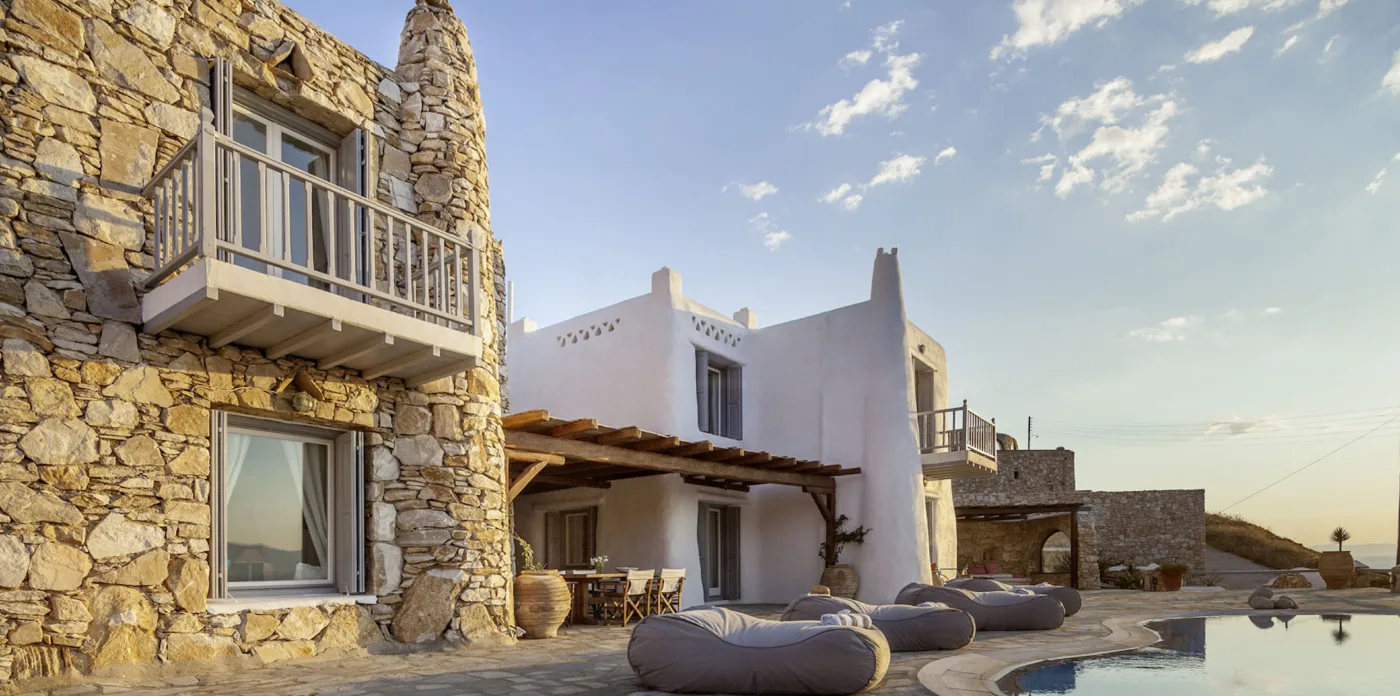 With sea and sunset views from every room, Mykonian Muse is comprised of two separate villas with unique architecture and a distinctive Mediterranean flair.
