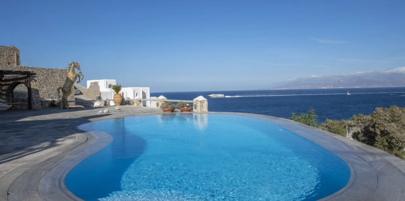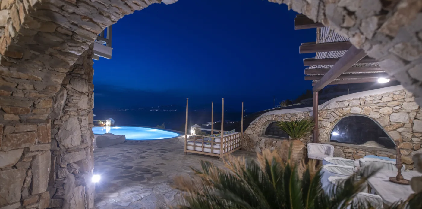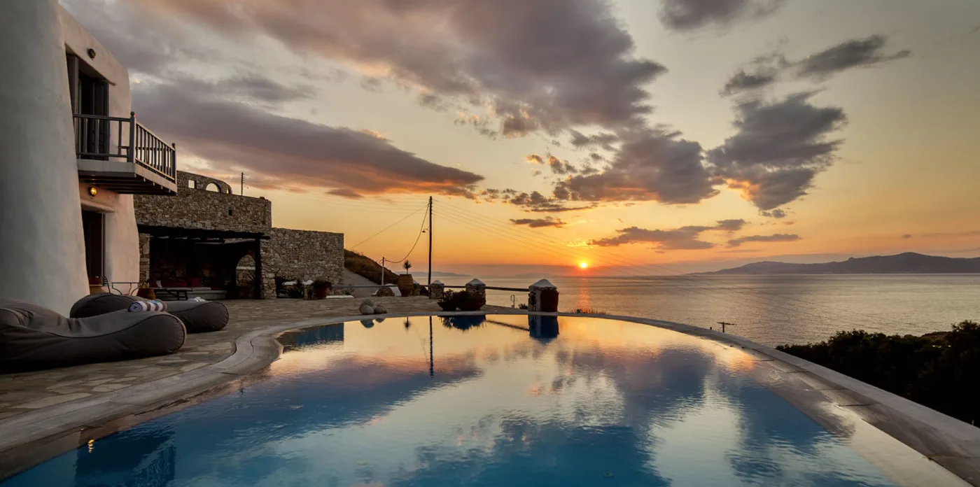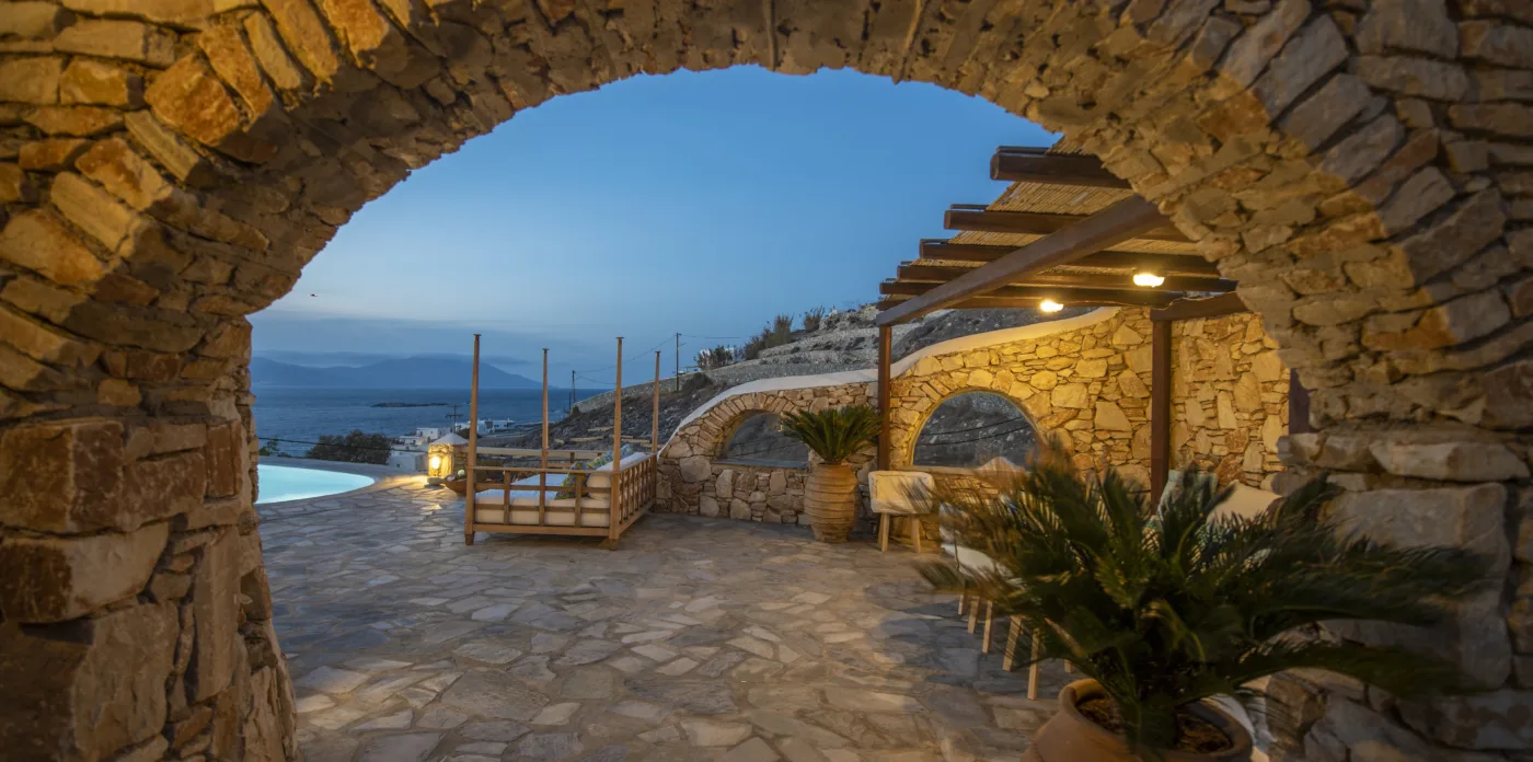 With sea and sunset views from every room, Mykonian Muse is comprised of two separate villas with unique architecture and a distinctive Mediterranean flair.