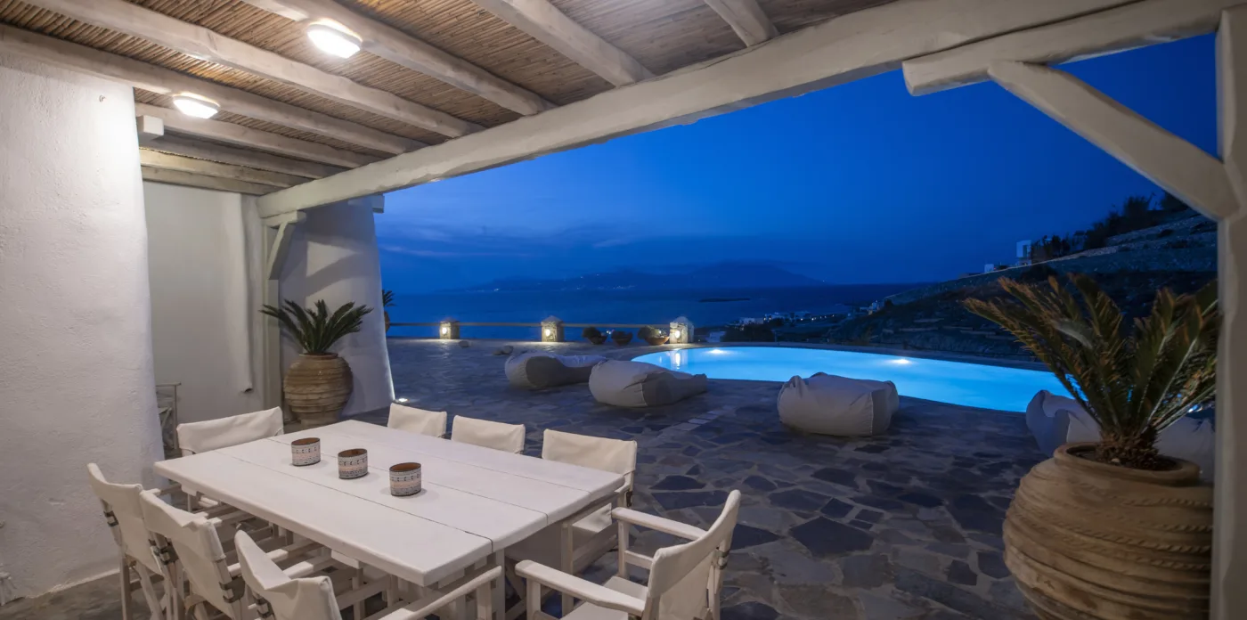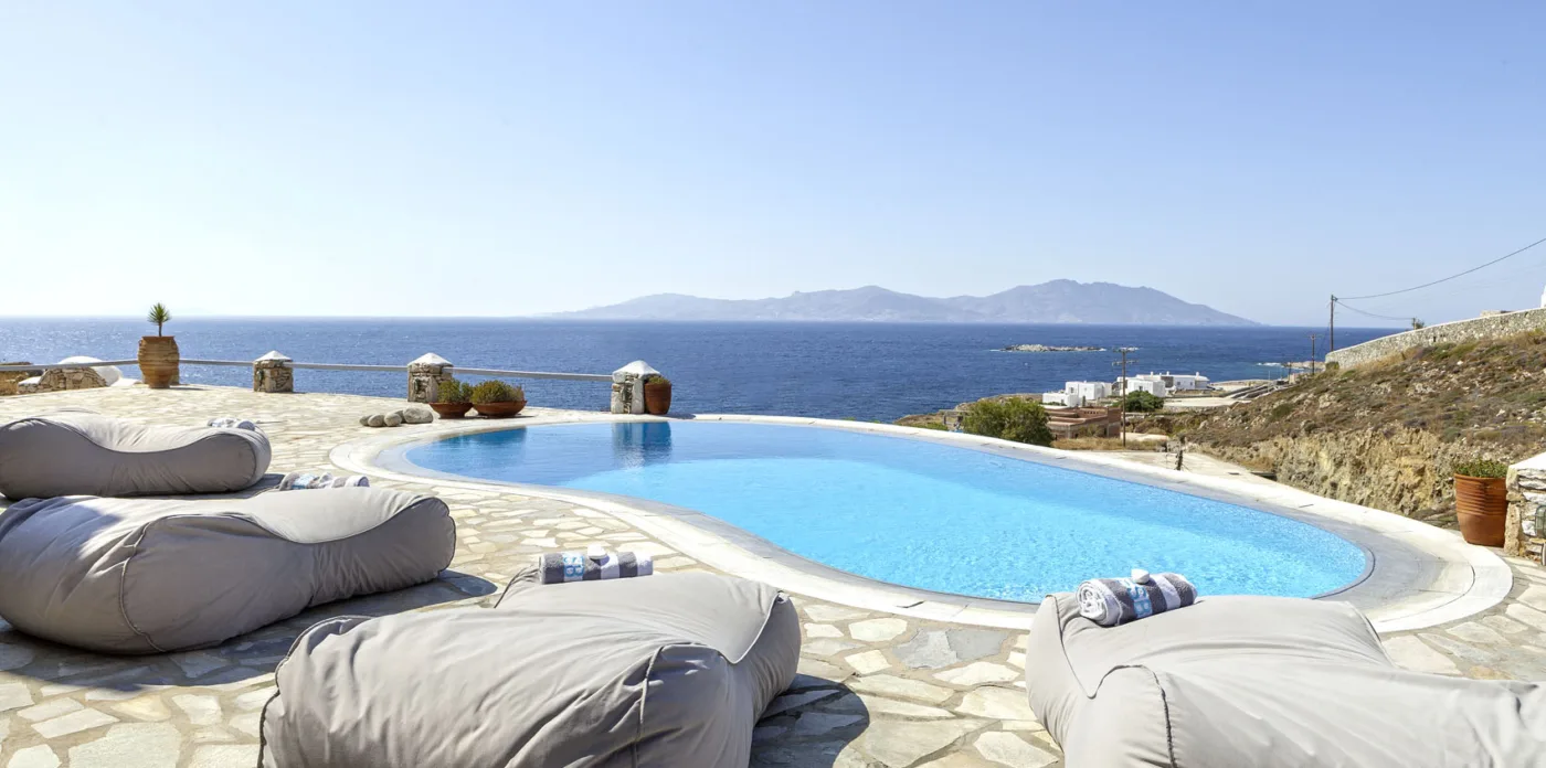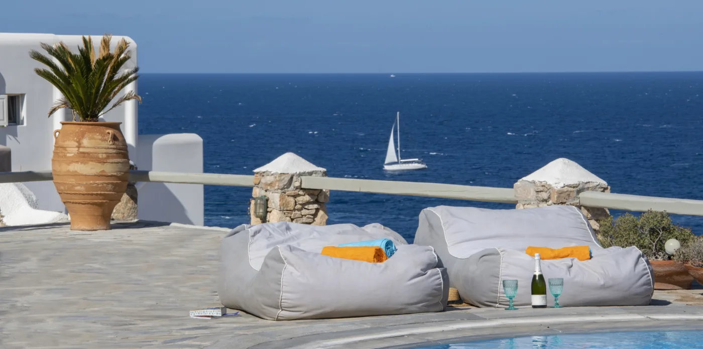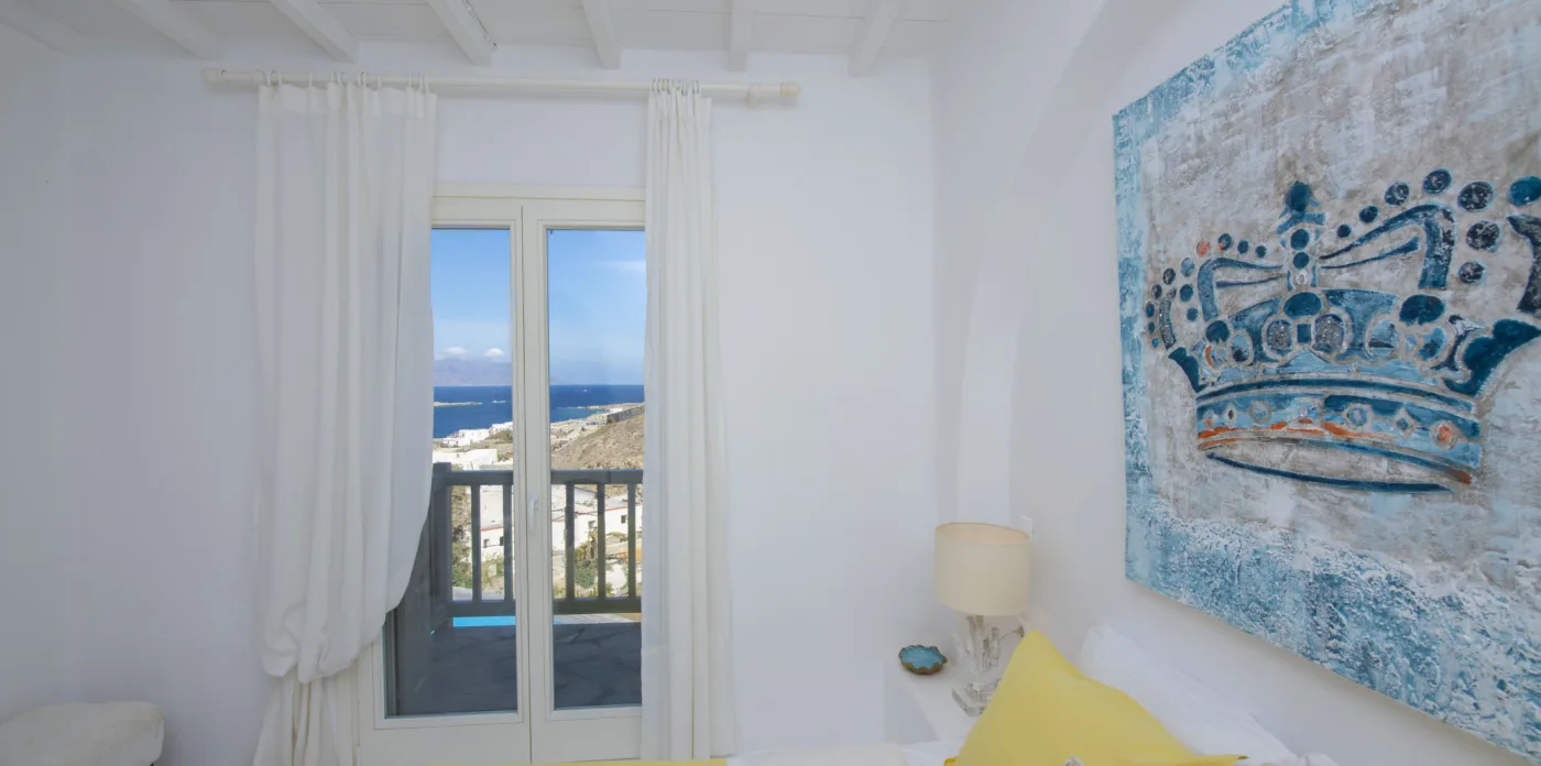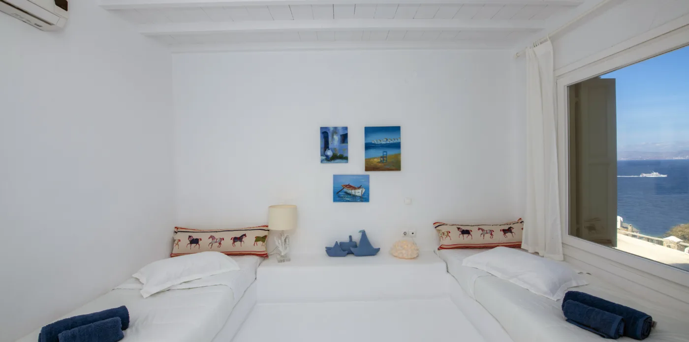 The owner’s suites on the first floor have captivating views and private balconies. All ensuite bedrooms have views over the pool and terrace, and out to the Aegean sea.