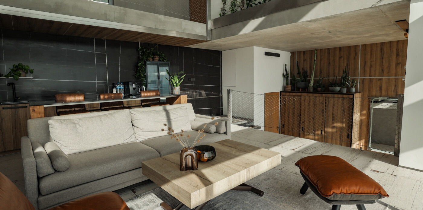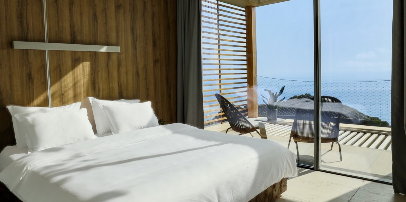 The core of the villa features a refined kitchen with wooden finishes, achieving a balance of warmth and modern design. On the upper level, two ensuite bedrooms each include private balconies facing the sea, providing a tranquil and well-appointed private space.